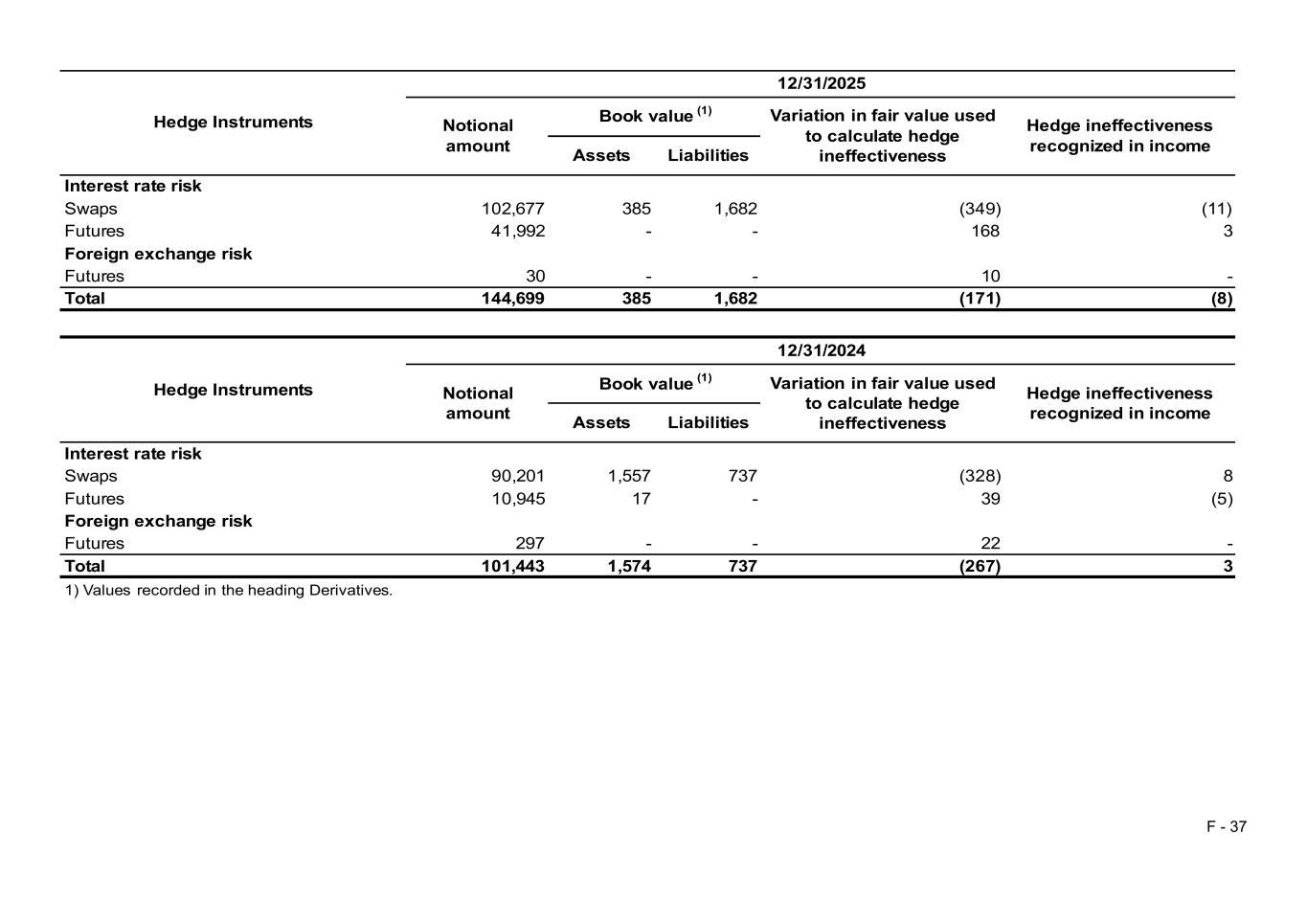 F - 37 Hedge Instruments 12/31/2025 Notional amount Book value (1) Variation in fair value used to calculate hedge ineffectiveness Hedge ineffectiveness recognized in income Assets Liabilities Interest rate risk Swaps 102,677 385 1,682 (349) (11) Futures 41,992 - - 168 3 Foreign exchange risk Futures 30 - - 10 - Total 144,699 385 1,682 (171) (8) Hedge Instruments 12/31/2024 Notional amount Book value (1) Variation in fair value used to calculate hedge ineffectiveness Hedge ineffectiveness recognized in income Assets Liabilities Interest rate risk Swaps 90,201 1,557 737 (328) 8 Futures 10,945 17 - 39 (5) Foreign exchange risk Futures 297 - - 22 - Total 101,443 1,574 737 (267) 3 1) Values recorded in the heading Derivatives.