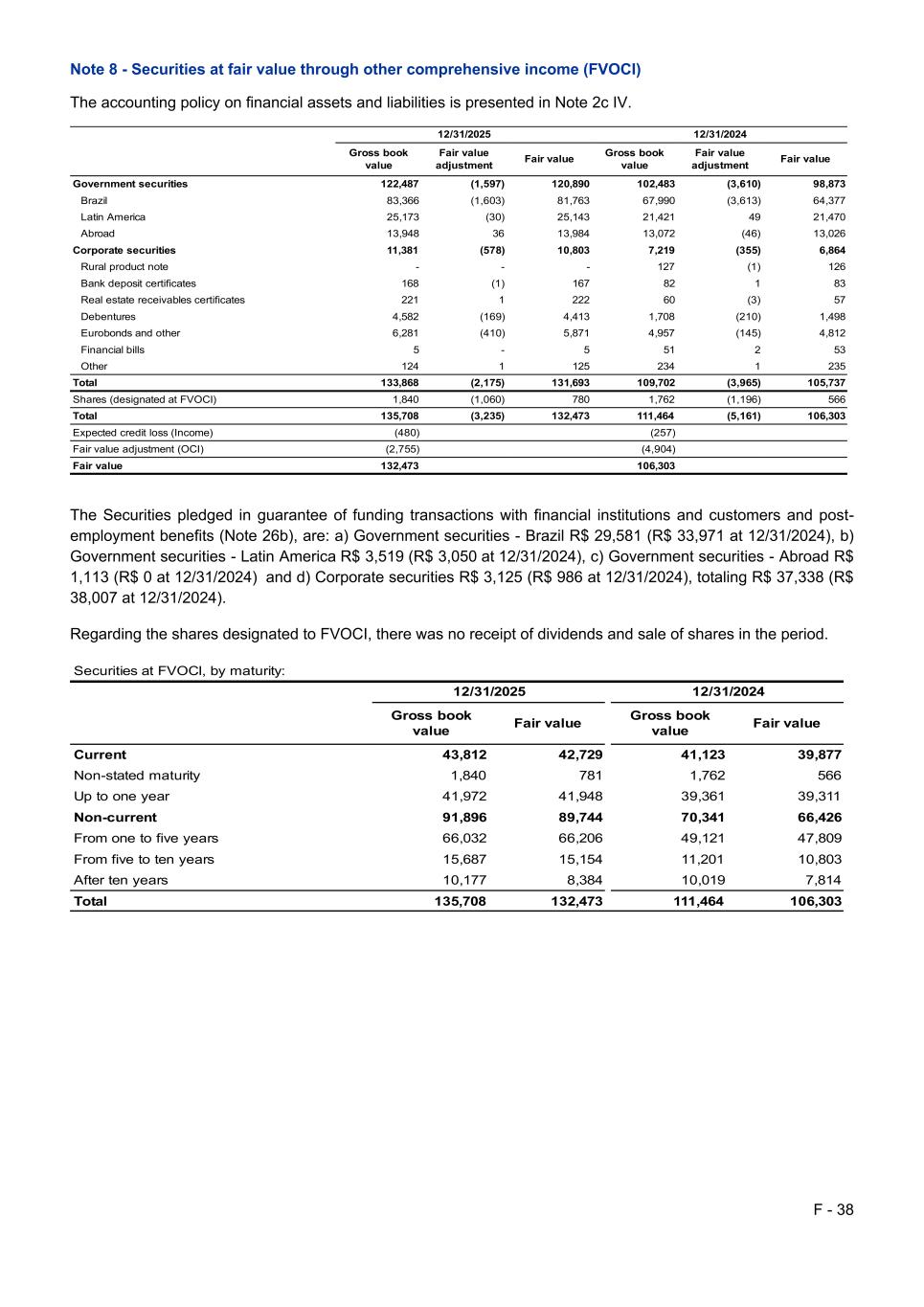 F - 38 Note 8 - Securities at fair value through other comprehensive income (FVOCI) The accounting policy on financial assets and liabilities is presented in Note 2c IV. 12/31/2025 12/31/2024 Gross book value Fair value adjustment Fair value Gross book value Fair value adjustment Fair value Government securities 122,487 (1,597) 120,890 102,483 (3,610) 98,873 Brazil 83,366 (1,603) 81,763 67,990 (3,613) 64,377 Latin America 25,173 (30) 25,143 21,421 49 21,470 Abroad 13,948 36 13,984 13,072 (46) 13,026 Corporate securities 11,381 (578) 10,803 7,219 (355) 6,864 Rural product note - - - 127 (1) 126 Bank deposit certificates 168 (1) 167 82 1 83 Real estate receivables certificates 221 1 222 60 (3) 57 Debentures 4,582 (169) 4,413 1,708 (210) 1,498 Eurobonds and other 6,281 (410) 5,871 4,957 (145) 4,812 Financial bills 5 - 5 51 2 53 Other 124 1 125 234 1 235 Total 133,868 (2,175) 131,693 109,702 (3,965) 105,737 Shares (designated at FVOCI) 1,840 (1,060) 780 1,762 (1,196) 566 Total 135,708 (3,235) 132,473 111,464 (5,161) 106,303 Expected credit loss (Income) (480) (257) Fair value adjustment (OCI) (2,755) (4,904) Fair value 132,473 106,303 The Securities pledged in guarantee of funding transactions with financial institutions and customers and post- employment benefits (Note 26b), are: a) Government securities - Brazil R$ 29,581 (R$ 33,971 at 12/31/2024), b) Government securities - Latin America R$ 3,519 (R$ 3,050 at 12/31/2024), c) Government securities - Abroad R$ 1,113 (R$ 0 at 12/31/2024) and d) Corporate securities R$ 3,125 (R$ 986 at 12/31/2024), totaling R$ 37,338 (R$ 38,007 at 12/31/2024). Regarding the shares designated to FVOCI, there was no receipt of dividends and sale of shares in the period. Securities at FVOCI, by maturity: 12/31/2025 12/31/2024 Gross book value Fair value Gross book value Fair value Current 43,812 42,729 41,123 39,877 Non-stated maturity 1,840 781 1,762 566 Up to one year 41,972 41,948 39,361 39,311 Non-current 91,896 89,744 70,341 66,426 From one to five years 66,032 66,206 49,121 47,809 From five to ten years 15,687 15,154 11,201 10,803 After ten years 10,177 8,384 10,019 7,814 Total 135,708 132,473 111,464 106,303
