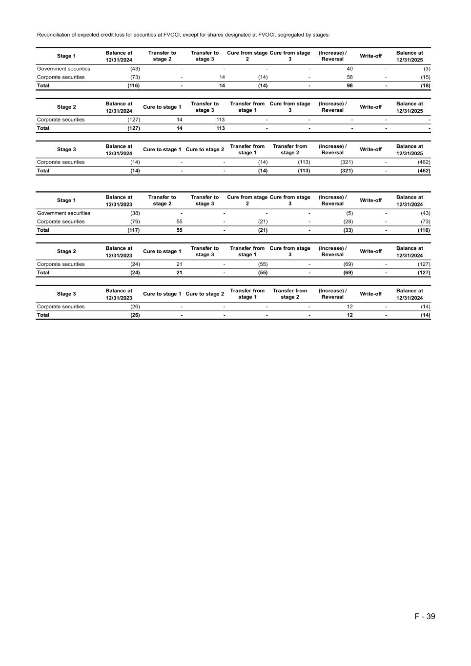 F - 39 Reconciliation of expected credit loss for securities at FVOCI, except for shares designated at FVOCI, segregated by stages: 01/01/2025 Stage 1 Balance at Transfer to stage 2 Transfer to stage 3 Cure from stage 2 Cure from stage 3 (Increase) / Reversal Write-off Balance at 12/31/2024 12/31/2025 Government securities (43) - - - - 40 - (3) Corporate securities (73) - 14 (14) - 58 - (15) Total (116) - 14 (14) - 98 - (18) Stage 2 Balance at Cure to stage 1 Transfer to stage 3 Transfer from stage 1 Cure from stage 3 (Increase) / Reversal Write-off Balance at 12/31/2024 12/31/2025 Corporate securities (127) 14 113 - - - - - Total (127) 14 113 - - - - - Stage 3 Balance at Cure to stage 1 Cure to stage 2 Transfer from stage 1 Transfer from stage 2 (Increase) / Reversal Write-off Balance at 12/31/2024 12/31/2025 Corporate securities (14) - - (14) (113) (321) - (462) Total (14) - - (14) (113) (321) - (462) 01/01/2024 Stage 1 Balance at Transfer to stage 2 Transfer to stage 3 Cure from stage 2 Cure from stage 3 (Increase) / Reversal Write-off Balance at 12/31/2023 12/31/2024 Government securities (38) - - - - (5) - (43) Corporate securities (79) 55 - (21) - (28) - (73) Total (117) 55 - (21) - (33) - (116) Stage 2 Balance at Cure to stage 1 Transfer to stage 3 Transfer from stage 1 Cure from stage 3 (Increase) / Reversal Write-off Balance at 12/31/2023 12/31/2024 Corporate securities (24) 21 - (55) - (69) - (127) Total (24) 21 - (55) - (69) - (127) Stage 3 Balance at Cure to stage 1 Cure to stage 2 Transfer from stage 1 Transfer from stage 2 (Increase) / Reversal Write-off Balance at 12/31/2023 12/31/2024 Corporate securities (26) - - - - 12 - (14) Total (26) - - - - 12 - (14)