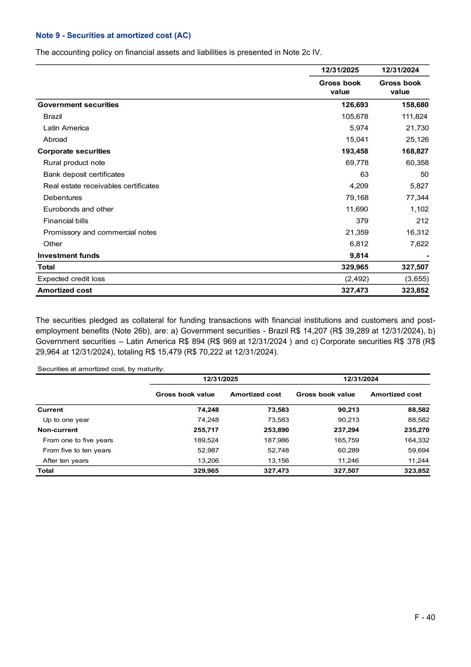 F - 40 Note 9 - Securities at amortized cost (AC) The accounting policy on financial assets and liabilities is presented in Note 2c IV. 12/31/2025 12/31/2024 Gross book value Gross book value Government securities 126,693 158,680 Brazil 105,678 111,824 Latin America 5,974 21,730 Abroad 15,041 25,126 Corporate securities 193,458 168,827 Rural product note 69,778 60,358 Bank deposit certificates 63 50 Real estate receivables certificates 4,209 5,827 Debentures 79,168 77,344 Eurobonds and other 11,690 1,102 Financial bills 379 212 Promissory and commercial notes 21,359 16,312 Other 6,812 7,622 Investment funds 9,814 - Total 329,965 327,507 Expected credit loss (2,492) (3,655) Amortized cost 327,473 323,852 The securities pledged as collateral for funding transactions with financial institutions and customers and post- employment benefits (Note 26b), are: a) Government securities - Brazil R$ 14,207 (R$ 39,289 at 12/31/2024), b) Government securities – Latin America R$ 894 (R$ 969 at 12/31/2024 ) and c) Corporate securities R$ 378 (R$ 29,964 at 12/31/2024), totaling R$ 15,479 (R$ 70,222 at 12/31/2024). Securities at amortized cost, by maturity: 12/31/2025 12/31/2024 Gross book value Amortized cost Gross book value Amortized cost Current 74,248 73,583 90,213 88,582 Up to one year 74,248 73,583 90,213 88,582 Non-current 255,717 253,890 237,294 235,270 From one to five years 189,524 187,986 165,759 164,332 From five to ten years 52,987 52,748 60,289 59,694 After ten years 13,206 13,156 11,246 11,244 Total 329,965 327,473 327,507 323,852