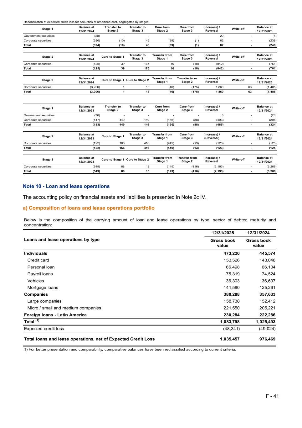 F - 41 Reconciliation of expected credit loss for securities at amortized cost, segregated by stages: Stage 1 Balance at Transfer to Stage 2 Transfer to Stage 3 Cure from Stage 2 Cure from Stage 3 (Increase) / Reversal Write-off Balance at 12/31/2024 12/31/2025 Government securities (28) - - - - 20 - (8) Corporate securities (296) (10) 46 (39) (1) 62 - (238) Total (324) (10) 46 (39) (1) 82 - (246) Stage 2 Balance at Cure to Stage 1 Transfer to Stage 3 Transfer from Stage 1 Cure from Stage 3 (Increase) / Reversal Write-off Balance at 12/31/2024 12/31/2025 Corporate securities (125) 39 175 10 (18) (842) - (761) Total (125) 39 175 10 (18) (842) - (761) Stage 3 Balance at Cure to Stage 1 Cure to Stage 2 Transfer from Stage 1 Transfer from Stage 2 (Increase) / Reversal Write-off Balance at 12/31/2024 12/31/2025 Corporate securities (3,206) 1 18 (46) (175) 1,860 63 (1,485) Total (3,206) 1 18 (46) (175) 1,860 63 (1,485) Stage 1 Balance at Transfer to Stage 2 Transfer to Stage 3 Cure from Stage 2 Cure from Stage 3 (Increase) / Reversal Write-off Balance at 12/31/2023 12/31/2024 Government securities (36) - - - - 8 - (28) Corporate securities (147) 449 149 (166) (88) (493) - (296) Total (183) 449 149 (166) (88) (485) - (324) 01/01/2024 Stage 2 Balance at Cure to Stage 1 Transfer to Stage 3 Transfer from Stage 1 Cure from Stage 3 (Increase) / (Reversal) Write-off Balance at 12/31/2023 12/31/2024 Corporate securities (122) 166 416 (449) (13) (123) - (125) Total (122) 166 416 (449) (13) (123) - (125) Stage 3 Balance at Cure to Stage 1 Cure to Stage 2 Transfer from Stage 1 Transfer from Stage 2 (Increase) / Reversal Write-off Balance at 12/31/2023 12/31/2024 Corporate securities (549) 88 13 (149) (416) (2,193) - (3,206) Total (549) 88 13 (149) (416) (2,193) - (3,206) Note 10 - Loan and lease operations The accounting policy on financial assets and liabilities is presented in Note 2c IV. a) Composition of loans and lease operations portfolio Below is the composition of the carrying amount of loan and lease operations by type, sector of debtor, maturity and concentration: Loans and lease operations by type 12/31/2025 12/31/2024 Gross book value Gross book value Individuals 473,226 445,574 Credit card 153,526 143,048 Personal loan 66,498 66,104 Payroll loans 75,319 74,524 Vehicles 36,303 36,637 Mortgage loans 141,580 125,261 Companies 380,288 357,633 Large companies 158,738 152,412 Micro / small and medium companies 221,550 205,221 Foreign loans - Latin America 230,284 222,286 Total (1) 1,083,798 1,025,493 Expected credit loss (48,341) (49,024) Total loans and lease operations, net of Expected Credit Loss 1,035,457 976,469 1) For better presentation and comparability, comparative balances have been reclassified according to current criteria.