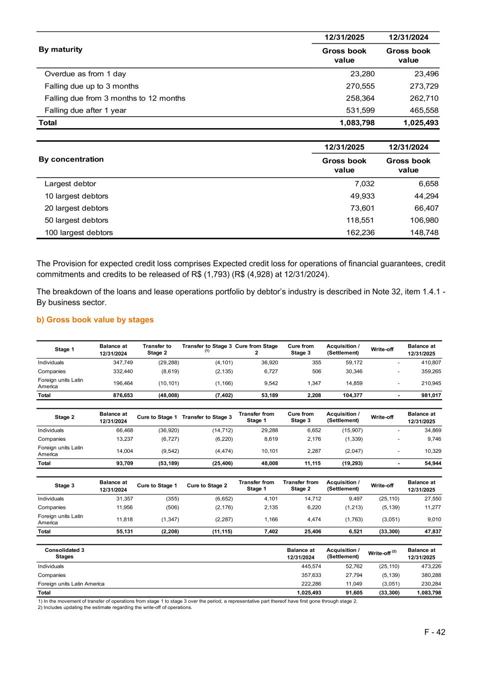 F - 42 By maturity 12/31/2025 12/31/2024 Gross book value Gross book value Overdue as from 1 day 23,280 23,496 Falling due up to 3 months 270,555 273,729 Falling due from 3 months to 12 months 258,364 262,710 Falling due after 1 year 531,599 465,558 Total 1,083,798 1,025,493 By concentration 12/31/2025 12/31/2024 Gross book value Gross book value Largest debtor 7,032 6,658 10 largest debtors 49,933 44,294 20 largest debtors 73,601 66,407 50 largest debtors 118,551 106,980 100 largest debtors 162,236 148,748 The Provision for expected credit loss comprises Expected credit loss for operations of financial guarantees, credit commitments and credits to be released of R$ (1,793) (R$ (4,928) at 12/31/2024). The breakdown of the loans and lease operations portfolio by debtor’s industry is described in Note 32, item 1.4.1 - By business sector. b) Gross book value by stages 01/01/2025 Stage 1 Balance at Transfer to Stage 2 Transfer to Stage 3 (1) Cure from Stage 2 Cure from Stage 3 Acquisition / (Settlement) Write-off Balance at 12/31/2024 12/31/2025 Individuals 347,749 (29,288) (4,101) 36,920 355 59,172 - 410,807 Companies 332,440 (8,619) (2,135) 6,727 506 30,346 - 359,265 Foreign units Latin America 196,464 (10,101) (1,166) 9,542 1,347 14,859 - 210,945 Total 876,653 (48,008) (7,402) 53,189 2,208 104,377 - 981,017 Stage 2 Balance at Cure to Stage 1 Transfer to Stage 3 Transfer from Stage 1 Cure from Stage 3 Acquisition / (Settlement) Write-off Balance at 12/31/2024 12/31/2025 Individuals 66,468 (36,920) (14,712) 29,288 6,652 (15,907) - 34,869 Companies 13,237 (6,727) (6,220) 8,619 2,176 (1,339) - 9,746 Foreign units Latin America 14,004 (9,542) (4,474) 10,101 2,287 (2,047) - 10,329 Total 93,709 (53,189) (25,406) 48,008 11,115 (19,293) - 54,944 Stage 3 Balance at Cure to Stage 1 Cure to Stage 2 Transfer from Stage 1 Transfer from Stage 2 Acquisition / (Settlement) Write-off Balance at 12/31/2024 12/31/2025 Individuals 31,357 (355) (6,652) 4,101 14,712 9,497 (25,110) 27,550 Companies 11,956 (506) (2,176) 2,135 6,220 (1,213) (5,139) 11,277 Foreign units Latin America 11,818 (1,347) (2,287) 1,166 4,474 (1,763) (3,051) 9,010 Total 55,131 (2,208) (11,115) 7,402 25,406 6,521 (33,300) 47,837 Consolidated 3 Stages Balance at Acquisition / (Settlement) Write-off (2) Balance at 12/31/2024 12/31/2025 Individuals 445,574 52,762 (25,110) 473,226 Companies 357,633 27,794 (5,139) 380,288 Foreign units Latin America 222,286 11,049 (3,051) 230,284 Total 1,025,493 91,605 (33,300) 1,083,798 1) In the movement of transfer of operations from stage 1 to stage 3 over the period, a representative part thereof have first gone through stage 2. 2) Includes updating the estimate regarding the write-off of operations.