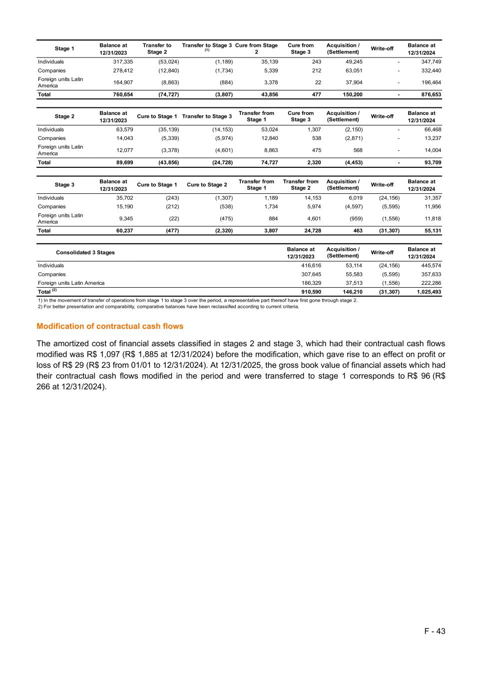 F - 43 01/01/2024 Stage 1 Balance at Transfer to Stage 2 Transfer to Stage 3 (1) Cure from Stage 2 Cure from Stage 3 Acquisition / (Settlement) Write-off Balance at 12/31/2023 12/31/2024 Individuals 317,335 (53,024) (1,189) 35,139 243 49,245 - 347,749 Companies 278,412 (12,840) (1,734) 5,339 212 63,051 - 332,440 Foreign units Latin America 164,907 (8,863) (884) 3,378 22 37,904 - 196,464 Total 760,654 (74,727) (3,807) 43,856 477 150,200 - 876,653 Stage 2 Balance at Cure to Stage 1 Transfer to Stage 3 Transfer from Stage 1 Cure from Stage 3 Acquisition / (Settlement) Write-off Balance at 12/31/2023 12/31/2024 Individuals 63,579 (35,139) (14,153) 53,024 1,307 (2,150) - 66,468 Companies 14,043 (5,339) (5,974) 12,840 538 (2,871) - 13,237 Foreign units Latin America 12,077 (3,378) (4,601) 8,863 475 568 - 14,004 Total 89,699 (43,856) (24,728) 74,727 2,320 (4,453) - 93,709 Stage 3 Balance at Cure to Stage 1 Cure to Stage 2 Transfer from Stage 1 Transfer from Stage 2 Acquisition / (Settlement) Write-off Balance at 12/31/2023 12/31/2024 Individuals 35,702 (243) (1,307) 1,189 14,153 6,019 (24,156) 31,357 Companies 15,190 (212) (538) 1,734 5,974 (4,597) (5,595) 11,956 Foreign units Latin America 9,345 (22) (475) 884 4,601 (959) (1,556) 11,818 Total 60,237 (477) (2,320) 3,807 24,728 463 (31,307) 55,131 Consolidated 3 Stages Balance at Acquisition / (Settlement) Write-off Balance at 12/31/2023 12/31/2024 Individuals 416,616 53,114 (24,156) 445,574 Companies 307,645 55,583 (5,595) 357,633 Foreign units Latin America 186,329 37,513 (1,556) 222,286 Total (2) 910,590 146,210 (31,307) 1,025,493 1) In the movement of transfer of operations from stage 1 to stage 3 over the period, a representative part thereof have first gone through stage 2. 2) For better presentation and comparability, comparative balances have been reclassified according to current criteria. Modification of contractual cash flows The amortized cost of financial assets classified in stages 2 and stage 3, which had their contractual cash flows modified was R$ 1,097 (R$ 1,885 at 12/31/2024) before the modification, which gave rise to an effect on profit or loss of R$ 29 (R$ 23 from 01/01 to 12/31/2024). At 12/31/2025, the gross book value of financial assets which had their contractual cash flows modified in the period and were transferred to stage 1 corresponds to R$ 96 (R$ 266 at 12/31/2024).