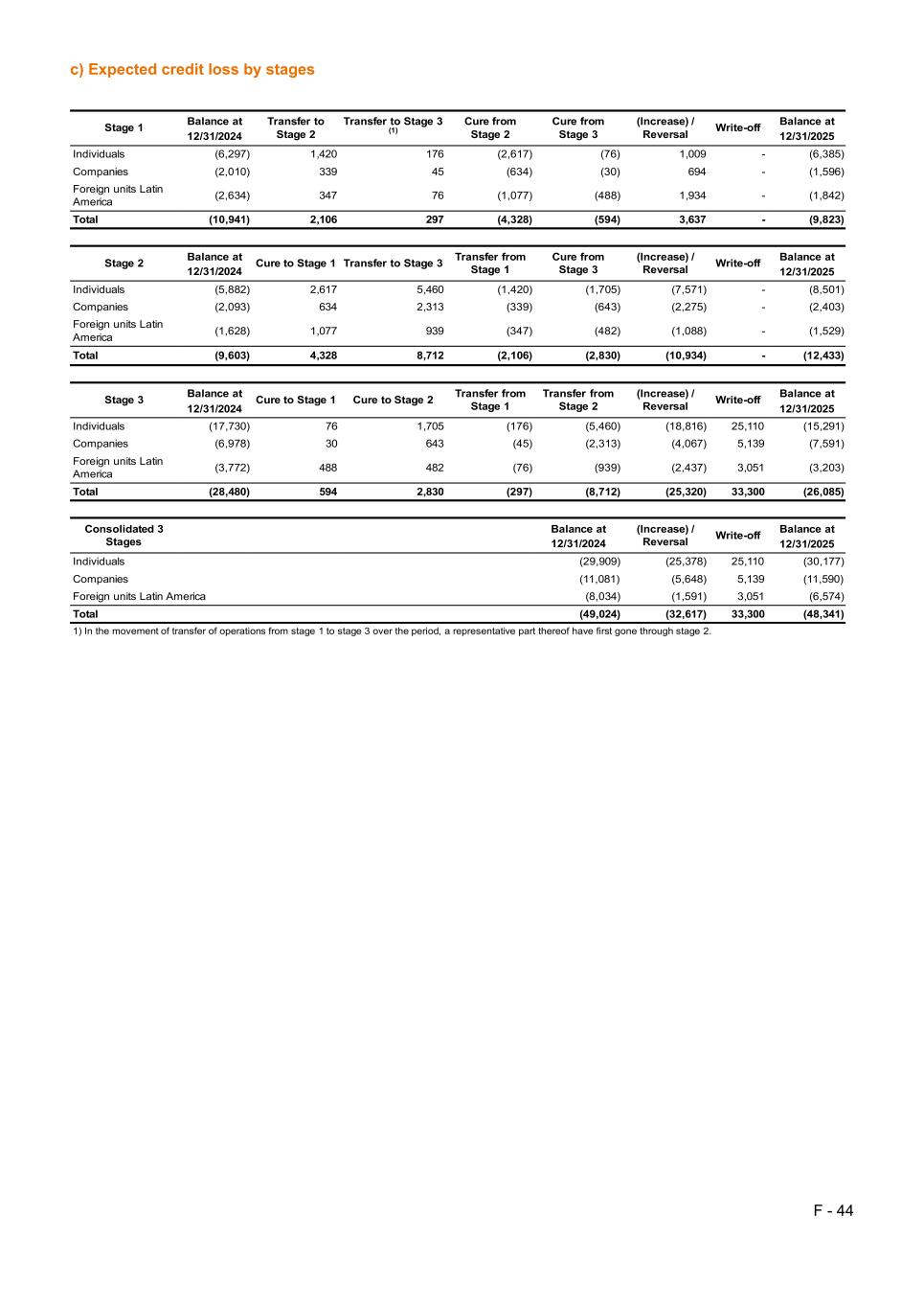 F - 44 c) Expected credit loss by stages 01/01/2025 Stage 1 Balance at Transfer to Stage 2 Transfer to Stage 3 (1) Cure from Stage 2 Cure from Stage 3 (Increase) / Reversal Write-off Balance at 12/31/2024 12/31/2025 Individuals (6,297) 1,420 176 (2,617) (76) 1,009 - (6,385) Companies (2,010) 339 45 (634) (30) 694 - (1,596) Foreign units Latin America (2,634) 347 76 (1,077) (488) 1,934 - (1,842) Total (10,941) 2,106 297 (4,328) (594) 3,637 - (9,823) Stage 2 Balance at Cure to Stage 1 Transfer to Stage 3 Transfer from Stage 1 Cure from Stage 3 (Increase) / Reversal Write-off Balance at 12/31/2024 12/31/2025 Individuals (5,882) 2,617 5,460 (1,420) (1,705) (7,571) - (8,501) Companies (2,093) 634 2,313 (339) (643) (2,275) - (2,403) Foreign units Latin America (1,628) 1,077 939 (347) (482) (1,088) - (1,529) Total (9,603) 4,328 8,712 (2,106) (2,830) (10,934) - (12,433) Stage 3 Balance at Cure to Stage 1 Cure to Stage 2 Transfer from Stage 1 Transfer from Stage 2 (Increase) / Reversal Write-off Balance at 12/31/2024 12/31/2025 Individuals (17,730) 76 1,705 (176) (5,460) (18,816) 25,110 (15,291) Companies (6,978) 30 643 (45) (2,313) (4,067) 5,139 (7,591) Foreign units Latin America (3,772) 488 482 (76) (939) (2,437) 3,051 (3,203) Total (28,480) 594 2,830 (297) (8,712) (25,320) 33,300 (26,085) Consolidated 3 Stages Balance at (Increase) / Reversal Write-off Balance at 12/31/2024 12/31/2025 Individuals (29,909) (25,378) 25,110 (30,177) Companies (11,081) (5,648) 5,139 (11,590) Foreign units Latin America (8,034) (1,591) 3,051 (6,574) Total (49,024) (32,617) 33,300 (48,341) 1) In the movement of transfer of operations from stage 1 to stage 3 over the period, a representative part thereof have first gone through stage 2.
