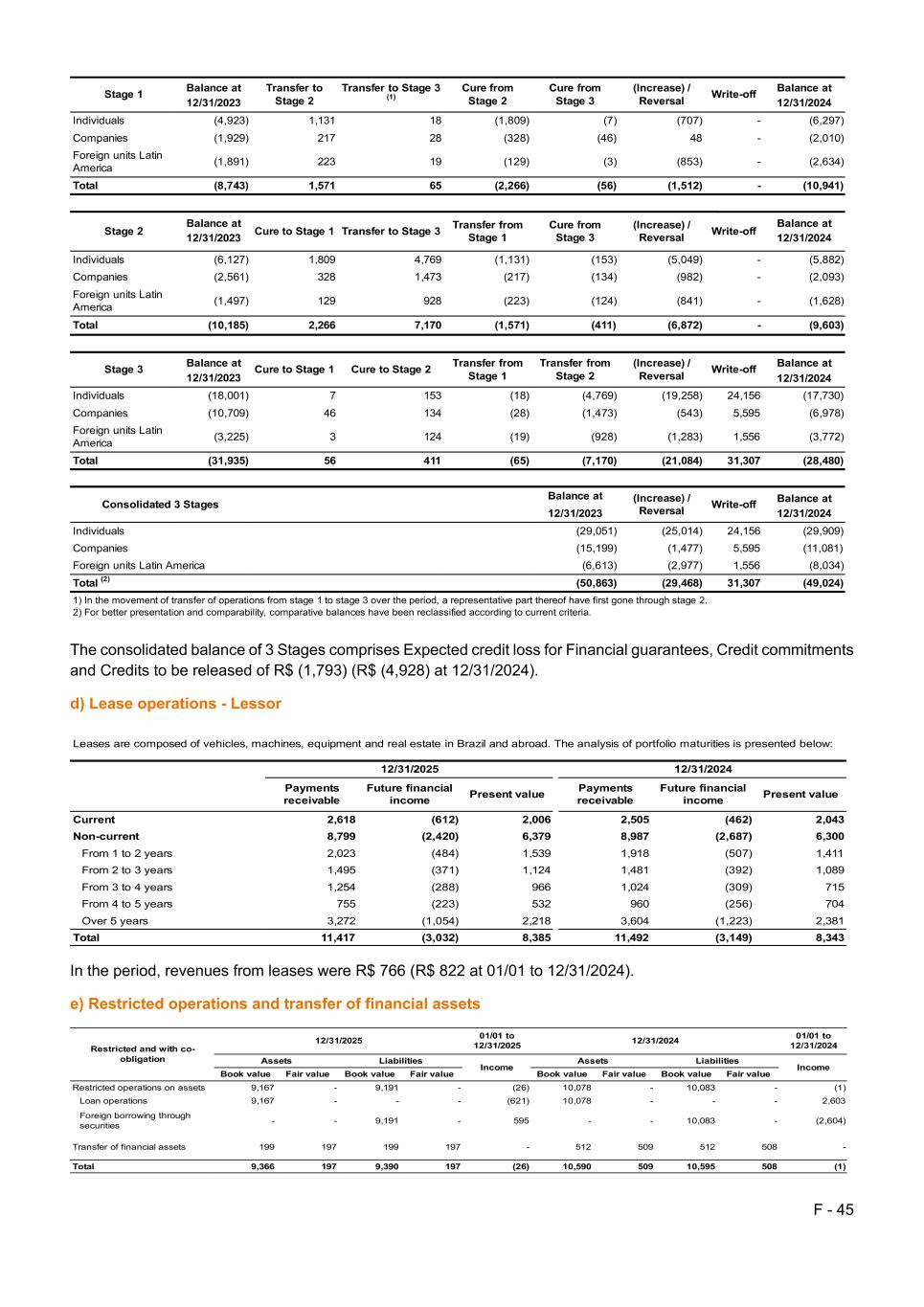 F - 45 01/01/2024 Stage 1 Balance at Transfer to Stage 2 Transfer to Stage 3 (1) Cure from Stage 2 Cure from Stage 3 (Increase) / Reversal Write-off Balance at 12/31/2023 12/31/2024 Individuals (4,923) 1,131 18 (1,809) (7) (707) - (6,297) Companies (1,929) 217 28 (328) (46) 48 - (2,010) Foreign units Latin America (1,891) 223 19 (129) (3) (853) - (2,634) Total (8,743) 1,571 65 (2,266) (56) (1,512) - (10,941) Stage 2 Balance at Cure to Stage 1 Transfer to Stage 3 Transfer from Stage 1 Cure from Stage 3 (Increase) / Reversal Write-off Balance at 12/31/2023 12/31/2024 Individuals (6,127) 1,809 4,769 (1,131) (153) (5,049) - (5,882) Companies (2,561) 328 1,473 (217) (134) (982) - (2,093) Foreign units Latin America (1,497) 129 928 (223) (124) (841) - (1,628) Total (10,185) 2,266 7,170 (1,571) (411) (6,872) - (9,603) Stage 3 Balance at Cure to Stage 1 Cure to Stage 2 Transfer from Stage 1 Transfer from Stage 2 (Increase) / Reversal Write-off Balance at 12/31/2023 12/31/2024 Individuals (18,001) 7 153 (18) (4,769) (19,258) 24,156 (17,730) Companies (10,709) 46 134 (28) (1,473) (543) 5,595 (6,978) Foreign units Latin America (3,225) 3 124 (19) (928) (1,283) 1,556 (3,772) Total (31,935) 56 411 (65) (7,170) (21,084) 31,307 (28,480) Consolidated 3 Stages Balance at (Increase) / Reversal Write-off Balance at 12/31/2023 12/31/2024 Individuals (29,051) (25,014) 24,156 (29,909) Companies (15,199) (1,477) 5,595 (11,081) Foreign units Latin America (6,613) (2,977) 1,556 (8,034) Total (2) (50,863) (29,468) 31,307 (49,024) 1) In the movement of transfer of operations from stage 1 to stage 3 over the period, a representative part thereof have first gone through stage 2. 2) For better presentation and comparability, comparative balances have been reclassified according to current criteria. The consolidated balance of 3 Stages comprises Expected credit loss for Financial guarantees, Credit commitments and Credits to be released of R$ (1,793) (R$ (4,928) at 12/31/2024). d) Lease operations - Lessor Leases are composed of vehicles, machines, equipment and real estate in Brazil and abroad. The analysis of portfolio maturities is presented below: 12/31/2025 12/31/2024 Payments receivable Future financial income Present value Payments receivable Future financial income Present value Current 2,618 (612) 2,006 2,505 (462) 2,043 Non-current 8,799 (2,420) 6,379 8,987 (2,687) 6,300 From 1 to 2 years 2,023 (484) 1,539 1,918 (507) 1,411 From 2 to 3 years 1,495 (371) 1,124 1,481 (392) 1,089 From 3 to 4 years 1,254 (288) 966 1,024 (309) 715 From 4 to 5 years 755 (223) 532 960 (256) 704 Over 5 years 3,272 (1,054) 2,218 3,604 (1,223) 2,381 Total 11,417 (3,032) 8,385 11,492 (3,149) 8,343 In the period, revenues from leases were R$ 766 (R$ 822 at 01/01 to 12/31/2024). e) Restricted operations and transfer of financial assets Restricted and with co- obligation 12/31/2025 01/01 to 12/31/2025 12/31/2024 01/01 to 12/31/2024 Assets Liabilities Income Assets Liabilities Income Book value Fair value Book value Fair value Book value Fair value Book value Fair value Restricted operations on assets 9,167 - 9,191 - (26) 10,078 - 10,083 - (1) Loan operations 9,167 - - - (621) 10,078 - - - 2,603 Foreign borrowing through securities - - 9,191 - 595 - - 10,083 - (2,604) Transfer of financial assets 199 197 199 197 - 512 509 512 508 - Total 9,366 197 9,390 197 (26) 10,590 509 10,595 508 (1)