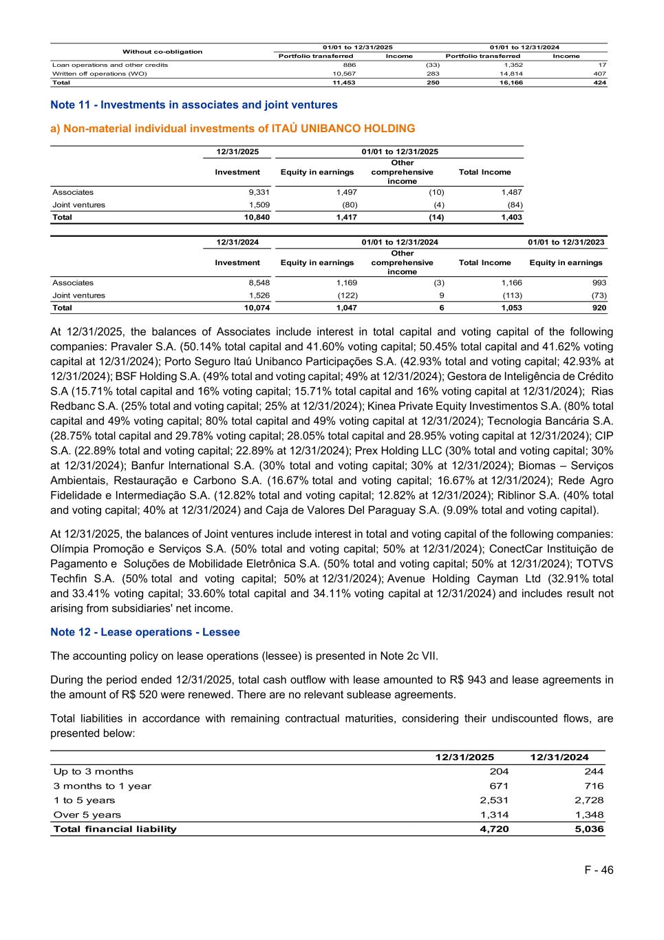 F - 46 Without co-obligation 01/01 to 12/31/2025 01/01 to 12/31/2024 Portfolio transferred Income Portfolio transferred Income Loan operations and other credits 886 (33) 1,352 17 Written off operations (WO) 10,567 283 14,814 407 Total 11,453 250 16,166 424 Note 11 - Investments in associates and joint ventures a) Non-material individual investments of ITAÚ UNIBANCO HOLDING 12/31/2025 01/01 to 12/31/2025 Investment Equity in earnings Other comprehensive income Total Income Associates 9,331 1,497 (10) 1,487 Joint ventures 1,509 (80) (4) (84) Total 10,840 1,417 (14) 1,403 12/31/2024 01/01 to 12/31/2024 01/01 to 12/31/2023 Investment Equity in earnings Other comprehensive income Total Income Equity in earnings Associates 8,548 1,169 (3) 1,166 993 Joint ventures 1,526 (122) 9 (113) (73) Total 10,074 1,047 6 1,053 920 At 12/31/2025, the balances of Associates include interest in total capital and voting capital of the following companies: Pravaler S.A. (50.14% total capital and 41.60% voting capital; 50.45% total capital and 41.62% voting capital at 12/31/2024); Porto Seguro ltaú Unibanco Participações S.A. (42.93% total and voting capital; 42.93% at 12/31/2024); BSF Holding S.A. (49% total and voting capital; 49% at 12/31/2024); Gestora de Inteligência de Crédito S.A (15.71% total capital and 16% voting capital; 15.71% total capital and 16% voting capital at 12/31/2024); Rias Redbanc S.A. (25% total and voting capital; 25% at 12/31/2024); Kinea Private Equity Investimentos S.A. (80% total capital and 49% voting capital; 80% total capital and 49% voting capital at 12/31/2024); Tecnologia Bancária S.A. (28.75% total capital and 29.78% voting capital; 28.05% total capital and 28.95% voting capital at 12/31/2024); CIP S.A. (22.89% total and voting capital; 22.89% at 12/31/2024); Prex Holding LLC (30% total and voting capital; 30% at 12/31/2024); Banfur lnternational S.A. (30% total and voting capital; 30% at 12/31/2024); Biomas – Serviços Ambientais, Restauração e Carbono S.A. (16.67% total and voting capital; 16.67% at 12/31/2024); Rede Agro Fidelidade e Intermediação S.A. (12.82% total and voting capital; 12.82% at 12/31/2024); Riblinor S.A. (40% total and voting capital; 40% at 12/31/2024) and Caja de Valores Del Paraguay S.A. (9.09% total and voting capital). At 12/31/2025, the balances of Joint ventures include interest in total and voting capital of the following companies: Olímpia Promoção e Serviços S.A. (50% total and voting capital; 50% at 12/31/2024); ConectCar Instituição de Pagamento e Soluções de Mobilidade Eletrônica S.A. (50% total and voting capital; 50% at 12/31/2024); TOTVS Techfin S.A. (50% total and voting capital; 50% at 12/31/2024); Avenue Holding Cayman Ltd (32.91% total and 33.41% voting capital; 33.60% total capital and 34.11% voting capital at 12/31/2024) and includes result not arising from subsidiaries' net income. Note 12 - Lease operations - Lessee The accounting policy on lease operations (lessee) is presented in Note 2c VII. During the period ended 12/31/2025, total cash outflow with lease amounted to R$ 943 and lease agreements in the amount of R$ 520 were renewed. There are no relevant sublease agreements. Total liabilities in accordance with remaining contractual maturities, considering their undiscounted flows, are presented below: 12/31/2025 12/31/2024 Up to 3 months 204 244 3 months to 1 year 671 716 1 to 5 years 2,531 2,728 Over 5 years 1,314 1,348 Total financial liability 4,720 5,036