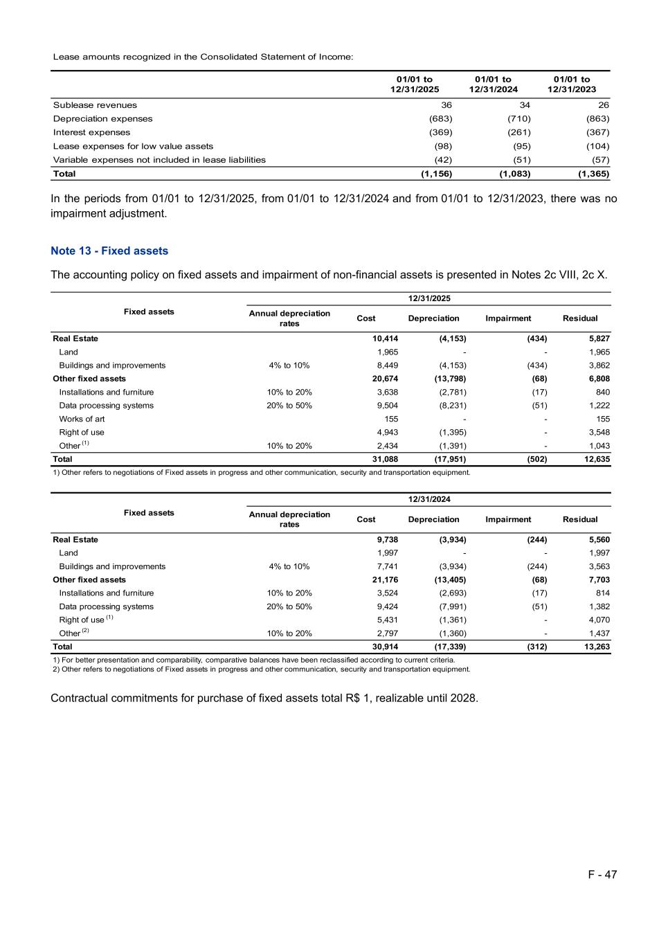 F - 47 Lease amounts recognized in the Consolidated Statement of Income: 01/01 to 12/31/2025 01/01 to 12/31/2024 01/01 to 12/31/2023 Sublease revenues 36 34 26 Depreciation expenses (683) (710) (863) Interest expenses (369) (261) (367) Lease expenses for low value assets (98) (95) (104) Variable expenses not included in lease liabilities (42) (51) (57) Total (1,156) (1,083) (1,365) In the periods from 01/01 to 12/31/2025, from 01/01 to 12/31/2024 and from 01/01 to 12/31/2023, there was no impairment adjustment. Note 13 - Fixed assets The accounting policy on fixed assets and impairment of non-financial assets is presented in Notes 2c VIII, 2c X. Fixed assets 12/31/2025 Annual depreciation rates Cost Depreciation Impairment Residual Real Estate 10,414 (4,153) (434) 5,827 Land 1,965 - - 1,965 Buildings and improvements 4% to 10% 8,449 (4,153) (434) 3,862 Other fixed assets 20,674 (13,798) (68) 6,808 Installations and furniture 10% to 20% 3,638 (2,781) (17) 840 Data processing systems 20% to 50% 9,504 (8,231) (51) 1,222 Works of art 155 - - 155 Right of use 4,943 (1,395) - 3,548 Other (1) 10% to 20% 2,434 (1,391) - 1,043 Total 31,088 (17,951) (502) 12,635 1) Other refers to negotiations of Fixed assets in progress and other communication, security and transportation equipment. Fixed assets 12/31/2024 Annual depreciation rates Cost Depreciation Impairment Residual Real Estate 9,738 (3,934) (244) 5,560 Land 1,997 - - 1,997 Buildings and improvements 4% to 10% 7,741 (3,934) (244) 3,563 Other fixed assets 21,176 (13,405) (68) 7,703 Installations and furniture 10% to 20% 3,524 (2,693) (17) 814 Data processing systems 20% to 50% 9,424 (7,991) (51) 1,382 Right of use (1) 5,431 (1,361) - 4,070 Other (2) 10% to 20% 2,797 (1,360) - 1,437 Total 30,914 (17,339) (312) 13,263 1) For better presentation and comparability, comparative balances have been reclassified according to current criteria. 2) Other refers to negotiations of Fixed assets in progress and other communication, security and transportation equipment. Contractual commitments for purchase of fixed assets total R$ 1, realizable until 2028.