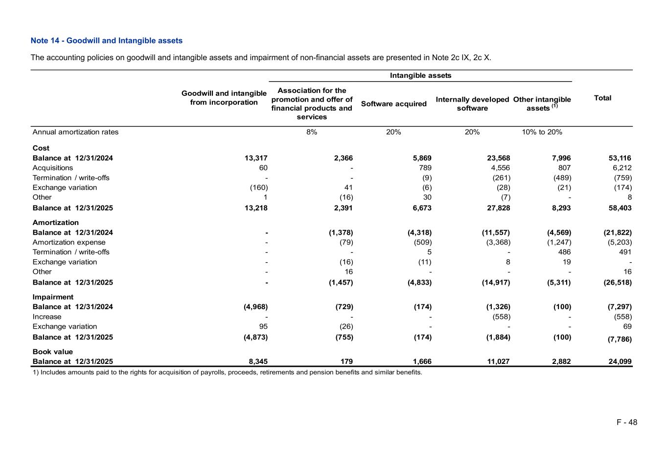 F - 48 Note 14 - Goodwill and Intangible assets The accounting policies on goodwill and intangible assets and impairment of non-financial assets are presented in Note 2c IX, 2c X. Goodwill and intangible from incorporation Intangible assets Total Association for the promotion and offer of financial products and services Software acquired Internally developed software Other intangible assets (1) Annual amortization rates 8% 20% 20% 10% to 20% Cost Balance at 12/31/2024 13,317 2,366 5,869 23,568 7,996 53,116 Acquisitions 60 - 789 4,556 807 6,212 Termination / write-offs - - (9) (261) (489) (759) Exchange variation (160) 41 (6) (28) (21) (174) Other 1 (16) 30 (7) - 8 Balance at 12/31/2025 13,218 2,391 6,673 27,828 8,293 58,403 Amortization Balance at 12/31/2024 - (1,378) (4,318) (11,557) (4,569) (21,822) Amortization expense - (79) (509) (3,368) (1,247) (5,203) Termination / write-offs - - 5 - 486 491 Exchange variation - (16) (11) 8 19 - Other - 16 - - - 16 Balance at 12/31/2025 - (1,457) (4,833) (14,917) (5,311) (26,518) Impairment Balance at 12/31/2024 (4,968) (729) (174) (1,326) (100) (7,297) Increase - - - (558) - (558) Exchange variation 95 (26) - - - 69 Balance at 12/31/2025 (4,873) (755) (174) (1,884) (100) (7,786) Book value Balance at 12/31/2025 8,345 179 1,666 11,027 2,882 24,099 1) Includes amounts paid to the rights for acquisition of payrolls, proceeds, retirements and pension benefits and similar benefits.