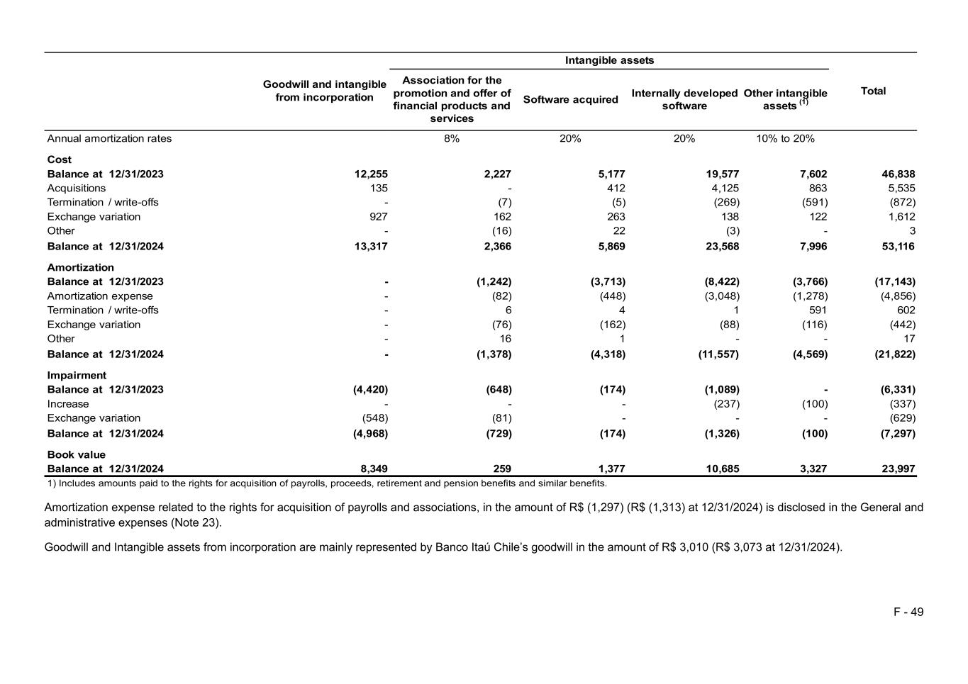 F - 49 Goodwill and intangible from incorporation Intangible assets Total 31/12/2024 Association for the promotion and offer of financial products and services Software acquired Internally developed software Other intangible assets (1) Annual amortization rates 8% 20% 20% 10% to 20% Cost 01/01/2024 Balance at 12/31/2023 12,255 2,227 5,177 19,577 7,602 46,838 Acquisitions 135 - 412 4,125 863 5,535 Termination / write-offs - (7) (5) (269) (591) (872) Exchange variation 927 162 263 138 122 1,612 Other - (16) 22 (3) - 3 Balance at 12/31/2024 13,317 2,366 5,869 23,568 7,996 53,116 Amortization Balance at 12/31/2023 - (1,242) (3,713) (8,422) (3,766) (17,143) Amortization expense - (82) (448) (3,048) (1,278) (4,856) Termination / write-offs - 6 4 1 591 602 Exchange variation - (76) (162) (88) (116) (442) Other - 16 1 - - 17 Balance at 12/31/2024 - (1,378) (4,318) (11,557) (4,569) (21,822) Impairment Balance at 12/31/2023 (4,420) (648) (174) (1,089) - (6,331) Increase - - - (237) (100) (337) Exchange variation (548) (81) - - - (629) Balance at 12/31/2024 (4,968) (729) (174) (1,326) (100) (7,297) Book value Balance at 12/31/2024 8,349 259 1,377 10,685 3,327 23,997 1) Includes amounts paid to the rights for acquisition of payrolls, proceeds, retirement and pension benefits and similar benefits. Amortization expense related to the rights for acquisition of payrolls and associations, in the amount of R$ (1,297) (R$ (1,313) at 12/31/2024) is disclosed in the General and administrative expenses (Note 23). Goodwill and Intangible assets from incorporation are mainly represented by Banco Itaú Chile’s goodwill in the amount of R$ 3,010 (R$ 3,073 at 12/31/2024).