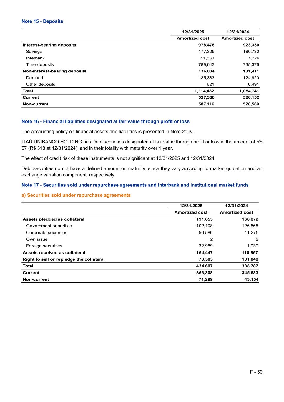 F - 50 Note 15 - Deposits 12/31/2025 12/31/2024 Amortized cost Amortized cost Interest-bearing deposits 978,478 923,330 Savings 177,305 180,730 Interbank 11,530 7,224 Time deposits 789,643 735,376 Non-interest-bearing deposits 136,004 131,411 Demand 135,383 124,920 Other deposits 621 6,491 Total 1,114,482 1,054,741 Current 527,366 526,152 Non-current 587,116 528,589 Note 16 - Financial liabilities designated at fair value through profit or loss The accounting policy on financial assets and liabilities is presented in Note 2c IV. ITAÚ UNIBANCO HOLDING has Debt securities designated at fair value through profit or loss in the amount of R$ 57 (R$ 318 at 12/31/2024), and in their totality with maturity over 1 year. The effect of credit risk of these instruments is not significant at 12/31/2025 and 12/31/2024. Debt securities do not have a defined amount on maturity, since they vary according to market quotation and an exchange variation component, respectively. Note 17 - Securities sold under repurchase agreements and interbank and institutional market funds a) Securities sold under repurchase agreements 12/31/2025 12/31/2024 Amortized cost Amortized cost Assets pledged as collateral 191,655 168,872 Government securities 102,108 126,565 Corporate securities 56,586 41,275 Own issue 2 2 Foreign securities 32,959 1,030 Assets received as collateral 164,447 118,867 Right to sell or repledge the collateral 78,505 101,048 Total 434,607 388,787 Current 363,308 345,633 Non-current 71,299 43,154