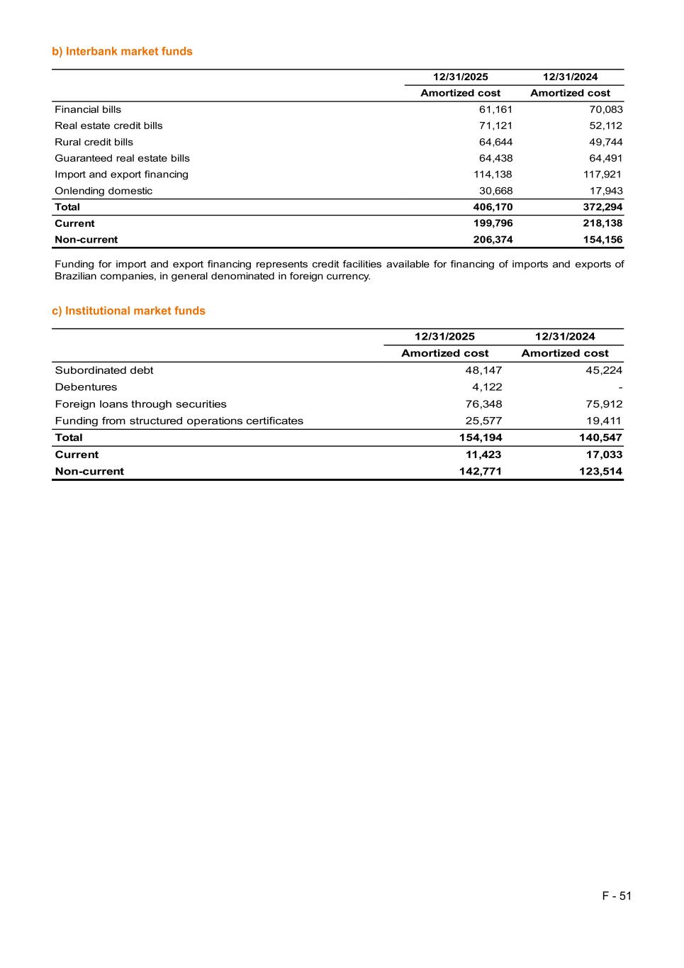 F - 51 b) Interbank market funds 12/31/2025 12/31/2024 Amortized cost Amortized cost Financial bills 61,161 70,083 Real estate credit bills 71,121 52,112 Rural credit bills 64,644 49,744 Guaranteed real estate bills 64,438 64,491 Import and export financing 114,138 117,921 Onlending domestic 30,668 17,943 Total 406,170 372,294 Current 199,796 218,138 Non-current 206,374 154,156 Funding for import and export financing represents credit facilities available for financing of imports and exports of Brazilian companies, in general denominated in foreign currency. c) Institutional market funds 12/31/2025 12/31/2024 Amortized cost Amortized cost Subordinated debt 48,147 45,224 Debentures 4,122 - Foreign loans through securities 76,348 75,912 Funding from structured operations certificates 25,577 19,411 Total 154,194 140,547 Current 11,423 17,033 Non-current 142,771 123,514