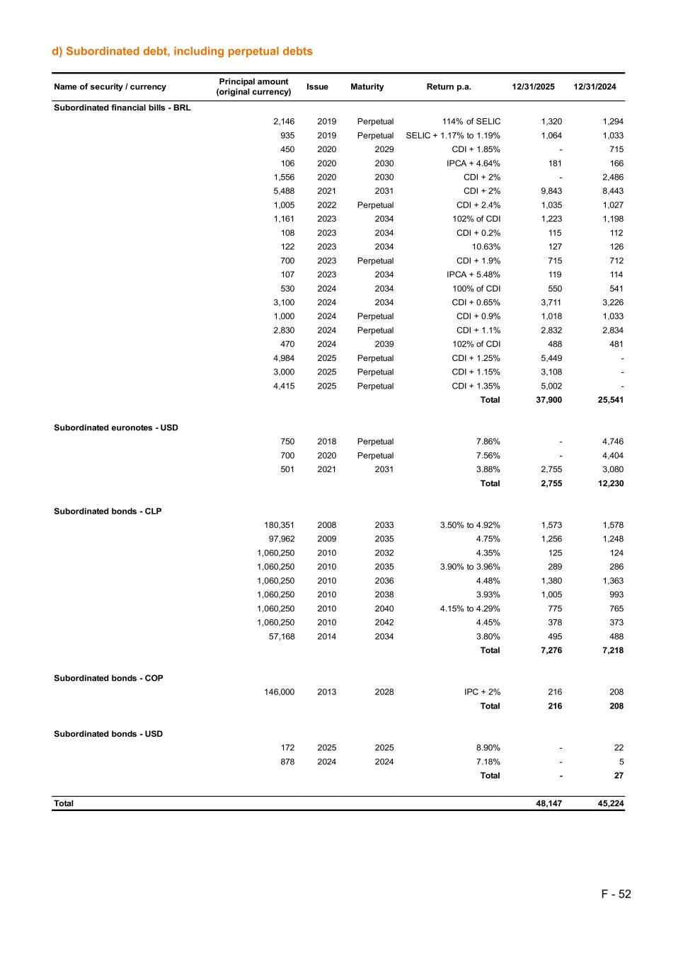 F - 52 d) Subordinated debt, including perpetual debts Name of security / currency Principal amount (original currency) Issue Maturity Return p.a. 12/31/2025 12/31/2024 Subordinated financial bills - BRL 2,146 2019 Perpetual 114% of SELIC 1,320 1,294 935 2019 Perpetual SELIC + 1.17% to 1.19% 1,064 1,033 450 2020 2029 CDI + 1.85% - 715 106 2020 2030 IPCA + 4.64% 181 166 1,556 2020 2030 CDI + 2% - 2,486 5,488 2021 2031 CDI + 2% 9,843 8,443 1,005 2022 Perpetual CDI + 2.4% 1,035 1,027 1,161 2023 2034 102% of CDI 1,223 1,198 108 2023 2034 CDI + 0.2% 115 112 122 2023 2034 10.63% 127 126 700 2023 Perpetual CDI + 1.9% 715 712 107 2023 2034 IPCA + 5.48% 119 114 530 2024 2034 100% of CDI 550 541 3,100 2024 2034 CDI + 0.65% 3,711 3,226 1,000 2024 Perpetual CDI + 0.9% 1,018 1,033 2,830 2024 Perpetual CDI + 1.1% 2,832 2,834 470 2024 2039 102% of CDI 488 481 4,984 2025 Perpetual CDI + 1.25% 5,449 - 3,000 2025 Perpetual CDI + 1.15% 3,108 - 4,415 2025 Perpetual CDI + 1.35% 5,002 - Total 37,900 25,541 Subordinated euronotes - USD 750 2018 Perpetual 7.86% - 4,746 700 2020 Perpetual 7.56% - 4,404 501 2021 2031 3.88% 2,755 3,080 Total 2,755 12,230 Subordinated bonds - CLP 180,351 2008 2033 3.50% to 4.92% 1,573 1,578 97,962 2009 2035 4.75% 1,256 1,248 1,060,250 2010 2032 4.35% 125 124 1,060,250 2010 2035 3.90% to 3.96% 289 286 1,060,250 2010 2036 4.48% 1,380 1,363 1,060,250 2010 2038 3.93% 1,005 993 1,060,250 2010 2040 4.15% to 4.29% 775 765 1,060,250 2010 2042 4.45% 378 373 57,168 2014 2034 3.80% 495 488 Total 7,276 7,218 Subordinated bonds - COP 146,000 2013 2028 IPC + 2% 216 208 Total 216 208 Subordinated bonds - USD 172 2025 2025 8.90% - 22 878 2024 2024 7.18% - 5 Total - 27 Total 48,147 45,224