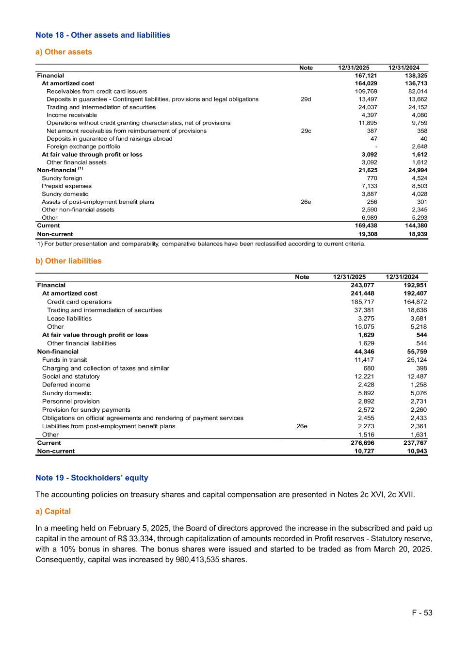 F - 53 Note 18 - Other assets and liabilities a) Other assets Note 12/31/2025 12/31/2024 Financial 167,121 138,325 At amortized cost 164,029 136,713 Receivables from credit card issuers 109,769 82,014 Deposits in guarantee - Contingent liabilities, provisions and legal obligations 29d 13,497 13,662 Trading and intermediation of securities 24,037 24,152 Income receivable 4,397 4,080 Operations without credit granting characteristics, net of provisions 11,895 9,759 Net amount receivables from reimbursement of provisions 29c 387 358 Deposits in guarantee of fund raisings abroad 47 40 Foreign exchange portfolio - 2,648 At fair value through profit or loss 3,092 1,612 Other financial assets 3,092 1,612 Non-financial (1) 21,625 24,994 Sundry foreign 770 4,524 Prepaid expenses 7,133 8,503 Sundry domestic 3,887 4,028 Assets of post-employment benefit plans 26e 256 301 Other non-financial assets 2,590 2,345 Other 6,989 5,293 Current 169,438 144,380 Non-current 19,308 18,939 1) For better presentation and comparability, comparative balances have been reclassified according to current criteria. b) Other liabilities Note 12/31/2025 12/31/2024 Financial 243,077 192,951 At amortized cost 241,448 192,407 Credit card operations 185,717 164,872 Trading and intermediation of securities 37,381 18,636 Lease liabilities 3,275 3,681 Other 15,075 5,218 At fair value through profit or loss 1,629 544 Other financial liabilities 1,629 544 Non-financial 44,346 55,759 Funds in transit 11,417 25,124 Charging and collection of taxes and similar 680 398 Social and statutory 12,221 12,487 Deferred income 2,428 1,258 Sundry domestic 5,892 5,076 Personnel provision 2,892 2,731 Provision for sundry payments 2,572 2,260 Obligations on official agreements and rendering of payment services 2,455 2,433 Liabilities from post-employment benefit plans 26e 2,273 2,361 Other 1,516 1,631 Current 276,696 237,767 Non-current 10,727 10,943 Note 19 - Stockholders’ equity The accounting policies on treasury shares and capital compensation are presented in Notes 2c XVI, 2c XVII. a) Capital In a meeting held on February 5, 2025, the Board of directors approved the increase in the subscribed and paid up capital in the amount of R$ 33,334, through capitalization of amounts recorded in Profit reserves - Statutory reserve, with a 10% bonus in shares. The bonus shares were issued and started to be traded as from March 20, 2025. Consequently, capital was increased by 980,413,535 shares.