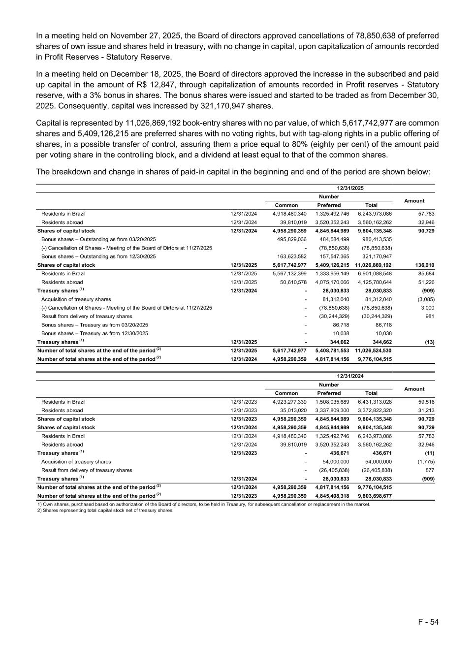 F - 54 In a meeting held on November 27, 2025, the Board of directors approved cancellations of 78,850,638 of preferred shares of own issue and shares held in treasury, with no change in capital, upon capitalization of amounts recorded in Profit Reserves - Statutory Reserve. In a meeting held on December 18, 2025, the Board of directors approved the increase in the subscribed and paid up capital in the amount of R$ 12,847, through capitalization of amounts recorded in Profit reserves - Statutory reserve, with a 3% bonus in shares. The bonus shares were issued and started to be traded as from December 30, 2025. Consequently, capital was increased by 321,170,947 shares. Capital is represented by 11,026,869,192 book-entry shares with no par value, of which 5,617,742,977 are common shares and 5,409,126,215 are preferred shares with no voting rights, but with tag-along rights in a public offering of shares, in a possible transfer of control, assuring them a price equal to 80% (eighty per cent) of the amount paid per voting share in the controlling block, and a dividend at least equal to that of the common shares. The breakdown and change in shares of paid-in capital in the beginning and end of the period are shown below: 12/31/2025 Number Amount Common Preferred Total Residents in Brazil 12/31/2024 4,918,480,340 1,325,492,746 6,243,973,086 57,783 Residents abroad 12/31/2024 39,810,019 3,520,352,243 3,560,162,262 32,946 Shares of capital stock 12/31/2024 4,958,290,359 4,845,844,989 9,804,135,348 90,729 Bonus shares – Outstanding as from 03/20/2025 495,829,036 484,584,499 980,413,535 (-) Cancellation of Shares - Meeting of the Board of Dirtors at 11/27/2025 - (78,850,638) (78,850,638) Bonus shares – Outstanding as from 12/30/2025 163,623,582 157,547,365 321,170,947 Shares of capital stock 12/31/2025 5,617,742,977 5,409,126,215 11,026,869,192 136,910 Residents in Brazil 12/31/2025 5,567,132,399 1,333,956,149 6,901,088,548 85,684 Residents abroad 12/31/2025 50,610,578 4,075,170,066 4,125,780,644 51,226 Treasury shares (1) 12/31/2024 - 28,030,833 28,030,833 (909) Acquisition of treasury shares - 81,312,040 81,312,040 (3,085) (-) Cancellation of Shares - Meeting of the Board of Dirtors at 11/27/2025 - (78,850,638) (78,850,638) 3,000 Result from delivery of treasury shares - (30,244,329) (30,244,329) 981 Bonus shares – Treasury as from 03/20/2025 - 86,718 86,718 Bonus shares – Treasury as from 12/30/2025 - 10,038 10,038 Treasury shares (1) 12/31/2025 - 344,662 344,662 (13) Number of total shares at the end of the period (2) 12/31/2025 5,617,742,977 5,408,781,553 11,026,524,530 Number of total shares at the end of the period (2) 12/31/2024 4,958,290,359 4,817,814,156 9,776,104,515 12/31/2024 Number Amount Common Preferred Total Residents in Brazil 12/31/2023 4,923,277,339 1,508,035,689 6,431,313,028 59,516 Residents abroad 12/31/2023 35,013,020 3,337,809,300 3,372,822,320 31,213 Shares of capital stock 12/31/2023 4,958,290,359 4,845,844,989 9,804,135,348 90,729 Shares of capital stock 12/31/2024 4,958,290,359 4,845,844,989 9,804,135,348 90,729 Residents in Brazil 12/31/2024 4,918,480,340 1,325,492,746 6,243,973,086 57,783 Residents abroad 12/31/2024 39,810,019 3,520,352,243 3,560,162,262 32,946 Treasury shares (1) 12/31/2023 - 436,671 436,671 (11) Acquisition of treasury shares - 54,000,000 54,000,000 (1,775) Result from delivery of treasury shares - (26,405,838) (26,405,838) 877 Treasury shares (1) 12/31/2024 - 28,030,833 28,030,833 (909) Number of total shares at the end of the period (2) 12/31/2024 4,958,290,359 4,817,814,156 9,776,104,515 Number of total shares at the end of the period (2) 12/31/2023 4,958,290,359 4,845,408,318 9,803,698,677 1) Own shares, purchased based on authorization of the Board of directors, to be held in Treasury, for subsequent cancellation or replacement in the market. 2) Shares representing total capital stock net of treasury shares.