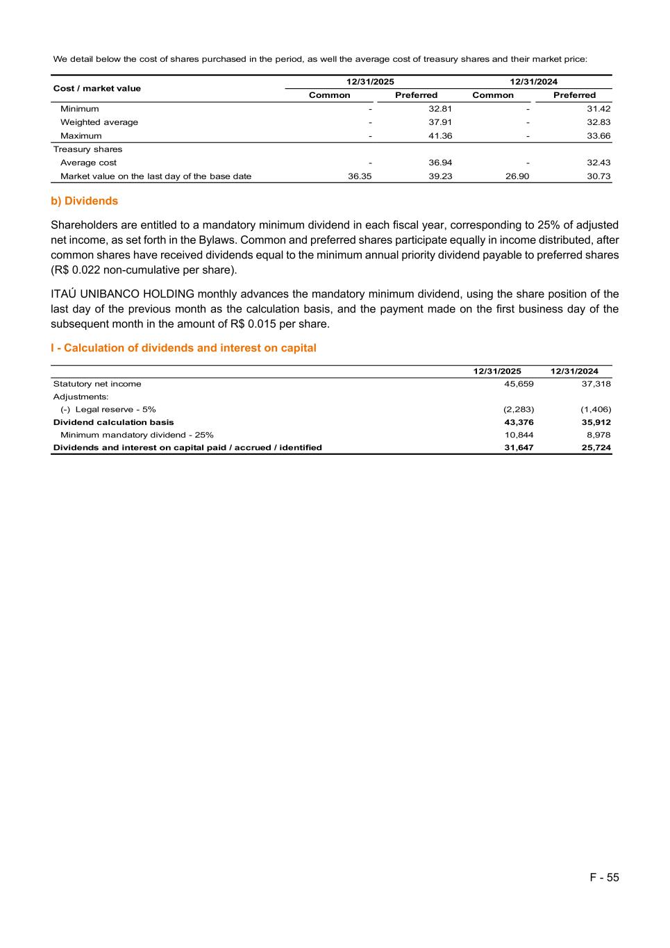 F - 55 We detail below the cost of shares purchased in the period, as well the average cost of treasury shares and their market price: Cost / market value 12/31/2025 12/31/2024 Common Preferred Common Preferred Minimum - 32.81 - 31.42 Weighted average - 37.91 - 32.83 Maximum - 41.36 - 33.66 Treasury shares Average cost - 36.94 - 32.43 Market value on the last day of the base date 36.35 39.23 26.90 30.73 b) Dividends Shareholders are entitled to a mandatory minimum dividend in each fiscal year, corresponding to 25% of adjusted net income, as set forth in the Bylaws. Common and preferred shares participate equally in income distributed, after common shares have received dividends equal to the minimum annual priority dividend payable to preferred shares (R$ 0.022 non-cumulative per share). ITAÚ UNIBANCO HOLDING monthly advances the mandatory minimum dividend, using the share position of the last day of the previous month as the calculation basis, and the payment made on the first business day of the subsequent month in the amount of R$ 0.015 per share. I - Calculation of dividends and interest on capital 12/31/2025 12/31/2024 Statutory net income 45,659 37,318 Adjustments: (-) Legal reserve - 5% (2,283) (1,406) Dividend calculation basis 43,376 35,912 Minimum mandatory dividend - 25% 10,844 8,978 Dividends and interest on capital paid / accrued / identified 31,647 25,724