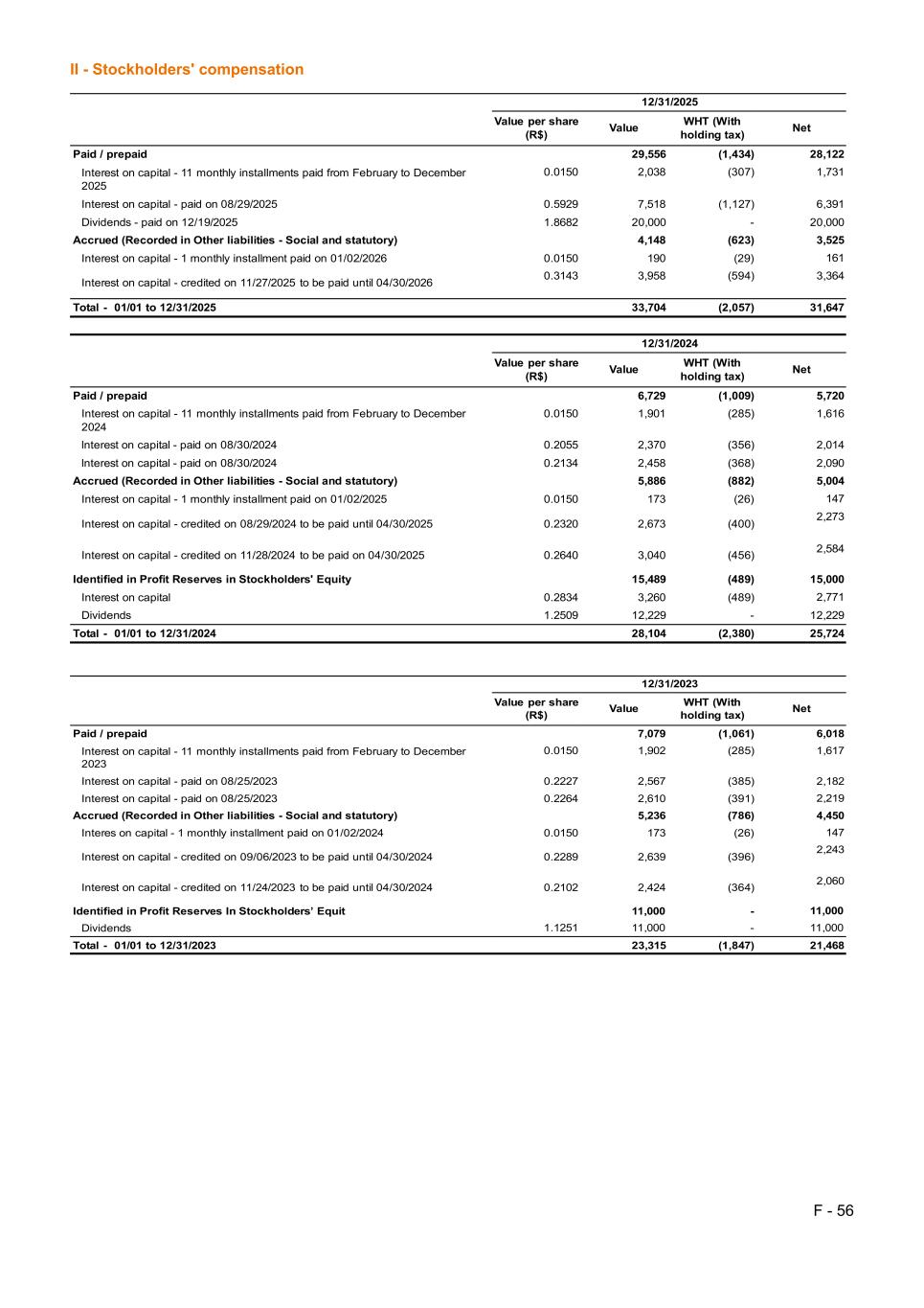 F - 56 II - Stockholders' compensation 12/31/2025 Value per share (R$) Value WHT (With holding tax) Net Paid / prepaid 29,556 (1,434) 28,122 Interest on capital - 11 monthly installments paid from February to December 2025 0.0150 2,038 (307) 1,731 Interest on capital - paid on 08/29/2025 0.5929 7,518 (1,127) 6,391 Dividends - paid on 12/19/2025 1.8682 20,000 - 20,000 Accrued (Recorded in Other liabilities - Social and statutory) 4,148 (623) 3,525 Interest on capital - 1 monthly installment paid on 01/02/2026 0.0150 190 (29) 161 Interest on capital - credited on 11/27/2025 to be paid until 04/30/2026 0.3143 3,958 (594) 3,364 Total - 01/01 to 12/31/2025 33,704 (2,057) 31,647 12/31/2024 Value per share (R$) Value WHT (With holding tax) Net Paid / prepaid 6,729 (1,009) 5,720 Interest on capital - 11 monthly installments paid from February to December 2024 0.0150 1,901 (285) 1,616 lnterest on capital - paid on 08/30/2024 0.2055 2,370 (356) 2,014 lnterest on capital - paid on 08/30/2024 0.2134 2,458 (368) 2,090 Accrued (Recorded in Other liabilities - Social and statutory) 5,886 (882) 5,004 Interest on capital - 1 monthly installment paid on 01/02/2025 0.0150 173 (26) 147 Interest on capital - credited on 08/29/2024 to be paid until 04/30/2025 0.2320 2,673 (400) 2,273 Interest on capital - credited on 11/28/2024 to be paid on 04/30/2025 0.2640 3,040 (456) 2,584 Identified in Profit Reserves in Stockholders' Equity 15,489 (489) 15,000 Interest on capital 0.2834 3,260 (489) 2,771 Dividends 1.2509 12,229 - 12,229 Total - 01/01 to 12/31/2024 28,104 (2,380) 25,724 12/31/2023 Value per share (R$) Value WHT (With holding tax) Net Paid / prepaid 7,079 (1,061) 6,018 Interest on capital - 11 monthly installments paid from February to December 2023 0.0150 1,902 (285) 1,617 Interest on capital - paid on 08/25/2023 0.2227 2,567 (385) 2,182 Interest on capital - paid on 08/25/2023 0.2264 2,610 (391) 2,219 Accrued (Recorded in Other liabilities - Social and statutory) 5,236 (786) 4,450 Interes on capital - 1 monthly installment paid on 01/02/2024 0.0150 173 (26) 147 Interest on capital - credited on 09/06/2023 to be paid until 04/30/2024 0.2289 2,639 (396) 2,243 Interest on capital - credited on 11/24/2023 to be paid until 04/30/2024 0.2102 2,424 (364) 2,060 Identified in Profit Reserves In Stockholders’ Equit 11,000 - 11,000 Dividends 1.1251 11,000 - 11,000 Total - 01/01 to 12/31/2023 23,315 (1,847) 21,468