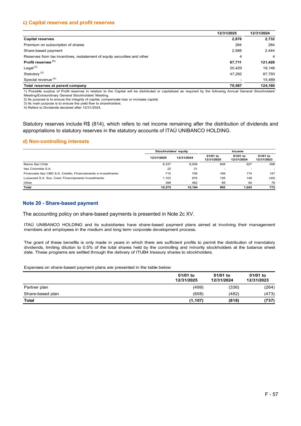 F - 57 c) Capital reserves and profit reserves 12/31/2025 12/31/2024 Capital reserves 2,876 2,732 Premium on subscription of shares 284 284 Share-based payment 2,588 2,444 Reserves from tax incentives, restatement of equity securities and other 4 4 Profit reserves (1) 67,711 121,428 Legal (2) 20,429 18,146 Statutory (3) 47,282 87,793 Special revenue (4) - 15,489 Total reserves at parent company 70,587 124,160 1) Possible surplus of Profit reserves in relation to the Capital will be distributed or capitalized as required by the following Annual General Stockholders' Meeting/Extraordinary General Stockholders' Meeting. 2) Its purpose is to ensure the integrity of capital, compensate loss or increase capital. 3) Its main purpose is to ensure the yield flow to shareholders. 4) Refers to Dividends declared after 12/31/2024. Statutory reserves include R$ (814), which refers to net income remaining after the distribution of dividends and appropriations to statutory reserves in the statutory accounts of ITAÚ UNIBANCO HOLDING. d) Non-controlling interests Stockholders’ equity Income 12/31/2025 12/31/2024 01/01 to 12/31/2025 01/01 to 12/31/2024 01/01 to 12/31/2023 Banco Itaú Chile 8,337 8,009 608 627 598 Itaú Colombia S.A. 22 21 - - - Financeira Itaú CBD S.A. Crédito, Financiamento e Investimento 715 706 169 174 147 Luizacred S.A. Soc. Cred. Financiamento Investimento 1,103 976 126 148 (49) Other 398 482 89 94 76 Total 10,575 10,194 992 1,043 772 Note 20 - Share-based payment The accounting policy on share-based payments is presented in Note 2c XV. ITAÚ UNIBANCO HOLDING and its subsidiaries have share-based payment plans aimed at involving their management members and employees in the medium and long term corporate development process. The grant of these benefits is only made in years in which there are sufficient profits to permit the distribution of mandatory dividends, limiting dilution to 0.5% of the total shares held by the controlling and minority stockholders at the balance sheet date. These programs are settled through the delivery of ITUB4 treasury shares to stockholders. Expenses on share-based payment plans are presented in the table below: 01/01 to 12/31/2025 01/01 to 12/31/2024 01/01 to 12/31/2023 Partner plan (499) (336) (264) Share-based plan (608) (482) (473) Total (1,107) (818) (737)