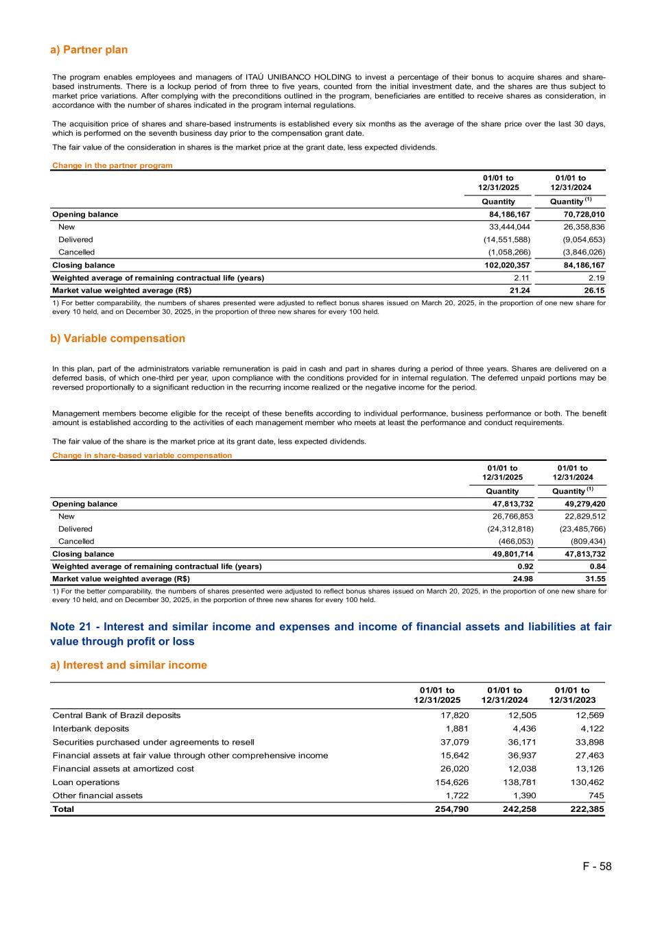 F - 58 a) Partner plan The program enables employees and managers of ITAÚ UNIBANCO HOLDING to invest a percentage of their bonus to acquire shares and share- based instruments. There is a lockup period of from three to five years, counted from the initial investment date, and the shares are thus subject to market price variations. After complying with the preconditions outlined in the program, beneficiaries are entitled to receive shares as consideration, in accordance with the number of shares indicated in the program internal regulations. The acquisition price of shares and share-based instruments is established every six months as the average of the share price over the last 30 days, which is performed on the seventh business day prior to the compensation grant date. The fair value of the consideration in shares is the market price at the grant date, less expected dividends. Change in the partner program 01/01 to 12/31/2025 01/01 to 12/31/2024 Quantity Quantity (1) Opening balance 84,186,167 70,728,010 New 33,444,044 26,358,836 Delivered (14,551,588) (9,054,653) Cancelled (1,058,266) (3,846,026) Closing balance 102,020,357 84,186,167 Weighted average of remaining contractual life (years) 2.11 2.19 Market value weighted average (R$) 21.24 26.15 1) For better comparability, the numbers of shares presented were adjusted to reflect bonus shares issued on March 20, 2025, in the proportion of one new share for every 10 held, and on December 30, 2025, in the proportion of three new shares for every 100 held. b) Variable compensation In this plan, part of the administrators variable remuneration is paid in cash and part in shares during a period of three years. Shares are delivered on a deferred basis, of which one-third per year, upon compliance with the conditions provided for in internal regulation. The deferred unpaid portions may be reversed proportionally to a significant reduction in the recurring income realized or the negative income for the period. Management members become eligible for the receipt of these benefits according to individual performance, business performance or both. The benefit amount is established according to the activities of each management member who meets at least the performance and conduct requirements. The fair value of the share is the market price at its grant date, less expected dividends. Change in share-based variable compensation 01/01 to 12/31/2025 01/01 to 12/31/2024 Quantity Quantity (1) Opening balance 47,813,732 49,279,420 New 26,766,853 22,829,512 Delivered (24,312,818) (23,485,766) Cancelled (466,053) (809,434) Closing balance 49,801,714 47,813,732 Weighted average of remaining contractual life (years) 0.92 0.84 Market value weighted average (R$) 24.98 31.55 1) For the better comparability, the numbers of shares presented were adjusted to reflect bonus shares issued on March 20, 2025, in the proportion of one new share for every 10 held, and on December 30, 2025, in the porportion of three new shares for every 100 held. Note 21 - Interest and similar income and expenses and income of financial assets and liabilities at fair value through profit or loss a) Interest and similar income 01/01 to 12/31/2025 01/01 to 12/31/2024 01/01 to 12/31/2023 Central Bank of Brazil deposits 17,820 12,505 12,569 Interbank deposits 1,881 4,436 4,122 Securities purchased under agreements to resell 37,079 36,171 33,898 Financial assets at fair value through other comprehensive income 15,642 36,937 27,463 Financial assets at amortized cost 26,020 12,038 13,126 Loan operations 154,626 138,781 130,462 Other financial assets 1,722 1,390 745 Total 254,790 242,258 222,385