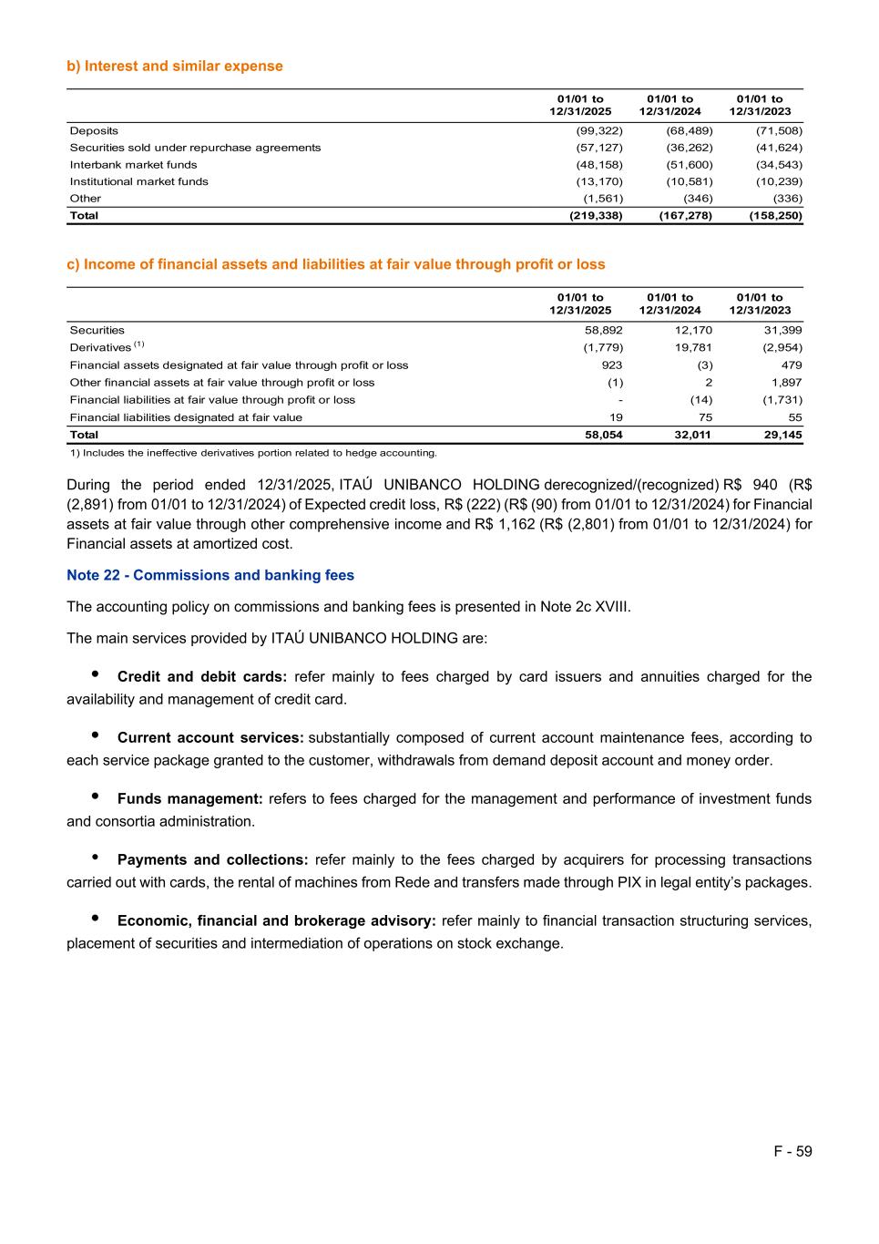 F - 59 b) Interest and similar expense 01/01 to 12/31/2025 01/01 to 12/31/2024 01/01 to 12/31/2023 Deposits (99,322) (68,489) (71,508) Securities sold under repurchase agreements (57,127) (36,262) (41,624) Interbank market funds (48,158) (51,600) (34,543) Institutional market funds (13,170) (10,581) (10,239) Other (1,561) (346) (336) Total (219,338) (167,278) (158,250) c) Income of financial assets and liabilities at fair value through profit or loss 01/01 to 12/31/2025 01/01 to 12/31/2024 01/01 to 12/31/2023 Securities 58,892 12,170 31,399 Derivatives (1) (1,779) 19,781 (2,954) Financial assets designated at fair value through profit or loss 923 (3) 479 Other financial assets at fair value through profit or loss (1) 2 1,897 Financial liabilities at fair value through profit or loss - (14) (1,731) Financial liabilities designated at fair value 19 75 55 Total 58,054 32,011 29,145 1) Includes the ineffective derivatives portion related to hedge accounting. During the period ended 12/31/2025, ITAÚ UNIBANCO HOLDING derecognized/(recognized) R$ 940 (R$ (2,891) from 01/01 to 12/31/2024) of Expected credit loss, R$ (222) (R$ (90) from 01/01 to 12/31/2024) for Financial assets at fair value through other comprehensive income and R$ 1,162 (R$ (2,801) from 01/01 to 12/31/2024) for Financial assets at amortized cost. Note 22 - Commissions and banking fees The accounting policy on commissions and banking fees is presented in Note 2c XVIII. The main services provided by ITAÚ UNIBANCO HOLDING are: • Credit and debit cards: refer mainly to fees charged by card issuers and annuities charged for the availability and management of credit card. • Current account services: substantially composed of current account maintenance fees, according to each service package granted to the customer, withdrawals from demand deposit account and money order. • Funds management: refers to fees charged for the management and performance of investment funds and consortia administration. • Payments and collections: refer mainly to the fees charged by acquirers for processing transactions carried out with cards, the rental of machines from Rede and transfers made through PIX in legal entity’s packages. • Economic, financial and brokerage advisory: refer mainly to financial transaction structuring services, placement of securities and intermediation of operations on stock exchange.