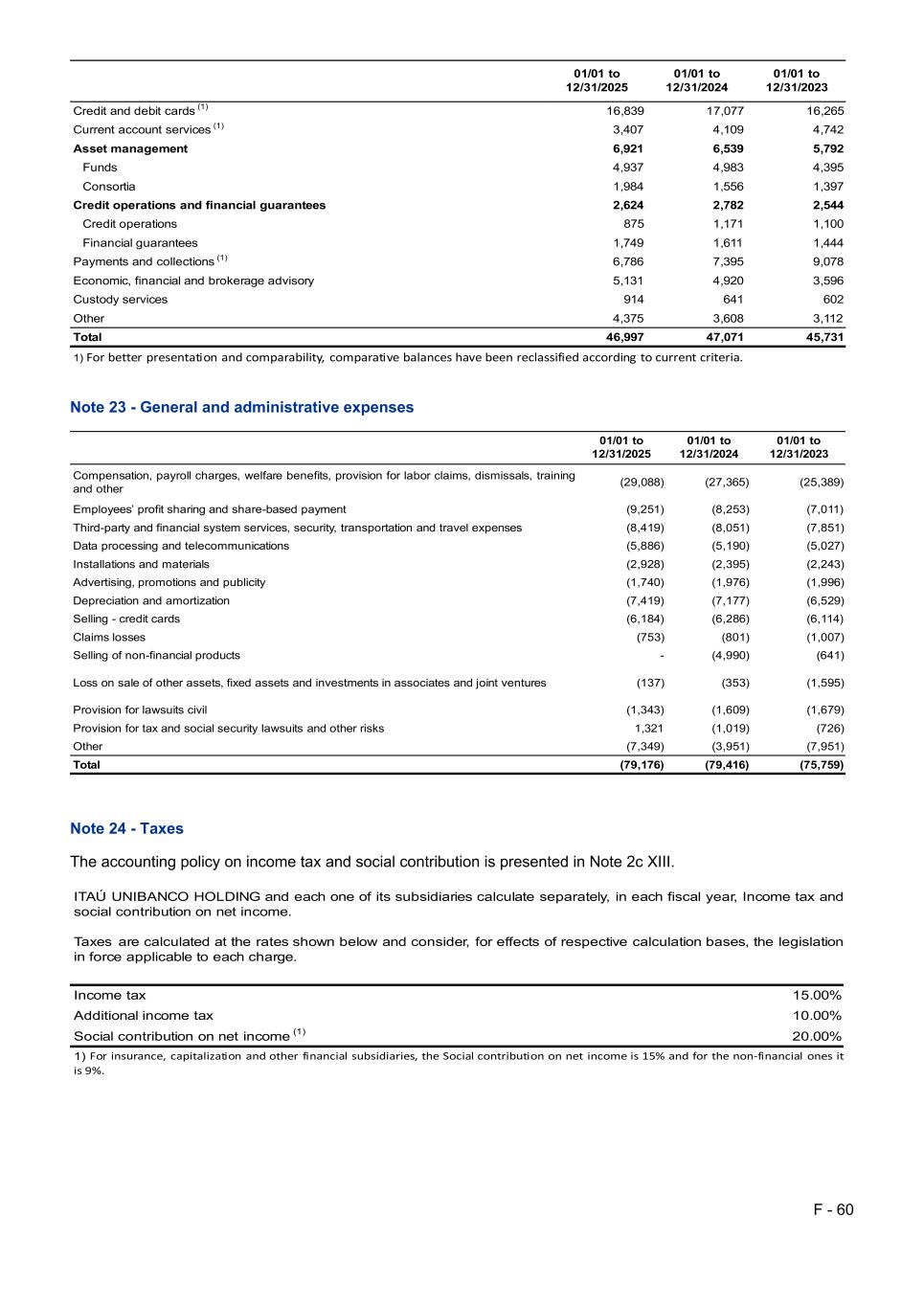 F - 60 01/01 to 12/31/2025 01/01 to 12/31/2024 01/01 to 12/31/2023 Credit and debit cards (1) 16,839 17,077 16,265 Current account services (1) 3,407 4,109 4,742 Asset management 6,921 6,539 5,792 Funds 4,937 4,983 4,395 Consortia 1,984 1,556 1,397 Credit operations and financial guarantees 2,624 2,782 2,544 Credit operations 875 1,171 1,100 Financial guarantees 1,749 1,611 1,444 Payments and collections (1) 6,786 7,395 9,078 Economic, financial and brokerage advisory 5,131 4,920 3,596 Custody services 914 641 602 Other 4,375 3,608 3,112 Total 46,997 47,071 45,731 1) For better presentation and comparability, comparative balances have been reclassified according to current criteria. Note 23 - General and administrative expenses 01/01 to 12/31/2025 01/01 to 12/31/2024 01/01 to 12/31/2023 Compensation, payroll charges, welfare benefits, provision for labor claims, dismissals, training and other (29,088) (27,365) (25,389) Employees’ profit sharing and share-based payment (9,251) (8,253) (7,011) Third-party and financial system services, security, transportation and travel expenses (8,419) (8,051) (7,851) Data processing and telecommunications (5,886) (5,190) (5,027) Installations and materials (2,928) (2,395) (2,243) Advertising, promotions and publicity (1,740) (1,976) (1,996) Depreciation and amortization (7,419) (7,177) (6,529) Selling - credit cards (6,184) (6,286) (6,114) Claims losses (753) (801) (1,007) Selling of non-financial products - (4,990) (641) Loss on sale of other assets, fixed assets and investments in associates and joint ventures (137) (353) (1,595) Provision for lawsuits civil (1,343) (1,609) (1,679) Provision for tax and social security lawsuits and other risks 1,321 (1,019) (726) Other (7,349) (3,951) (7,951) Total (79,176) (79,416) (75,759) Note 24 - Taxes The accounting policy on income tax and social contribution is presented in Note 2c XIII. ITAÚ UNIBANCO HOLDING and each one of its subsidiaries calculate separately, in each fiscal year, Income tax and social contribution on net income. Taxes are calculated at the rates shown below and consider, for effects of respective calculation bases, the legislation in force applicable to each charge. Income tax 15.00% Additional income tax 10.00% Social contribution on net income (1) 20.00% 1) For insurance, capitalization and other financial subsidiaries, the Social contribution on net income is 15% and for the non-financial ones it is 9%.