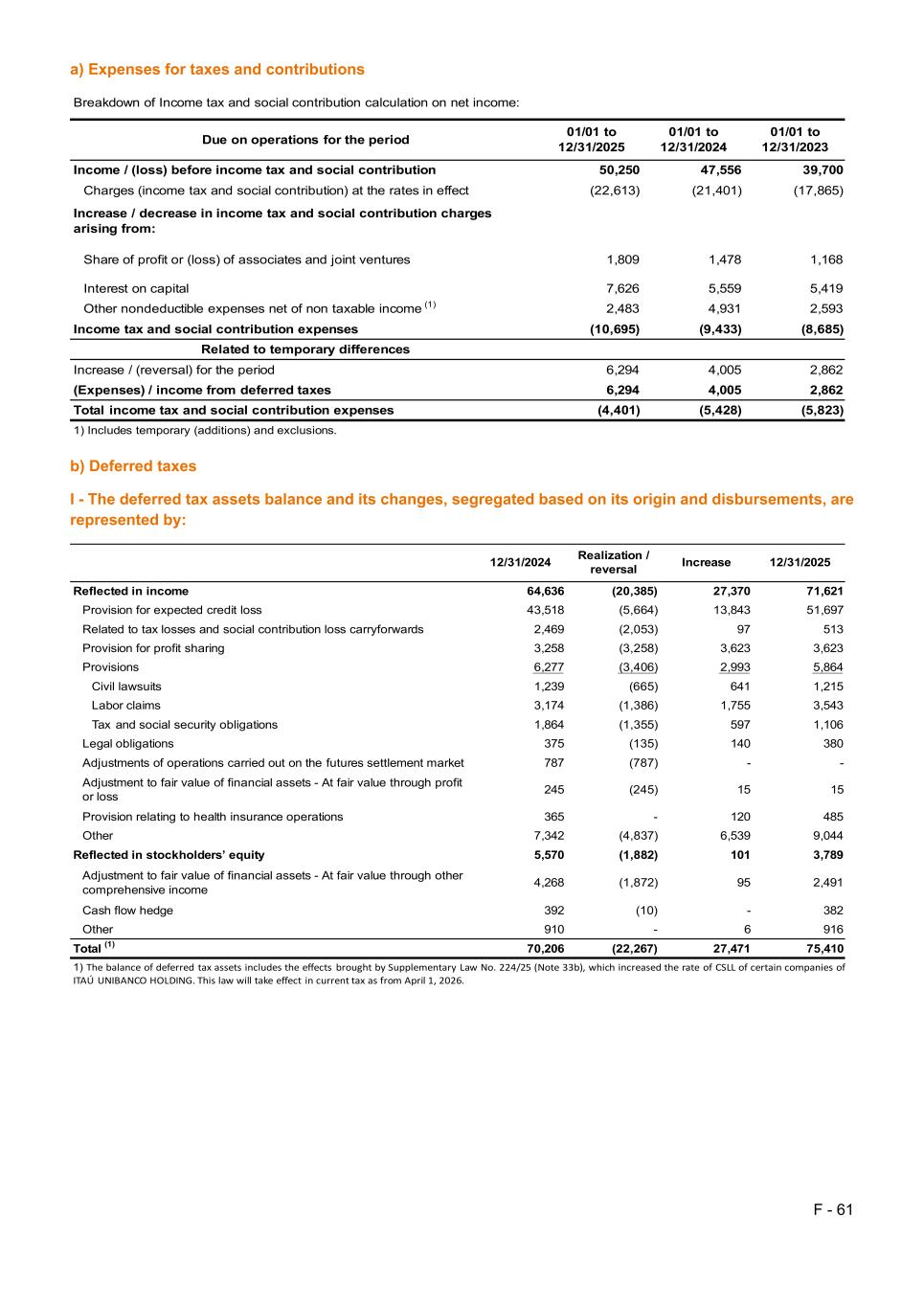 F - 61 a) Expenses for taxes and contributions Breakdown of Income tax and social contribution calculation on net income: Due on operations for the period 01/01 to 12/31/2025 01/01 to 12/31/2024 01/01 to 12/31/2023 Income / (loss) before income tax and social contribution 50,250 47,556 39,700 Charges (income tax and social contribution) at the rates in effect (22,613) (21,401) (17,865) Increase / decrease in income tax and social contribution charges arising from: Share of profit or (loss) of associates and joint ventures 1,809 1,478 1,168 Interest on capital 7,626 5,559 5,419 Other nondeductible expenses net of non taxable income (1) 2,483 4,931 2,593 Income tax and social contribution expenses (10,695) (9,433) (8,685) Related to temporary differences Increase / (reversal) for the period 6,294 4,005 2,862 (Expenses) / income from deferred taxes 6,294 4,005 2,862 Total income tax and social contribution expenses (4,401) (5,428) (5,823) 1) Includes temporary (additions) and exclusions. b) Deferred taxes I - The deferred tax assets balance and its changes, segregated based on its origin and disbursements, are represented by: 01/01/2025 12/31/2024 Realization / reversal Increase 12/31/2025 Reflected in income 64,636 (20,385) 27,370 71,621 Provision for expected credit loss 43,518 (5,664) 13,843 51,697 Related to tax losses and social contribution loss carryforwards 2,469 (2,053) 97 513 Provision for profit sharing 3,258 (3,258) 3,623 3,623 Provisions 6,277 (3,406) 2,993 5,864 Civil lawsuits 1,239 (665) 641 1,215 Labor claims 3,174 (1,386) 1,755 3,543 Tax and social security obligations 1,864 (1,355) 597 1,106 Legal obligations 375 (135) 140 380 Adjustments of operations carried out on the futures settlement market 787 (787) - - Adjustment to fair value of financial assets - At fair value through profit or loss 245 (245) 15 15 Provision relating to health insurance operations 365 - 120 485 Other 7,342 (4,837) 6,539 9,044 Reflected in stockholders’ equity 5,570 (1,882) 101 3,789 Adjustment to fair value of financial assets - At fair value through other comprehensive income 4,268 (1,872) 95 2,491 Cash flow hedge 392 (10) - 382 Other 910 - 6 916 Total (1) 70,206 (22,267) 27,471 75,410 1) The balance of deferred tax assets includes the effects brought by Supplementary Law No. 224/25 (Note 33b), which increased the rate of CSLL of certain companies of ITAÚ UNIBANCO HOLDING. This law will take effect in current tax as from April 1, 2026.