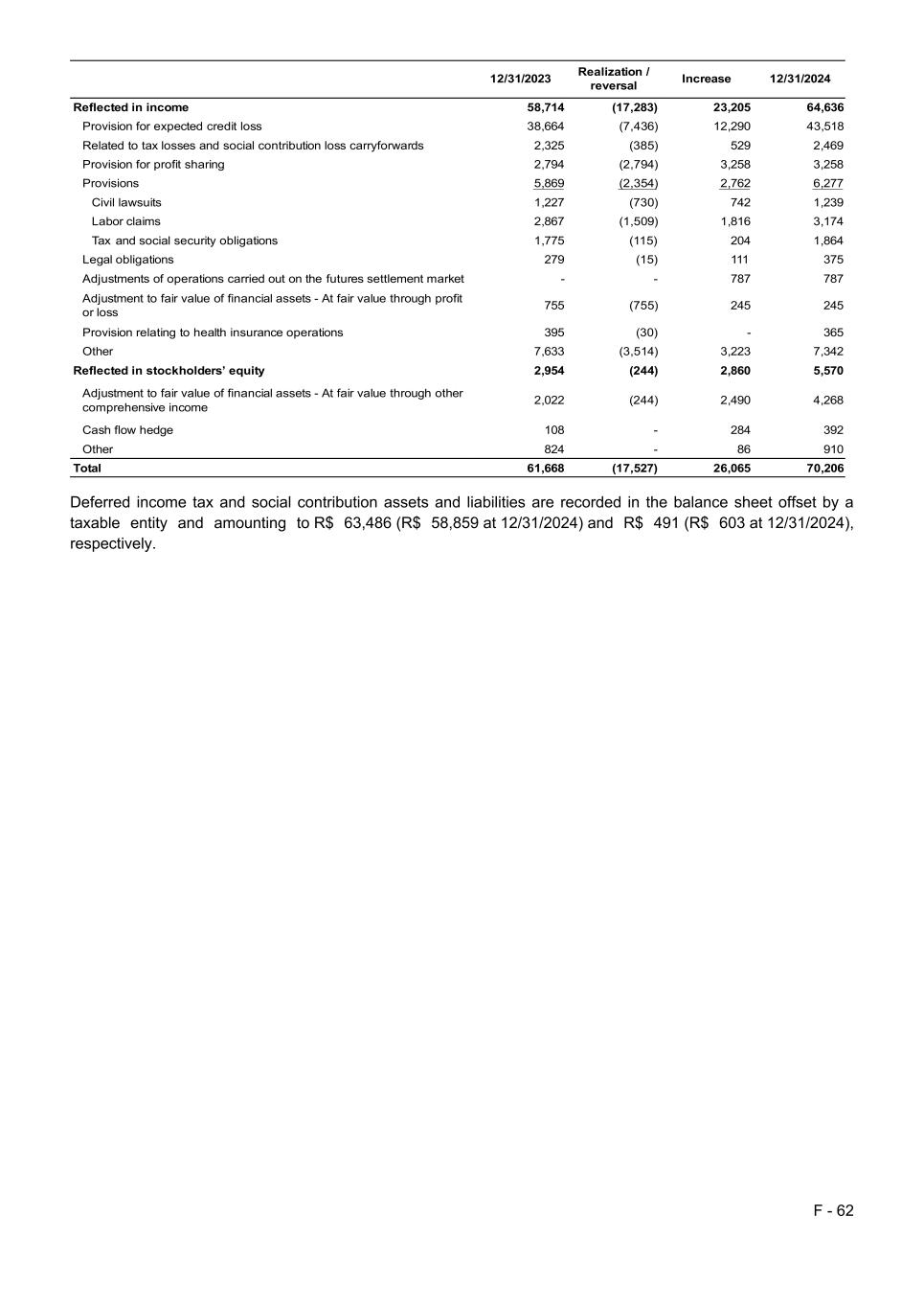 F - 62 01/01/2024 12/31/2023 Realization / reversal Increase 12/31/2024 Reflected in income 58,714 (17,283) 23,205 64,636 Provision for expected credit loss 38,664 (7,436) 12,290 43,518 Related to tax losses and social contribution loss carryforwards 2,325 (385) 529 2,469 Provision for profit sharing 2,794 (2,794) 3,258 3,258 Provisions 5,869 (2,354) 2,762 6,277 Civil lawsuits 1,227 (730) 742 1,239 Labor claims 2,867 (1,509) 1,816 3,174 Tax and social security obligations 1,775 (115) 204 1,864 Legal obligations 279 (15) 111 375 Adjustments of operations carried out on the futures settlement market - - 787 787 Adjustment to fair value of financial assets - At fair value through profit or loss 755 (755) 245 245 Provision relating to health insurance operations 395 (30) - 365 Other 7,633 (3,514) 3,223 7,342 Reflected in stockholders’ equity 2,954 (244) 2,860 5,570 Adjustment to fair value of financial assets - At fair value through other comprehensive income 2,022 (244) 2,490 4,268 Cash flow hedge 108 - 284 392 Other 824 - 86 910 Total 61,668 (17,527) 26,065 70,206 Deferred income tax and social contribution assets and liabilities are recorded in the balance sheet offset by a taxable entity and amounting to R$ 63,486 (R$ 58,859 at 12/31/2024) and R$ 491 (R$ 603 at 12/31/2024), respectively.