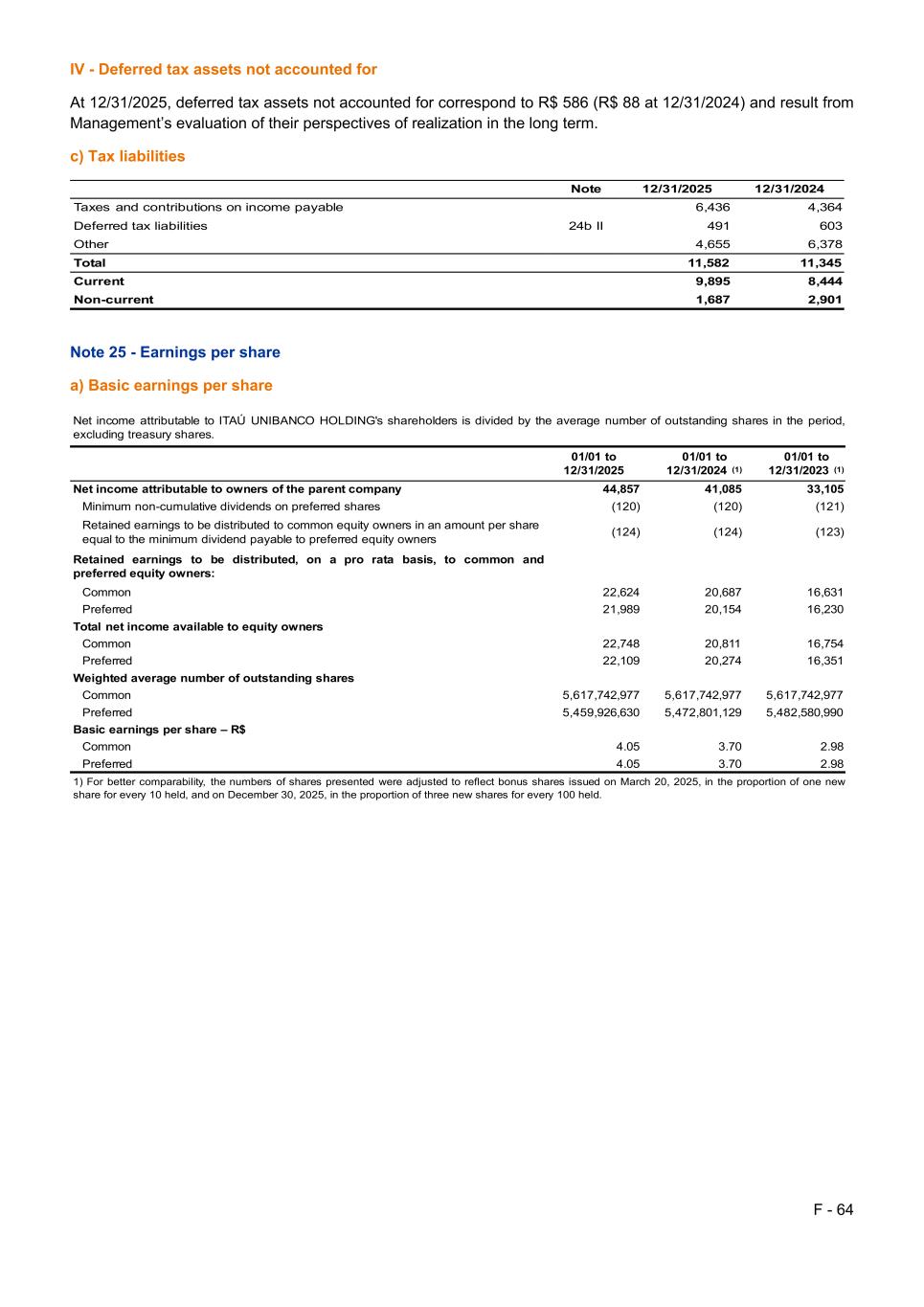 F - 64 IV - Deferred tax assets not accounted for At 12/31/2025, deferred tax assets not accounted for correspond to R$ 586 (R$ 88 at 12/31/2024) and result from Management’s evaluation of their perspectives of realization in the long term. c) Tax liabilities Note 12/31/2025 12/31/2024 Taxes and contributions on income payable 6,436 4,364 Deferred tax liabilities 24b II 491 603 Other 4,655 6,378 Total 11,582 11,345 Current 9,895 8,444 Non-current 1,687 2,901 Note 25 - Earnings per share a) Basic earnings per share Net income attributable to ITAÚ UNIBANCO HOLDING's shareholders is divided by the average number of outstanding shares in the period, excluding treasury shares. 01/01 to 12/31/2025 01/01 to 12/31/2024 (1) 01/01 to 12/31/2023 (1) Net income attributable to owners of the parent company 44,857 41,085 33,105 Minimum non-cumulative dividends on preferred shares (120) (120) (121) Retained earnings to be distributed to common equity owners in an amount per share equal to the minimum dividend payable to preferred equity owners (124) (124) (123) Retained earnings to be distributed, on a pro rata basis, to common and preferred equity owners: Common 22,624 20,687 16,631 Preferred 21,989 20,154 16,230 Total net income available to equity owners Common 22,748 20,811 16,754 Preferred 22,109 20,274 16,351 Weighted average number of outstanding shares Common 5,617,742,977 5,617,742,977 5,617,742,977 Preferred 5,459,926,630 5,472,801,129 5,482,580,990 Basic earnings per share – R$ Common 4.05 3.70 2.98 Preferred 4.05 3.70 2.98 1) For better comparability, the numbers of shares presented were adjusted to reflect bonus shares issued on March 20, 2025, in the proportion of one new share for every 10 held, and on December 30, 2025, in the proportion of three new shares for every 100 held.