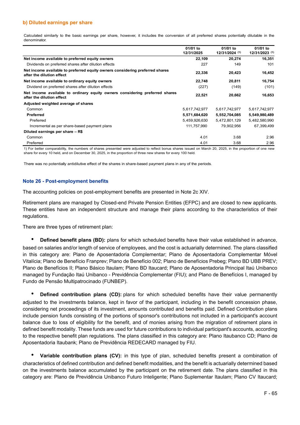 F - 65 b) Diluted earnings per share Calculated similarly to the basic earnings per share, however, it includes the conversion of all preferred shares potentially dilutable in the denominator. 01/01 to 12/31/2025 01/01 to 12/31/2024 (1) 01/01 to 12/31/2023 (1) Net income available to preferred equity owners 22,109 20,274 16,351 Dividends on preferred shares after dilution effects 227 149 101 Net income available to preferred equity owners considering preferred shares after the dilution effect 22,336 20,423 16,452 Net income available to ordinary equity owners 22,748 20,811 16,754 Dividend on preferred shares after dilution effects (227) (149) (101) Net income available to ordinary equity owners considering preferred shares after the dilution effect 22,521 20,662 16,653 Adjusted weighted average of shares Common 5,617,742,977 5,617,742,977 5,617,742,977 Preferred 5,571,684,620 5,552,704,085 5,549,980,489 Preferred 5,459,926,630 5,472,801,129 5,482,580,990 Incremental as per share-based payment plans 111,757,990 79,902,956 67,399,499 Diluted earnings per share – R$ Common 4.01 3.68 2.96 Preferred 4.01 3.68 2.96 1) For better comparability, the numbers of shares presented were adjusted to reflect bonus shares issued on March 20, 2025, in the proportion of one new share for every 10 held, and on December 30, 2025, in the proportion of three new shares for every 100 held. There was no potentially antidilutive effect of the shares in share-based payment plans in any of the periods. Note 26 - Post-employment benefits The accounting policies on post-employment benefits are presented in Note 2c XIV. Retirement plans are managed by Closed-end Private Pension Entities (EFPC) and are closed to new applicants. These entities have an independent structure and manage their plans according to the characteristics of their regulations. There are three types of retirement plan: • Defined benefit plans (BD): plans for which scheduled benefits have their value established in advance, based on salaries and/or length of service of employees, and the cost is actuarially determined. The plans classified in this category are: Plano de Aposentadoria Complementar; Plano de Aposentadoria Complementar Móvel Vitalícia; Plano de Benefício Franprev; Plano de Benefício 002; Plano de Benefícios Prebeg; Plano BD UBB PREV; Plano de Benefícios II; Plano Básico Itaulam; Plano BD Itaucard; Plano de Aposentadoria Principal Itaú Unibanco managed by Fundação Itaú Unibanco - Previdência Complementar (FIU); and Plano de Benefícios I, managed by Fundo de Pensão Multipatrocinado (FUNBEP). • Defined contribution plans (CD): plans for which scheduled benefits have their value permanently adjusted to the investments balance, kept in favor of the participant, including in the benefit concession phase, considering net proceedings of its investment, amounts contributed and benefits paid. Defined Contribution plans include pension funds consisting of the portions of sponsor's contributions not included in a participant's account balance due to loss of eligibility for the benefit, and of monies arising from the migration of retirement plans in defined benefit modality. These funds are used for future contributions to individual participant's accounts, according to the respective benefit plan regulations. The plans classified in this category are: Plano Itaubanco CD; Plano de Aposentadoria Itaubank; Plano de Previdência REDECARD managed by FIU. • Variable contribution plans (CV): in this type of plan, scheduled benefits present a combination of characteristics of defined contribution and defined benefit modalities, and the benefit is actuarially determined based on the investments balance accumulated by the participant on the retirement date. The plans classified in this category are: Plano de Previdência Unibanco Futuro Inteligente; Plano Suplementar Itaulam; Plano CV Itaucard;