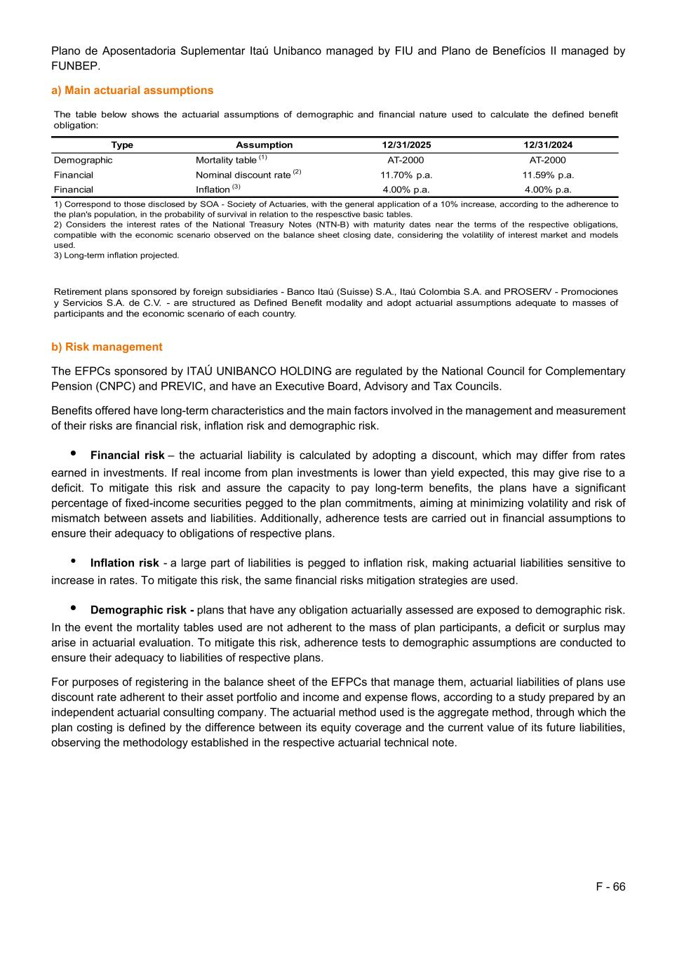 F - 66 Plano de Aposentadoria Suplementar Itaú Unibanco managed by FIU and Plano de Benefícios II managed by FUNBEP. a) Main actuarial assumptions The table below shows the actuarial assumptions of demographic and financial nature used to calculate the defined benefit obligation: Type Assumption 12/31/2025 12/31/2024 Demographic Mortality table (1) AT-2000 AT-2000 Financial Nominal discount rate (2) 11.70% p.a. 11.59% p.a. Financial Inflation (3) 4.00% p.a. 4.00% p.a. 1) Correspond to those disclosed by SOA - Society of Actuaries, with the general application of a 10% increase, according to the adherence to the plan's population, in the probability of survival in relation to the respesctive basic tables. 2) Considers the interest rates of the National Treasury Notes (NTN-B) with maturity dates near the terms of the respective obligations, compatible with the economic scenario observed on the balance sheet closing date, considering the volatility of interest market and models used. 3) Long-term inflation projected. Retirement plans sponsored by foreign subsidiaries - Banco Itaú (Suisse) S.A., Itaú Colombia S.A. and PROSERV - Promociones y Servicios S.A. de C.V. - are structured as Defined Benefit modality and adopt actuarial assumptions adequate to masses of participants and the economic scenario of each country. b) Risk management The EFPCs sponsored by ITAÚ UNIBANCO HOLDING are regulated by the National Council for Complementary Pension (CNPC) and PREVIC, and have an Executive Board, Advisory and Tax Councils. Benefits offered have long-term characteristics and the main factors involved in the management and measurement of their risks are financial risk, inflation risk and demographic risk. • Financial risk – the actuarial liability is calculated by adopting a discount, which may differ from rates earned in investments. If real income from plan investments is lower than yield expected, this may give rise to a deficit. To mitigate this risk and assure the capacity to pay long-term benefits, the plans have a significant percentage of fixed-income securities pegged to the plan commitments, aiming at minimizing volatility and risk of mismatch between assets and liabilities. Additionally, adherence tests are carried out in financial assumptions to ensure their adequacy to obligations of respective plans. • Inflation risk - a large part of liabilities is pegged to inflation risk, making actuarial liabilities sensitive to increase in rates. To mitigate this risk, the same financial risks mitigation strategies are used. • Demographic risk - plans that have any obligation actuarially assessed are exposed to demographic risk. In the event the mortality tables used are not adherent to the mass of plan participants, a deficit or surplus may arise in actuarial evaluation. To mitigate this risk, adherence tests to demographic assumptions are conducted to ensure their adequacy to liabilities of respective plans. For purposes of registering in the balance sheet of the EFPCs that manage them, actuarial liabilities of plans use discount rate adherent to their asset portfolio and income and expense flows, according to a study prepared by an independent actuarial consulting company. The actuarial method used is the aggregate method, through which the plan costing is defined by the difference between its equity coverage and the current value of its future liabilities, observing the methodology established in the respective actuarial technical note.