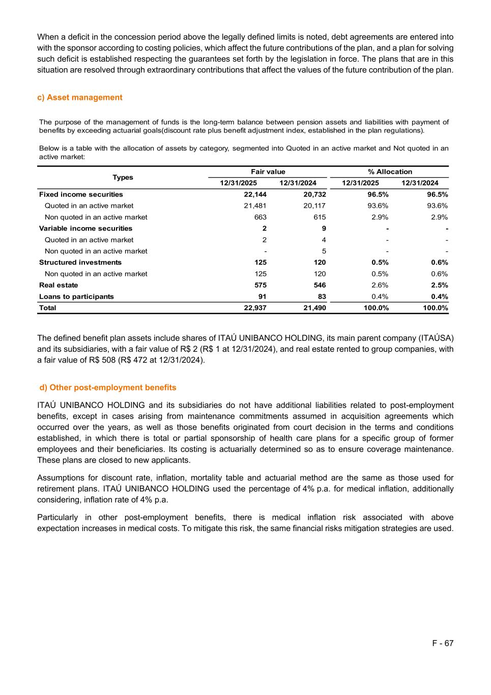 F - 67 When a deficit in the concession period above the legally defined limits is noted, debt agreements are entered into with the sponsor according to costing policies, which affect the future contributions of the plan, and a plan for solving such deficit is established respecting the guarantees set forth by the legislation in force. The plans that are in this situation are resolved through extraordinary contributions that affect the values of the future contribution of the plan. c) Asset management The purpose of the management of funds is the long-term balance between pension assets and liabilities with payment of benefits by exceeding actuarial goals(discount rate plus benefit adjustment index, established in the plan regulations). Below is a table with the allocation of assets by category, segmented into Quoted in an active market and Not quoted in an active market: Types Fair value % Allocation 12/31/2025 12/31/2024 12/31/2025 12/31/2024 Fixed income securities 22,144 20,732 96.5% 96.5% Quoted in an active market 21,481 20,117 93.6% 93.6% Non quoted in an active market 663 615 2.9% 2.9% Variable income securities 2 9 - - Quoted in an active market 2 4 - - Non quoted in an active market - 5 - - Structured investments 125 120 0.5% 0.6% Non quoted in an active market 125 120 0.5% 0.6% Real estate 575 546 2.6% 2.5% Loans to participants 91 83 0.4% 0.4% Total 22,937 21,490 100.0% 100.0% The defined benefit plan assets include shares of ITAÚ UNIBANCO HOLDING, its main parent company (ITAÚSA) and its subsidiaries, with a fair value of R$ 2 (R$ 1 at 12/31/2024), and real estate rented to group companies, with a fair value of R$ 508 (R$ 472 at 12/31/2024). d) Other post-employment benefits ITAÚ UNIBANCO HOLDING and its subsidiaries do not have additional liabilities related to post-employment benefits, except in cases arising from maintenance commitments assumed in acquisition agreements which occurred over the years, as well as those benefits originated from court decision in the terms and conditions established, in which there is total or partial sponsorship of health care plans for a specific group of former employees and their beneficiaries. Its costing is actuarially determined so as to ensure coverage maintenance. These plans are closed to new applicants. Assumptions for discount rate, inflation, mortality table and actuarial method are the same as those used for retirement plans. ITAÚ UNIBANCO HOLDING used the percentage of 4% p.a. for medical inflation, additionally considering, inflation rate of 4% p.a. Particularly in other post-employment benefits, there is medical inflation risk associated with above expectation increases in medical costs. To mitigate this risk, the same financial risks mitigation strategies are used.