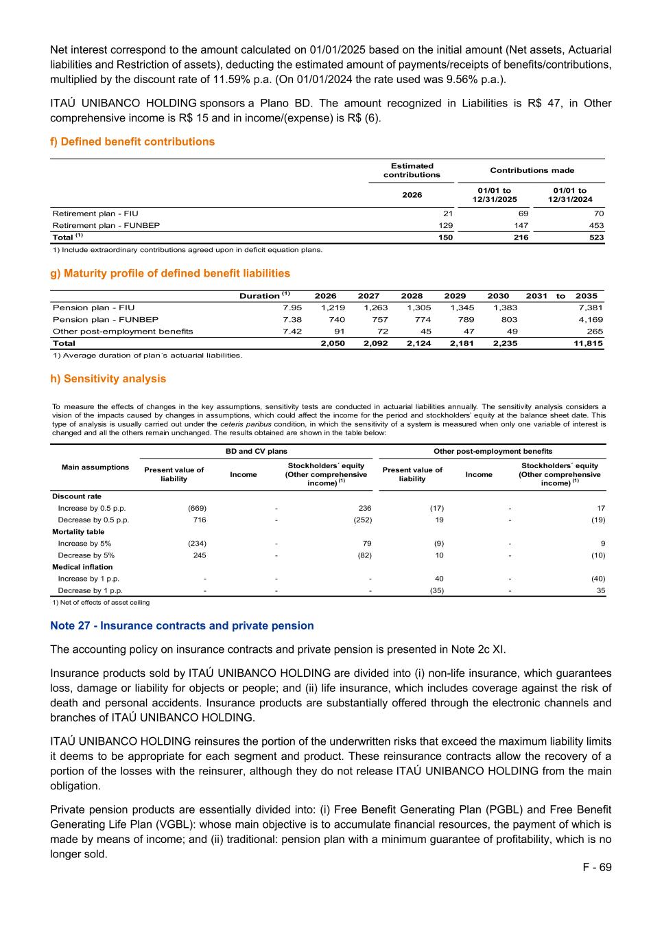 F - 69 Net interest correspond to the amount calculated on 01/01/2025 based on the initial amount (Net assets, Actuarial liabilities and Restriction of assets), deducting the estimated amount of payments/receipts of benefits/contributions, multiplied by the discount rate of 11.59% p.a. (On 01/01/2024 the rate used was 9.56% p.a.). ITAÚ UNIBANCO HOLDING sponsors a Plano BD. The amount recognized in Liabilities is R$ 47, in Other comprehensive income is R$ 15 and in income/(expense) is R$ (6). f) Defined benefit contributions Estimated contributions Contributions made 2026 01/01 to 12/31/2025 01/01 to 12/31/2024 Retirement plan - FIU 21 69 70 Retirement plan - FUNBEP 129 147 453 Total (1) 150 216 523 1) Include extraordinary contributions agreed upon in deficit equation plans. g) Maturity profile of defined benefit liabilities Duration (1) 2026 2027 2028 2029 2030 2031 to 2035 Pension plan - FIU 7.95 1,219 1,263 1,305 1,345 1,383 7,381 Pension plan - FUNBEP 7.38 740 757 774 789 803 4,169 Other post-employment benefits 7.42 91 72 45 47 49 265 Total 2,050 2,092 2,124 2,181 2,235 11,815 1) Average duration of plan´s actuarial liabilities. h) Sensitivity analysis To measure the effects of changes in the key assumptions, sensitivity tests are conducted in actuarial liabilities annually. The sensitivity analysis considers a vision of the impacts caused by changes in assumptions, which could affect the income for the period and stockholders’ equity at the balance sheet date. This type of analysis is usually carried out under the ceteris paribus condition, in which the sensitivity of a system is measured when only one variable of interest is changed and all the others remain unchanged. The results obtained are shown in the table below: Main assumptions BD and CV plans Other post-employment benefits Present value of liability Income Stockholders´ equity (Other comprehensive income) (1) Present value of liability Income Stockholders´ equity (Other comprehensive income) (1) Discount rate Increase by 0.5 p.p. (669) - 236 (17) - 17 Decrease by 0.5 p.p. 716 - (252) 19 - (19) Mortality table Increase by 5% (234) - 79 (9) - 9 Decrease by 5% 245 - (82) 10 - (10) Medical inflation Increase by 1 p.p. - - - 40 - (40) Decrease by 1 p.p. - - - (35) - 35 1) Net of effects of asset ceiling Note 27 - Insurance contracts and private pension The accounting policy on insurance contracts and private pension is presented in Note 2c XI. Insurance products sold by ITAÚ UNIBANCO HOLDING are divided into (i) non-life insurance, which guarantees loss, damage or liability for objects or people; and (ii) life insurance, which includes coverage against the risk of death and personal accidents. Insurance products are substantially offered through the electronic channels and branches of ITAÚ UNIBANCO HOLDING. ITAÚ UNIBANCO HOLDING reinsures the portion of the underwritten risks that exceed the maximum liability limits it deems to be appropriate for each segment and product. These reinsurance contracts allow the recovery of a portion of the losses with the reinsurer, although they do not release ITAÚ UNIBANCO HOLDING from the main obligation. Private pension products are essentially divided into: (i) Free Benefit Generating Plan (PGBL) and Free Benefit Generating Life Plan (VGBL): whose main objective is to accumulate financial resources, the payment of which is made by means of income; and (ii) traditional: pension plan with a minimum guarantee of profitability, which is no longer sold.