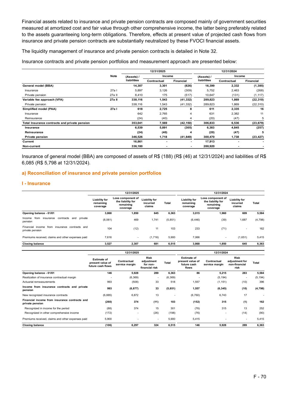 F - 70 Financial assets related to insurance and private pension contracts are composed mainly of government securities measured at amortized cost and fair value through other comprehensive income, the latter being preferably related to the assets guaranteeing long-term obligations. Therefore, effects at present value of projected cash flows from insurance and private pension contracts are substantially neutralized by these FVOCI financial assets. The liquidity management of insurance and private pension contracts is detailed in Note 32. Insurance contracts and private pension portfolios and measurement approach are presented below: Note 12/31/2025 12/31/2024 (Assets) / liabilities Income (Assets) / liabilities Income Contractual Financial Contractual Financial General model (BBA) 14,307 3,301 (826) 16,399 2,332 (1,385) lnsurance 27a I 5,897 3,126 (309) 5,752 2,463 (268) Private pension 27a II 8,410 175 (517) 10,647 (131) (1,117) Variable fee approach (VFA) 27a II 338,116 1,543 (41,332) 289,823 1,869 (22,310) Private pension 338,116 1,543 (41,332) 289,823 1,869 (22,310) Simplified model (PAA) 27a I 618 2,725 8 611 2,335 16 lnsurance 642 2,765 4 631 2,382 11 Reinsurance (24) (40) 4 (20) (47) 5 Total Insurance contracts and private pension 353,041 7,569 (42,150) 306,833 6,536 (23,679) lnsurance 6,539 5,891 (305) 6,383 4,845 (257) Reinsurance (24) (40) 4 (20) (47) 5 Private pension 346,526 1,718 (41,849) 300,470 1,738 (23,427) Current 16,861 - - 17,913 - - Non-current 336,180 - - 288,920 - - Insurance of general model (BBA) are composed of assets of R$ (188) (R$ (46) at 12/31/2024) and liabilities of R$ 6,085 (R$ 5,798 at 12/31/2024). a) Reconciliation of insurance and private pension portfolios I - Insurance 12/31/2025 12/31/2024 Liability for remaining coverage Loss component of the liability for remaining coverage Liability for incurred claims Total Liability for remaining coverage Loss component of the liability for remaining coverage Liability for incurred claims Total Opening balance - 01/01 3,868 1,850 645 6,363 3,015 1,960 609 5,584 Income from insurance contracts and private pension (8,061) 469 1,741 (5,851) (6,446) (39) 1,687 (4,798) Financial income from insurance contracts and private pension 104 (12) 11 103 233 (71) - 162 Premiums received, claims and other expenses paid 7,616 - (1,716) 5,900 7,066 - (1,651) 5,415 Closing balance 3,527 2,307 681 6,515 3,868 1,850 645 6,363 12/31/2025 12/31/2024 Estimate of present value of future cash flows Contractual service margin Risk adjustment for non- financial risk Total Estimate of present value of future cash flows Contractual service margin Risk adjustment for non-financial risk Total Opening balance - 01/01 146 5,928 289 6,363 86 5,215 283 5,584 Realization of insurance contractual margin - (6,369) - (6,369) - (5,194) - (5,194) Actuarial remeasurements 993 (508) 33 518 1,557 (1,151) (10) 396 Income from insurance contracts and private pension 993 (6,877) 33 (5,851) 1,557 (6,345) (10) (4,798) New recognized insurance contracts (6,885) 6,872 13 - (6,760) 6,743 17 - Financial income from insurance contracts and private pension (260) 374 (11) 103 (152) 315 (1) 162 Recognized in income for the period (88) 374 15 301 (76) 315 13 252 Recognized in other comprehensive income (172) - (26) (198) (76) - (14) (90) Premiums received, claims and other expenses paid 5,900 - - 5,900 5,415 - - 5,415 Closing balance (106) 6,297 324 6,515 146 5,928 289 6,363