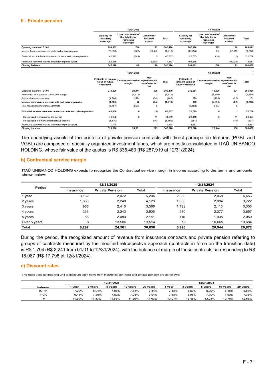 F - 71 II - Private pension 12/31/2025 12/31/2024 Liability for remaining coverage Loss component of the liability for remaining coverage Liability for incurred claims Total Liability for remaining coverage Loss component of the liability for remaining coverage Liability for incurred claims Total Opening balance - 01/01 299,662 716 92 300,470 265,128 595 98 265,821 Income from insurance contracts and private pension (77,896) (222) 76,400 (1,718) (89,794) 137 87,919 (1,738) Financial income from insurance contracts and private pension 40,997 (345) 5 40,657 22,753 (16) (1) 22,736 Premiums received, claims and other expenses paid 83,515 - (76,398) 7,117 101,575 - (87,924) 13,651 Closing Balance 346,278 149 99 346,526 299,662 716 92 300,470 12/31/2025 12/31/2024 Estimate of present value of future cash flows Contractual service margin Risk adjustment for non-financial risk Total Estimate of present value of future cash flows Contractual service margin Risk adjustment for non-financial risk Total Opening balance - 01/01 279,220 20,944 306 300,470 245,564 19,936 321 265,821 Realization of insurance contractual margin - (1,572) - (1,572) - (1,899) - (1,899) Actuarial remeasurements (1,706) 1,594 (34) (146) 379 (196) (22) 161 Income from insurance contracts and private pension (1,706) 22 (34) (1,718) 379 (2,095) (22) (1,738) New recognized insurance contracts (3,597) 3,589 8 - (3,103) 3,097 6 - Financial Income from insurance contracts and private pension 40,656 6 (5) 40,657 22,729 6 1 22,736 Recognized in income for the period 41,832 6 11 41,849 23,410 6 11 23,427 Recognized in other comprehensive income (1,176) - (16) (1,192) (681) - (10) (691) Premiums received, claims and other expenses paid 7,117 - - 7,117 13,651 - - 13,651 Closing balance 321,690 24,561 275 346,526 279,220 20,944 306 300,470 The underlying assets of the portfolio of private pension contracts with direct participation features (PGBL and VGBL) are composed of specially organized investment funds, which are mostly consolidated in ITAÚ UNIBANCO HOLDING, whose fair value of the quotas is R$ 335,480 (R$ 287,919 at 12/31/2024). b) Contractual service margin ITAÚ UNIBANCO HOLDING expects to recognize the Contractual service margin in income according to the terms and amounts shown below: Period 12/31/2025 12/31/2024 lnsurance Private Pension Total lnsurance Private Pension Total 1 year 3,132 2,072 5,204 2,388 2,068 4,456 2 years 1,880 2,248 4,128 1,638 2,084 3,722 3 years 956 2,410 3,366 1,188 2,115 3,303 4 years 263 2,242 2,505 580 2,077 2,657 5 years 58 2,083 2,141 115 1,935 2,050 Over 5 years 8 13,506 13,514 19 10,665 10,684 Total 6,297 24,561 30,858 5,928 20,944 26,872 During the period, the recognized amount of revenue from insurance contracts and private pension referring to groups of contracts measured by the modified retrospective approach (contracts in force on the transition date) is R$ 1,794 (R$ 2,241 from 01/01 to 12/31/2024), with the balance of margin of these contracts corresponding to R$ 18,087 (R$ 17,798 at 12/31/2024). c) Discount rates The rates used by indexing unit to discount cash flows from insurance contracts and private pension are as follows: 12/31/2025 12/31/2024 Indexes 1 year 3 years 5 years 10 years 20 years 1 year 3 years 5 years 10 years 20 years IGPM 7.29% 8.04% 7.98% 7.58% 7.34% 7.43% 5.69% 6.29% 6.18% 5.88% IPCA 9.13% 7.80% 7.62% 7.23% 7.04% 7.63% 8.05% 7.79% 7.59% 7.36% TR 11.69% 11.33% 11.55% 11.65% 11.63% 13.07% 13.48% 13.24% 12.78% 12.58%