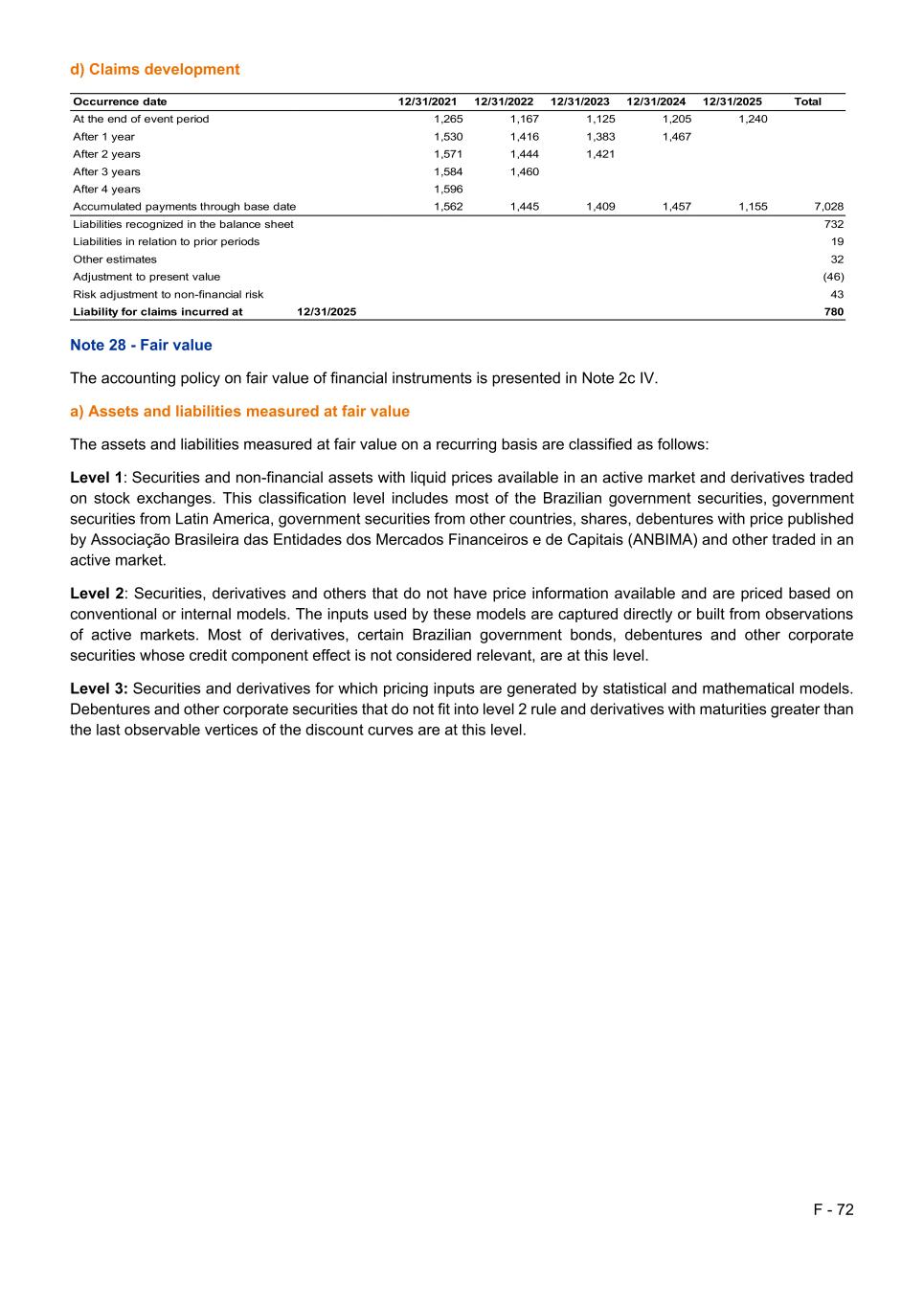 F - 72 d) Claims development Occurrence date 12/31/2021 12/31/2022 12/31/2023 12/31/2024 12/31/2025 Total At the end of event period 1,265 1,167 1,125 1,205 1,240 After 1 year 1,530 1,416 1,383 1,467 After 2 years 1,571 1,444 1,421 After 3 years 1,584 1,460 After 4 years 1,596 Accumulated payments through base date 1,562 1,445 1,409 1,457 1,155 7,028 Liabilities recognized in the balance sheet 732 Liabilities in relation to prior periods 19 Other estimates 32 Adjustment to present value (46) Risk adjustment to non-financial risk 43 Liability for claims incurred at 12/31/2025 780 Note 28 - Fair value The accounting policy on fair value of financial instruments is presented in Note 2c IV. a) Assets and liabilities measured at fair value The assets and liabilities measured at fair value on a recurring basis are classified as follows: Level 1: Securities and non-financial assets with liquid prices available in an active market and derivatives traded on stock exchanges. This classification level includes most of the Brazilian government securities, government securities from Latin America, government securities from other countries, shares, debentures with price published by Associação Brasileira das Entidades dos Mercados Financeiros e de Capitais (ANBIMA) and other traded in an active market. Level 2: Securities, derivatives and others that do not have price information available and are priced based on conventional or internal models. The inputs used by these models are captured directly or built from observations of active markets. Most of derivatives, certain Brazilian government bonds, debentures and other corporate securities whose credit component effect is not considered relevant, are at this level. Level 3: Securities and derivatives for which pricing inputs are generated by statistical and mathematical models. Debentures and other corporate securities that do not fit into level 2 rule and derivatives with maturities greater than the last observable vertices of the discount curves are at this level.