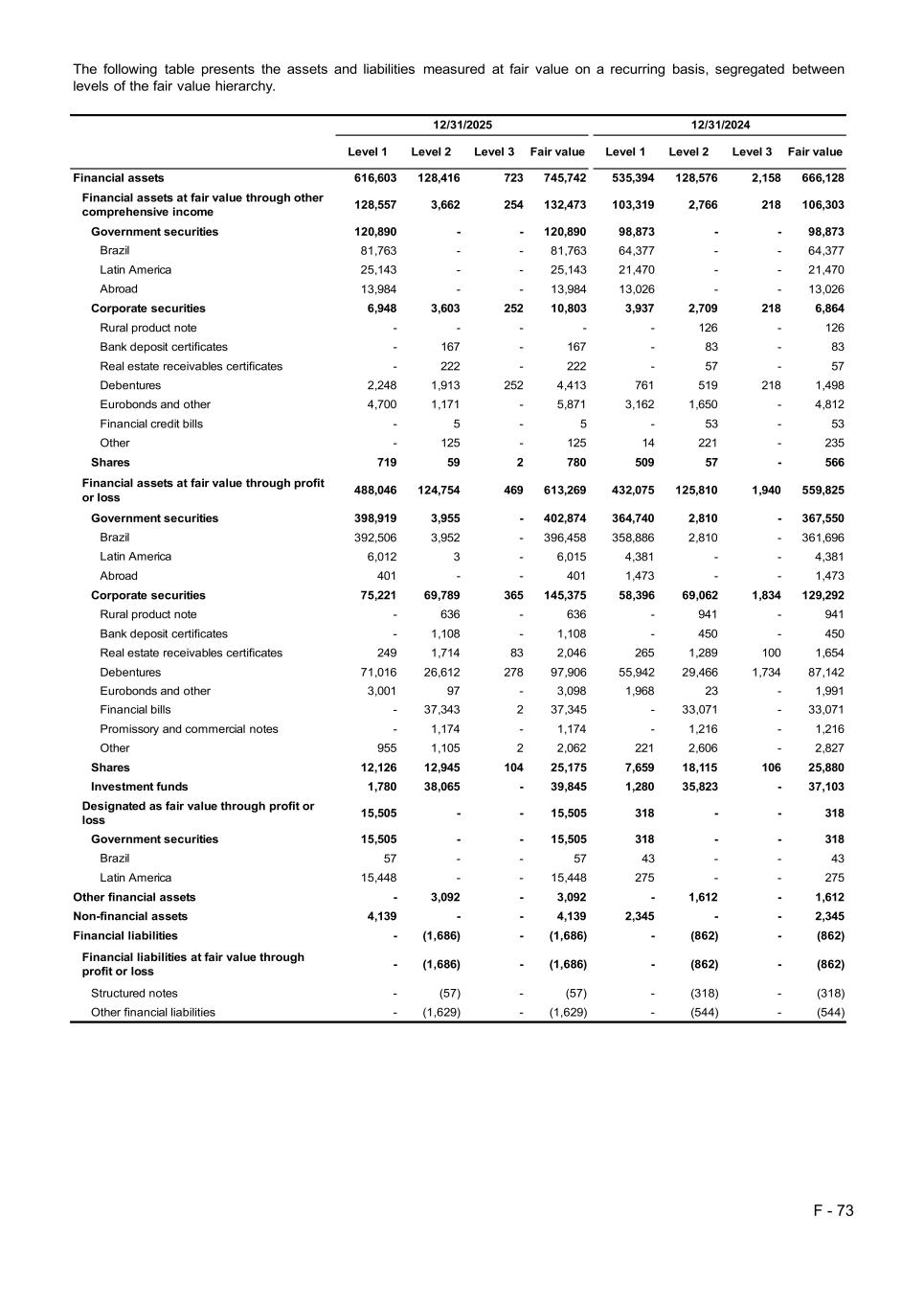 F - 73 The following table presents the assets and liabilities measured at fair value on a recurring basis, segregated between levels of the fair value hierarchy. 12/31/2025 12/31/2024 Level 1 Level 2 Level 3 Fair value Level 1 Level 2 Level 3 Fair value Financial assets 616,603 128,416 723 745,742 535,394 128,576 2,158 666,128 Financial assets at fair value through other comprehensive income 128,557 3,662 254 132,473 103,319 2,766 218 106,303 Government securities 120,890 - - 120,890 98,873 - - 98,873 Brazil 81,763 - - 81,763 64,377 - - 64,377 Latin America 25,143 - - 25,143 21,470 - - 21,470 Abroad 13,984 - - 13,984 13,026 - - 13,026 Corporate securities 6,948 3,603 252 10,803 3,937 2,709 218 6,864 Rural product note - - - - - 126 - 126 Bank deposit certificates - 167 - 167 - 83 - 83 Real estate receivables certificates - 222 - 222 - 57 - 57 Debentures 2,248 1,913 252 4,413 761 519 218 1,498 Eurobonds and other 4,700 1,171 - 5,871 3,162 1,650 - 4,812 Financial credit bills - 5 - 5 - 53 - 53 Other - 125 - 125 14 221 - 235 Shares 719 59 2 780 509 57 - 566 Financial assets at fair value through profit or loss 488,046 124,754 469 613,269 432,075 125,810 1,940 559,825 Government securities 398,919 3,955 - 402,874 364,740 2,810 - 367,550 Brazil 392,506 3,952 - 396,458 358,886 2,810 - 361,696 Latin America 6,012 3 - 6,015 4,381 - - 4,381 Abroad 401 - - 401 1,473 - - 1,473 Corporate securities 75,221 69,789 365 145,375 58,396 69,062 1,834 129,292 Rural product note - 636 - 636 - 941 - 941 Bank deposit certificates - 1,108 - 1,108 - 450 - 450 Real estate receivables certificates 249 1,714 83 2,046 265 1,289 100 1,654 Debentures 71,016 26,612 278 97,906 55,942 29,466 1,734 87,142 Eurobonds and other 3,001 97 - 3,098 1,968 23 - 1,991 Financial bills - 37,343 2 37,345 - 33,071 - 33,071 Promissory and commercial notes - 1,174 - 1,174 - 1,216 - 1,216 Other 955 1,105 2 2,062 221 2,606 - 2,827 Shares 12,126 12,945 104 25,175 7,659 18,115 106 25,880 Investment funds 1,780 38,065 - 39,845 1,280 35,823 - 37,103 Designated as fair value through profit or loss 15,505 - - 15,505 318 - - 318 Government securities 15,505 - - 15,505 318 - - 318 Brazil 57 - - 57 43 - - 43 Latin America 15,448 - - 15,448 275 - - 275 Other financial assets - 3,092 - 3,092 - 1,612 - 1,612 Non-financial assets 4,139 - - 4,139 2,345 - - 2,345 Financial liabilities - (1,686) - (1,686) - (862) - (862) Financial liabilities at fair value through profit or loss - (1,686) - (1,686) - (862) - (862) Structured notes - (57) - (57) - (318) - (318) Other financial liabilities - (1,629) - (1,629) - (544) - (544)