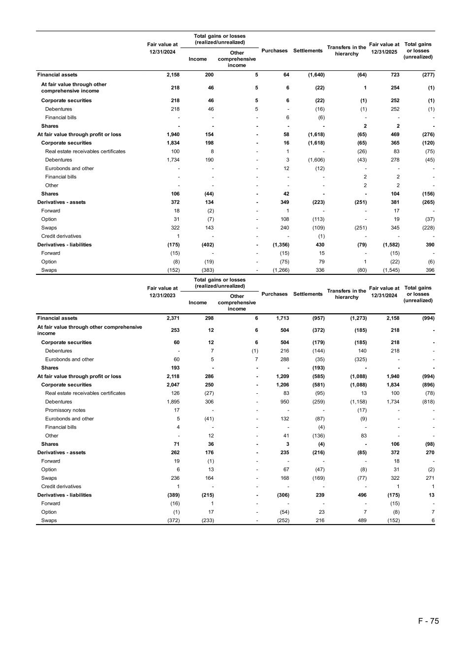F - 75 Fair value at Total gains or losses (realized/unrealized) Purchases Settlements Transfers in the hierarchy Fair value at Total gains or losses (unrealized) 01/01/2025 12/31/2024 Income Other comprehensive income 12/31/2025 Financial assets 2,158 200 5 64 (1,640) (64) 723 (277) At fair value through other comprehensive income 218 46 5 6 (22) 1 254 (1) Corporate securities 218 46 5 6 (22) (1) 252 (1) Debentures 218 46 5 - (16) (1) 252 (1) Financial bills - - - 6 (6) - - - Shares - - - - - 2 2 - At fair value through profit or loss 1,940 154 - 58 (1,618) (65) 469 (276) Corporate securities 1,834 198 - 16 (1,618) (65) 365 (120) Real estate receivables certificates 100 8 - 1 - (26) 83 (75) Debentures 1,734 190 - 3 (1,606) (43) 278 (45) Eurobonds and other - - - 12 (12) - - - Financial bills - - - - - 2 2 - Other - - - - - 2 2 - Shares 106 (44) - 42 - - 104 (156) Derivatives - assets 372 134 - 349 (223) (251) 381 (265) Forward 18 (2) - 1 - - 17 - Option 31 (7) - 108 (113) - 19 (37) Swaps 322 143 - 240 (109) (251) 345 (228) Credit derivatives 1 - - - (1) - - - Derivatives - liabilities (175) (402) - (1,356) 430 (79) (1,582) 390 Forward (15) - - (15) 15 - (15) - Option (8) (19) - (75) 79 1 (22) (6) Swaps (152) (383) - (1,266) 336 (80) (1,545) 396 Fair value at Total gains or losses (realized/unrealized) Purchases Settlements Transfers in the hierarchy Fair value at Total gains or losses (unrealized) 01/01/2024 12/31/2023 Income Other comprehensive income 12/31/2024 Financial assets 2,371 298 6 1,713 (957) (1,273) 2,158 (994) At fair value through other comprehensive income 253 12 6 504 (372) (185) 218 - Corporate securities 60 12 6 504 (179) (185) 218 - Debentures - 7 (1) 216 (144) 140 218 - Eurobonds and other 60 5 7 288 (35) (325) - - Shares 193 - - - (193) - - - At fair value through profit or loss 2,118 286 - 1,209 (585) (1,088) 1,940 (994) Corporate securities 2,047 250 - 1,206 (581) (1,088) 1,834 (896) Real estate receivables certificates 126 (27) - 83 (95) 13 100 (78) Debentures 1,895 306 - 950 (259) (1,158) 1,734 (818) Promissory notes 17 - - - - (17) - - Eurobonds and other 5 (41) - 132 (87) (9) - - Financial bills 4 - - - (4) - - - Other - 12 - 41 (136) 83 - - Shares 71 36 - 3 (4) - 106 (98) Derivatives - assets 262 176 - 235 (216) (85) 372 270 Forward 19 (1) - - - - 18 - Option 6 13 - 67 (47) (8) 31 (2) Swaps 236 164 - 168 (169) (77) 322 271 Credit derivatives 1 - - - - - 1 1 Derivatives - liabilities (389) (215) - (306) 239 496 (175) 13 Forward (16) 1 - - - - (15) - Option (1) 17 - (54) 23 7 (8) 7 Swaps (372) (233) - (252) 216 489 (152) 6