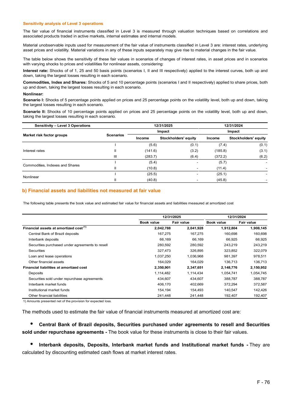 F - 76 Sensitivity analysis of Level 3 operations The fair value of financial instruments classified in Level 3 is measured through valuation techniques based on correlations and associated products traded in active markets, internal estimates and internal models. Material unobservable inputs used for measurement of the fair value of instruments classified in Level 3 are: interest rates, underlying asset prices and volatility. Material variations in any of these inputs separately may give rise to material changes in the fair value. The table below shows the sensitivity of these fair values in scenarios of changes of interest rates, in asset prices and in scenarios with varying shocks to prices and volatilities for nonlinear assets, considering: Interest rate: Shocks of of 1, 25 and 50 basis points (scenarios I, II and III respectively) applied to the interest curves, both up and down, taking the largest losses resulting in each scenario. Commodities, Index and Shares: Shocks of 5 and 10 percentage points (scenarios I and II respectively) applied to share prices, both up and down, taking the largest losses resulting in each scenario. Nonlinear: Scenario I: Shocks of 5 percentage points applied on prices and 25 percentage points on the volatility level, both up and down, taking the largest losses resulting in each scenario. Scenario II: Shocks of 10 percentage points applied on prices and 25 percentage points on the volatility level, both up and down, taking the largest losses resulting in each scenario. Sensitivity – Level 3 Operations 12/31/2025 12/31/2024 Market risk factor groups Scenarios Impact Impact Income Stockholders' equity Income Stockholders' equity Interest rates I (5.6) (0.1) (7.4) (0.1) II (141.6) (3.2) (185.8) (3.1) III (283.7) (6.4) (372.2) (6.2) Commodities, Indexes and Shares I (5.4) - (5.7) - II (10.8) - (11.4) - Nonlinear I (25.5) - (25.1) - II (40.8) - (45.8) - b) Financial assets and liabilities not measured at fair value The following table presents the book value and estimated fair value for financial assets and liabilities measured at amortized cost 12/31/2025 12/31/2024 Book value Fair value Book value Fair value Financial assets at amortized cost (1) 2,042,788 2,041,928 1,912,804 1,908,145 Central Bank of Brazil deposits 167,275 167,275 160,698 160,698 Interbank deposits 66,169 66,169 66,925 66,925 Securities purchased under agreements to resell 280,592 280,592 243,219 243,219 Securities 327,473 326,895 323,852 322,079 Loan and lease operations 1,037,250 1,036,968 981,397 978,511 Other financial assets 164,029 164,029 136,713 136,713 Financial liabilities at amortized cost 2,350,901 2,347,651 2,148,776 2,150,952 Deposits 1,114,482 1,114,434 1,054,741 1,054,745 Securities sold under repurchase agreements 434,607 434,607 388,787 388,787 Interbank market funds 406,170 402,669 372,294 372,587 Institutional market funds 154,194 154,493 140,547 142,426 Other financial liabilities 241,448 241,448 192,407 192,407 1) Amounts presented net of the provision for expected loss. The methods used to estimate the fair value of financial instruments measured at amortized cost are: • Central Bank of Brazil deposits, Securities purchased under agreements to resell and Securities sold under repurchase agreements - The book value for these instruments is close to their fair values. • Interbank deposits, Deposits, lnterbank market funds and lnstitutional market funds - They are calculated by discounting estimated cash flows at market interest rates.