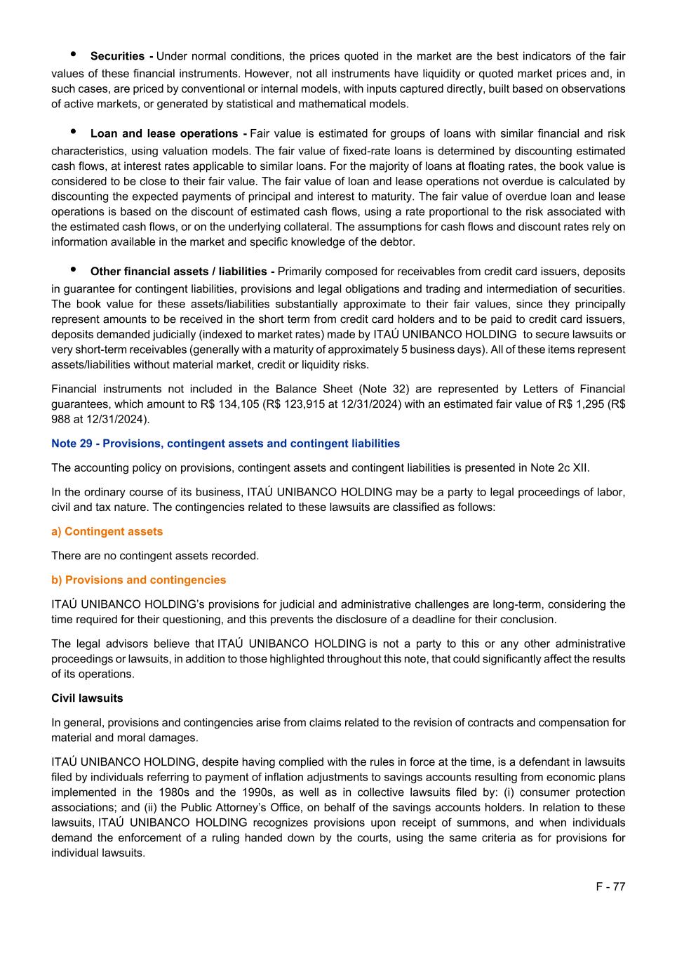 F - 77 • Securities - Under normal conditions, the prices quoted in the market are the best indicators of the fair values of these financial instruments. However, not all instruments have liquidity or quoted market prices and, in such cases, are priced by conventional or internal models, with inputs captured directly, built based on observations of active markets, or generated by statistical and mathematical models. • Loan and lease operations - Fair value is estimated for groups of loans with similar financial and risk characteristics, using valuation models. The fair value of fixed-rate loans is determined by discounting estimated cash flows, at interest rates applicable to similar loans. For the majority of loans at floating rates, the book value is considered to be close to their fair value. The fair value of loan and lease operations not overdue is calculated by discounting the expected payments of principal and interest to maturity. The fair value of overdue loan and lease operations is based on the discount of estimated cash flows, using a rate proportional to the risk associated with the estimated cash flows, or on the underlying collateral. The assumptions for cash flows and discount rates rely on information available in the market and specific knowledge of the debtor. • Other financial assets / liabilities - Primarily composed for receivables from credit card issuers, deposits in guarantee for contingent liabilities, provisions and legal obligations and trading and intermediation of securities. The book value for these assets/liabilities substantially approximate to their fair values, since they principally represent amounts to be received in the short term from credit card holders and to be paid to credit card issuers, deposits demanded judicially (indexed to market rates) made by ITAÚ UNIBANCO HOLDING to secure lawsuits or very short-term receivables (generally with a maturity of approximately 5 business days). All of these items represent assets/liabilities without material market, credit or liquidity risks. Financial instruments not included in the Balance Sheet (Note 32) are represented by Letters of Financial guarantees, which amount to R$ 134,105 (R$ 123,915 at 12/31/2024) with an estimated fair value of R$ 1,295 (R$ 988 at 12/31/2024). Note 29 - Provisions, contingent assets and contingent liabilities The accounting policy on provisions, contingent assets and contingent liabilities is presented in Note 2c XII. In the ordinary course of its business, ITAÚ UNIBANCO HOLDING may be a party to legal proceedings of labor, civil and tax nature. The contingencies related to these lawsuits are classified as follows: a) Contingent assets There are no contingent assets recorded. b) Provisions and contingencies ITAÚ UNIBANCO HOLDING’s provisions for judicial and administrative challenges are long-term, considering the time required for their questioning, and this prevents the disclosure of a deadline for their conclusion. The legal advisors believe that ITAÚ UNIBANCO HOLDING is not a party to this or any other administrative proceedings or lawsuits, in addition to those highlighted throughout this note, that could significantly affect the results of its operations. Civil lawsuits In general, provisions and contingencies arise from claims related to the revision of contracts and compensation for material and moral damages. ITAÚ UNIBANCO HOLDING, despite having complied with the rules in force at the time, is a defendant in lawsuits filed by individuals referring to payment of inflation adjustments to savings accounts resulting from economic plans implemented in the 1980s and the 1990s, as well as in collective lawsuits filed by: (i) consumer protection associations; and (ii) the Public Attorney’s Office, on behalf of the savings accounts holders. In relation to these lawsuits, ITAÚ UNIBANCO HOLDING recognizes provisions upon receipt of summons, and when individuals demand the enforcement of a ruling handed down by the courts, using the same criteria as for provisions for individual lawsuits.