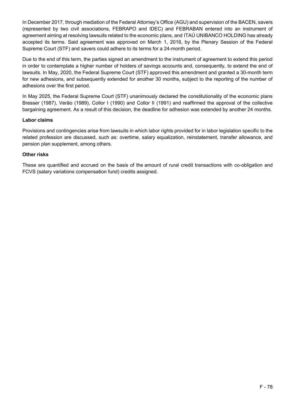 F - 78 In December 2017, through mediation of the Federal Attorney’s Office (AGU) and supervision of the BACEN, savers (represented by two civil associations, FEBRAPO and IDEC) and FEBRABAN entered into an instrument of agreement aiming at resolving lawsuits related to the economic plans, and ITAÚ UNIBANCO HOLDING has already accepted its terms. Said agreement was approved on March 1, 2018, by the Plenary Session of the Federal Supreme Court (STF) and savers could adhere to its terms for a 24-month period. Due to the end of this term, the parties signed an amendment to the instrument of agreement to extend this period in order to contemplate a higher number of holders of savings accounts and, consequently, to extend the end of lawsuits. In May, 2020, the Federal Supreme Court (STF) approved this amendment and granted a 30-month term for new adhesions, and subsequently extended for another 30 months, subject to the reporting of the number of adhesions over the first period. In May 2025, the Federal Supreme Court (STF) unanimously declared the constitutionality of the economic plans Bresser (1987), Verão (1989), Collor I (1990) and Collor II (1991) and reaffirmed the approval of the collective bargaining agreement. As a result of this decision, the deadline for adhesion was extended by another 24 months. Labor claims Provisions and contingencies arise from lawsuits in which labor rights provided for in labor legislation specific to the related profession are discussed, such as: overtime, salary equalization, reinstatement, transfer allowance, and pension plan supplement, among others. Other risks These are quantified and accrued on the basis of the amount of rural credit transactions with co-obligation and FCVS (salary variations compensation fund) credits assigned.