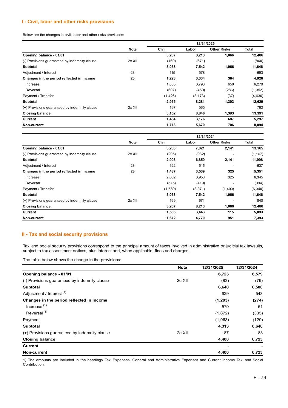 F - 79 I - Civil, labor and other risks provisions Below are the changes in civil, labor and other risks provisions: 12/31/2025 Note Civil Labor Other Risks Total Opening balance - 01/01 3,207 8,213 1,066 12,486 (-) Provisions guaranteed by indemnity clause 2c XII (169) (671) - (840) Subtotal 3,038 7,542 1,066 11,646 Adjustment / Interest 23 115 578 - 693 Changes in the period reflected in income 23 1,228 3,334 364 4,926 Increase 1,835 3,793 650 6,278 Reversal (607) (459) (286) (1,352) Payment / Transfer (1,426) (3,173) (37) (4,636) Subtotal 2,955 8,281 1,393 12,629 (+) Provisions guaranteed by indemnity clause 2c XII 197 565 - 762 Closing balance 3,152 8,846 1,393 13,391 Current 1,434 3,176 687 5,297 Non-current 1,718 5,670 706 8,094 12/31/2024 Note Civil Labor Other Risks Total Opening balance - 01/01 3,203 7,821 2,141 13,165 (-) Provisions guaranteed by indemnity clause 2c XII (205) (962) - (1,167) Subtotal 2,998 6,859 2,141 11,998 Adjustment / Interest 23 122 515 - 637 Changes in the period reflected in income 23 1,487 3,539 325 5,351 Increase 2,062 3,958 325 6,345 Reversal (575) (419) - (994) Payment / Transfer (1,569) (3,371) (1,400) (6,340) Subtotal 3,038 7,542 1,066 11,646 (+) Provisions guaranteed by indemnity clause 2c XII 169 671 - 840 Closing balance 3,207 8,213 1,066 12,486 Current 1,535 3,443 115 5,093 Non-current 1,672 4,770 951 7,393 II - Tax and social security provisions Tax and social security provisions correspond to the principal amount of taxes involved in administrative or judicial tax lawsuits, subject to tax assessment notices, plus interest and, when applicable, fines and charges. The table below shows the change in the provisions: Note 12/31/2025 12/31/2024 Opening balance - 01/01 6,723 6,579 (-) Provisions guaranteed by indemnity clause 2c XII (83) (79) Subtotal 6,640 6,500 Adjustment / Interest (1) 929 543 Changes in the period reflected in income (1,293) (274) Increase (1) 579 61 Reversal (1) (1,872) (335) Payment (1,963) (129) Subtotal 4,313 6,640 (+) Provisions guaranteed by indemnity clause 2c XII 87 83 Closing balance 4,400 6,723 Current - - Non-current 4,400 6,723 1) The amounts are included in the headings Tax Expenses, General and Administrative Expenses and Current Income Tax and Social Contribution.