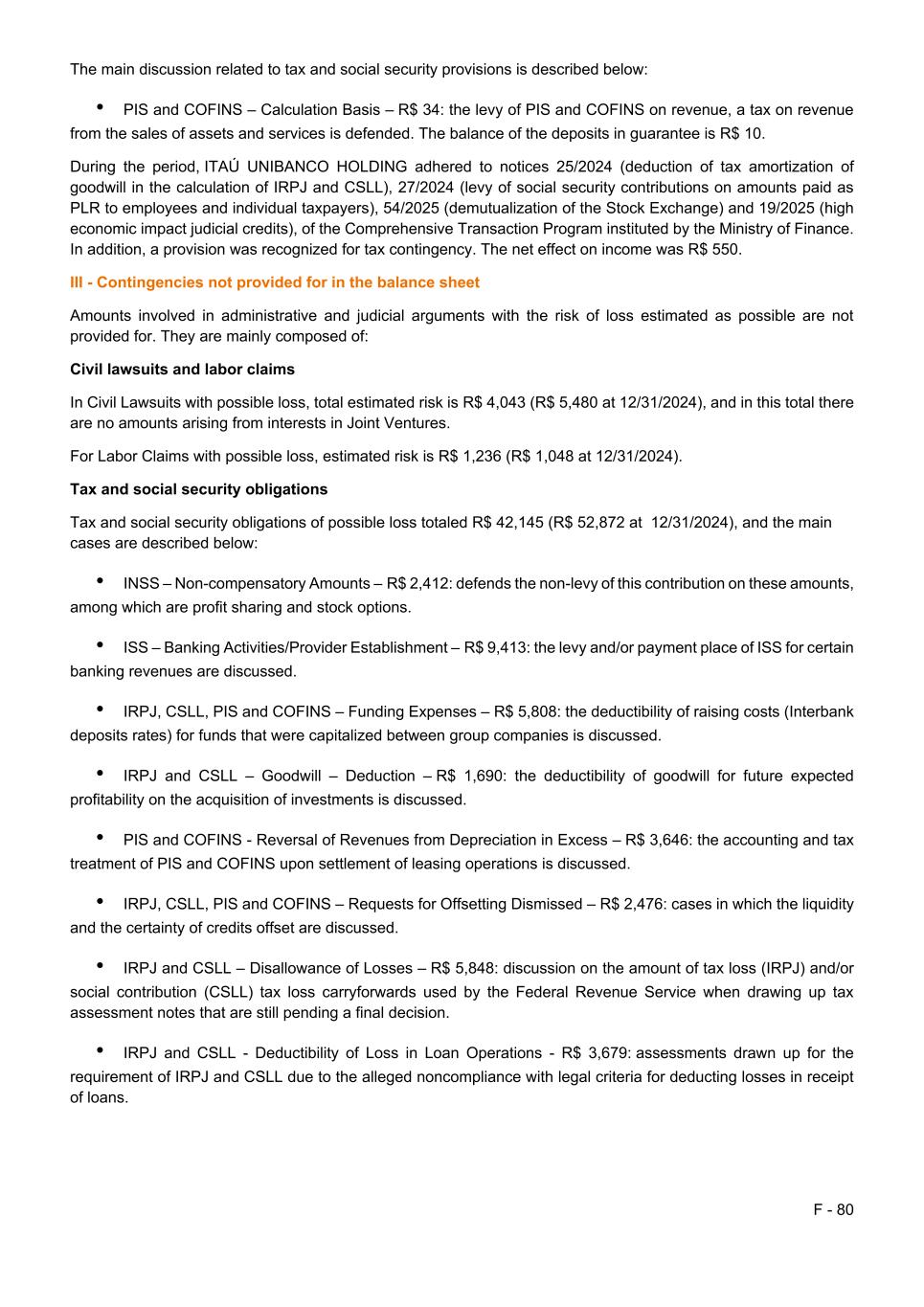 F - 80 The main discussion related to tax and social security provisions is described below: • PIS and COFINS – Calculation Basis – R$ 34: the levy of PIS and COFINS on revenue, a tax on revenue from the sales of assets and services is defended. The balance of the deposits in guarantee is R$ 10. During the period, ITAÚ UNIBANCO HOLDING adhered to notices 25/2024 (deduction of tax amortization of goodwill in the calculation of IRPJ and CSLL), 27/2024 (levy of social security contributions on amounts paid as PLR to employees and individual taxpayers), 54/2025 (demutualization of the Stock Exchange) and 19/2025 (high economic impact judicial credits), of the Comprehensive Transaction Program instituted by the Ministry of Finance. In addition, a provision was recognized for tax contingency. The net effect on income was R$ 550. III - Contingencies not provided for in the balance sheet Amounts involved in administrative and judicial arguments with the risk of loss estimated as possible are not provided for. They are mainly composed of: Civil lawsuits and labor claims In Civil Lawsuits with possible loss, total estimated risk is R$ 4,043 (R$ 5,480 at 12/31/2024), and in this total there are no amounts arising from interests in Joint Ventures. For Labor Claims with possible loss, estimated risk is R$ 1,236 (R$ 1,048 at 12/31/2024). Tax and social security obligations Tax and social security obligations of possible loss totaled R$ 42,145 (R$ 52,872 at 12/31/2024), and the main cases are described below: • INSS – Non-compensatory Amounts – R$ 2,412: defends the non-levy of this contribution on these amounts, among which are profit sharing and stock options. • ISS – Banking Activities/Provider Establishment – R$ 9,413: the levy and/or payment place of ISS for certain banking revenues are discussed. • IRPJ, CSLL, PIS and COFINS – Funding Expenses – R$ 5,808: the deductibility of raising costs (Interbank deposits rates) for funds that were capitalized between group companies is discussed. • IRPJ and CSLL – Goodwill – Deduction – R$ 1,690: the deductibility of goodwill for future expected profitability on the acquisition of investments is discussed. • PIS and COFINS - Reversal of Revenues from Depreciation in Excess – R$ 3,646: the accounting and tax treatment of PIS and COFINS upon settlement of leasing operations is discussed. • IRPJ, CSLL, PIS and COFINS – Requests for Offsetting Dismissed – R$ 2,476: cases in which the liquidity and the certainty of credits offset are discussed. • IRPJ and CSLL – Disallowance of Losses – R$ 5,848: discussion on the amount of tax loss (IRPJ) and/or social contribution (CSLL) tax loss carryforwards used by the Federal Revenue Service when drawing up tax assessment notes that are still pending a final decision. • IRPJ and CSLL - Deductibility of Loss in Loan Operations - R$ 3,679: assessments drawn up for the requirement of IRPJ and CSLL due to the alleged noncompliance with legal criteria for deducting losses in receipt of loans.