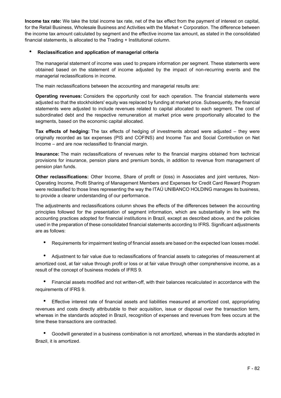 F - 82 Income tax rate: We take the total income tax rate, net of the tax effect from the payment of interest on capital, for the Retail Business, Wholesale Business and Activities with the Market + Corporation. The difference between the income tax amount calculated by segment and the effective income tax amount, as stated in the consolidated financial statements, is allocated to the Trading + Institutional column. • Reclassification and application of managerial criteria The managerial statement of income was used to prepare information per segment. These statements were obtained based on the statement of income adjusted by the impact of non-recurring events and the managerial reclassifications in income. The main reclassifications between the accounting and managerial results are: Operating revenues: Considers the opportunity cost for each operation. The financial statements were adjusted so that the stockholders' equity was replaced by funding at market price. Subsequently, the financial statements were adjusted to include revenues related to capital allocated to each segment. The cost of subordinated debt and the respective remuneration at market price were proportionally allocated to the segments, based on the economic capital allocated. Tax effects of hedging: The tax effects of hedging of investments abroad were adjusted – they were originally recorded as tax expenses (PIS and COFINS) and Income Tax and Social Contribution on Net Income – and are now reclassified to financial margin. Insurance: The main reclassifications of revenues refer to the financial margins obtained from technical provisions for insurance, pension plans and premium bonds, in addition to revenue from management of pension plan funds. Other reclassifications: Other Income, Share of profit or (loss) in Associates and joint ventures, Non- Operating Income, Profit Sharing of Management Members and Expenses for Credit Card Reward Program were reclassified to those lines representing the way the ITAÚ UNIBANCO HOLDING manages its business, to provide a clearer understanding of our performance. The adjustments and reclassifications column shows the effects of the differences between the accounting principles followed for the presentation of segment information, which are substantially in line with the accounting practices adopted for financial institutions in Brazil, except as described above, and the policies used in the preparation of these consolidated financial statements according to IFRS. Significant adjustments are as follows: • Requirements for impairment testing of financial assets are based on the expected loan losses model. • Adjustment to fair value due to reclassifications of financial assets to categories of measurement at amortized cost, at fair value through profit or loss or at fair value through other comprehensive income, as a result of the concept of business models of IFRS 9. • Financial assets modified and not written-off, with their balances recalculated in accordance with the requirements of IFRS 9. • Effective interest rate of financial assets and liabilities measured at amortized cost, appropriating revenues and costs directly attributable to their acquisition, issue or disposal over the transaction term, whereas in the standards adopted in Brazil, recognition of expenses and revenues from fees occurs at the time these transactions are contracted. • Goodwill generated in a business combination is not amortized, whereas in the standards adopted in Brazil, it is amortized.