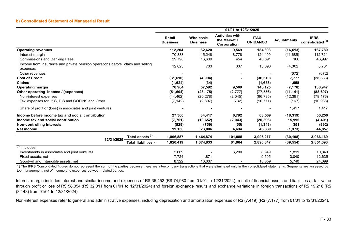 F - 83 b) Consolidated Statement of Managerial Result 01/01 to 12/31/2025 Retail Business Wholesale Business Activities with the Market + Corporation ITAÚ UNIBANCO Adjustments IFRS consolidated (1) Operating revenues 112,204 62,620 9,569 184,393 (16,613) 167,780 Interest margin 70,383 45,248 8,778 124,409 (11,685) 112,724 Commissions and Banking Fees 29,798 16,639 454 46,891 106 46,997 Income from insurance and private pension operations before claim and selling expenses 12,023 733 337 13,093 (4,362) 8,731 Other revenues - - - - (672) (672) Cost of Credit (31,616) (4,994) - (36,610) 7,777 (28,833) Claims (1,624) (34) - (1,658) 1,658 - Operating margin 78,964 57,592 9,569 146,125 (7,178) 138,947 Other operating income / (expenses) (51,604) (23,175) (2,777) (77,556) (11,141) (88,697) Non-interest expenses (44,462) (20,278) (2,045) (66,785) (12,391) (79,176) Tax expenses for ISS, PIS and COFINS and Other (7,142) (2,897) (732) (10,771) (167) (10,938) Share of profit or (loss) in associates and joint ventures - - - - 1,417 1,417 Income before income tax and social contribution 27,360 34,417 6,792 68,569 (18,319) 50,250 Income tax and social contribution (7,701) (10,652) (2,043) (20,396) 15,995 (4,401) Non-controlling interests (529) (759) (55) (1,343) 351 (992) Net income 19,130 23,006 4,694 46,830 (1,973) 44,857 12/31/2025 Total assets (*) - 1,896,887 1,464,874 101,085 3,096,277 (30,108) 3,066,169 Total liabilities - 1,820,419 1,374,833 61,964 2,890,647 (39,554) 2,851,093 (*) Includes: Investments in associates and joint ventures 2,669 - 6,280 8,949 1,891 10,840 Fixed assets, net 7,724 1,871 - 9,595 3,040 12,635 Goodwill and Intangible assets, net 8,322 10,037 - 18,359 5,740 24,099 1) The IFRS Consolidated figures do not represent the sum of the parties because there are intercompany transactions that were eliminated only in the consolidated statements. Segments are assessed by top management, net of income and expenses between related parties. Interest margin includes interest and similar income and expenses of R$ 35,452 (R$ 74,980 from 01/01 to 12/31/2024), result of financial assets and liabilities at fair value through profit or loss of R$ 58,054 (R$ 32,011 from 01/01 to 12/31/2024) and foreign exchange results and exchange variations in foreign transactions of R$ 19,218 (R$ (3,143) from 01/01 to 12/31/2024). Non-interest expenses refer to general and administrative expenses, including depreciation and amortization expenses of R$ (7,419) (R$ (7,177) from 01/01 to 12/31/2024).