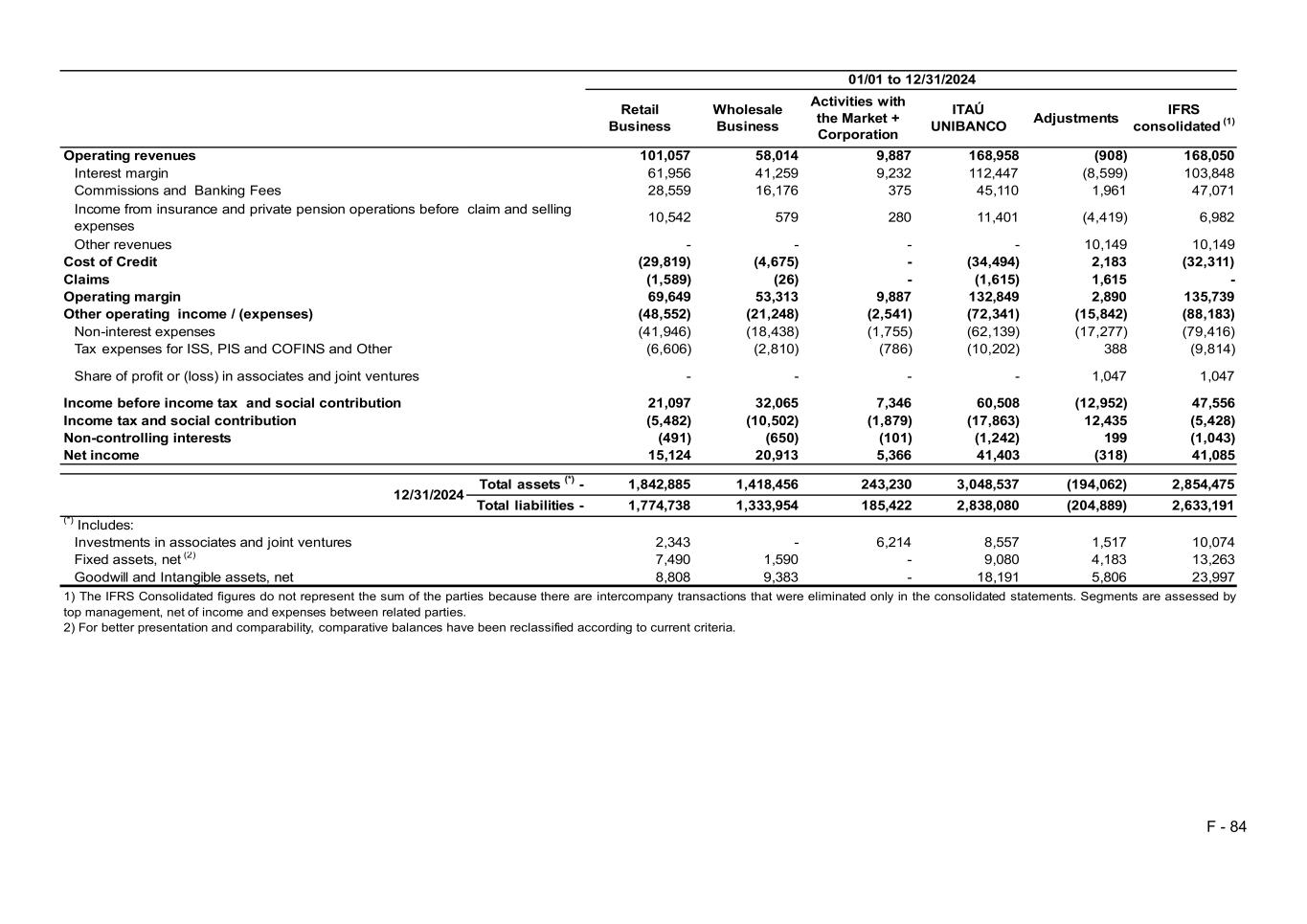 F - 84 01/01 to 12/31/2024 Retail Business Wholesale Business Activities with the Market + Corporation ITAÚ UNIBANCO Adjustments IFRS consolidated (1) Operating revenues 101,057 58,014 9,887 168,958 (908) 168,050 Interest margin 61,956 41,259 9,232 112,447 (8,599) 103,848 Commissions and Banking Fees 28,559 16,176 375 45,110 1,961 47,071 Income from insurance and private pension operations before claim and selling expenses 10,542 579 280 11,401 (4,419) 6,982 Other revenues - - - - 10,149 10,149 Cost of Credit (29,819) (4,675) - (34,494) 2,183 (32,311) Claims (1,589) (26) - (1,615) 1,615 - Operating margin 69,649 53,313 9,887 132,849 2,890 135,739 Other operating income / (expenses) (48,552) (21,248) (2,541) (72,341) (15,842) (88,183) Non-interest expenses (41,946) (18,438) (1,755) (62,139) (17,277) (79,416) Tax expenses for ISS, PIS and COFINS and Other (6,606) (2,810) (786) (10,202) 388 (9,814) Share of profit or (loss) in associates and joint ventures - - - - 1,047 1,047 Income before income tax and social contribution 21,097 32,065 7,346 60,508 (12,952) 47,556 Income tax and social contribution (5,482) (10,502) (1,879) (17,863) 12,435 (5,428) Non-controlling interests (491) (650) (101) (1,242) 199 (1,043) Net income 15,124 20,913 5,366 41,403 (318) 41,085 12/31/2024 Total assets (*) - 1,842,885 1,418,456 243,230 3,048,537 (194,062) 2,854,475 Total liabilities - 1,774,738 1,333,954 185,422 2,838,080 (204,889) 2,633,191 (*) Includes: Investments in associates and joint ventures 2,343 - 6,214 8,557 1,517 10,074 Fixed assets, net (2) 7,490 1,590 - 9,080 4,183 13,263 Goodwill and Intangible assets, net 8,808 9,383 - 18,191 5,806 23,997 1) The IFRS Consolidated figures do not represent the sum of the parties because there are intercompany transactions that were eliminated only in the consolidated statements. Segments are assessed by top management, net of income and expenses between related parties. 2) For better presentation and comparability, comparative balances have been reclassified according to current criteria.