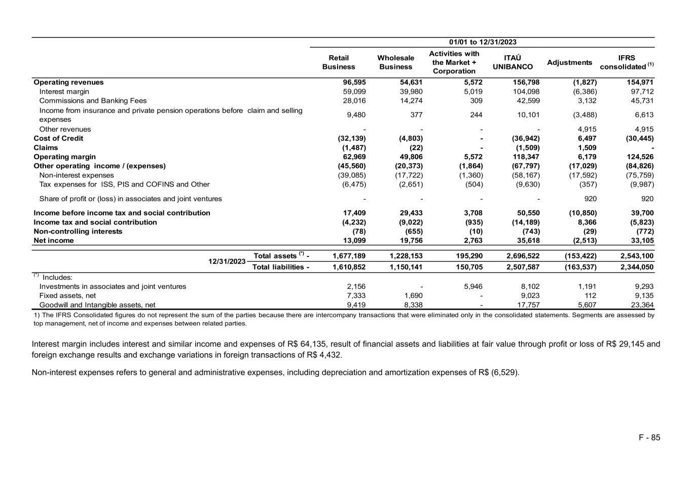 F - 85 01/01 to 12/31/2023 Retail Business Wholesale Business Activities with the Market + Corporation ITAÚ UNIBANCO Adjustments IFRS consolidated (1) Operating revenues 96,595 54,631 5,572 156,798 (1,827) 154,971 Interest margin 59,099 39,980 5,019 104,098 (6,386) 97,712 Commissions and Banking Fees 28,016 14,274 309 42,599 3,132 45,731 Income from insurance and private pension operations before claim and selling expenses 9,480 377 244 10,101 (3,488) 6,613 Other revenues - - - - 4,915 4,915 Cost of Credit (32,139) (4,803) - (36,942) 6,497 (30,445) Claims (1,487) (22) - (1,509) 1,509 - Operating margin 62,969 49,806 5,572 118,347 6,179 124,526 Other operating income / (expenses) (45,560) (20,373) (1,864) (67,797) (17,029) (84,826) Non-interest expenses (39,085) (17,722) (1,360) (58,167) (17,592) (75,759) Tax expenses for ISS, PIS and COFINS and Other (6,475) (2,651) (504) (9,630) (357) (9,987) Share of profit or (loss) in associates and joint ventures - - - - 920 920 Income before income tax and social contribution 17,409 29,433 3,708 50,550 (10,850) 39,700 Income tax and social contribution (4,232) (9,022) (935) (14,189) 8,366 (5,823) Non-controlling interests (78) (655) (10) (743) (29) (772) Net income 13,099 19,756 2,763 35,618 (2,513) 33,105 12/31/2023 Total assets (*) - 1,677,189 1,228,153 195,290 2,696,522 (153,422) 2,543,100 Total liabilities - 1,610,852 1,150,141 150,705 2,507,587 (163,537) 2,344,050 (*) Includes: Investments in associates and joint ventures 2,156 - 5,946 8,102 1,191 9,293 Fixed assets, net 7,333 1,690 - 9,023 112 9,135 Goodwill and Intangible assets, net 9,419 8,338 - 17,757 5,607 23,364 1) The IFRS Consolidated figures do not represent the sum of the parties because there are intercompany transactions that were eliminated only in the consolidated statements. Segments are assessed by top management, net of income and expenses between related parties. Interest margin includes interest and similar income and expenses of R$ 64,135, result of financial assets and liabilities at fair value through profit or loss of R$ 29,145 and foreign exchange results and exchange variations in foreign transactions of R$ 4,432. Non-interest expenses refers to general and administrative expenses, including depreciation and amortization expenses of R$ (6,529).
