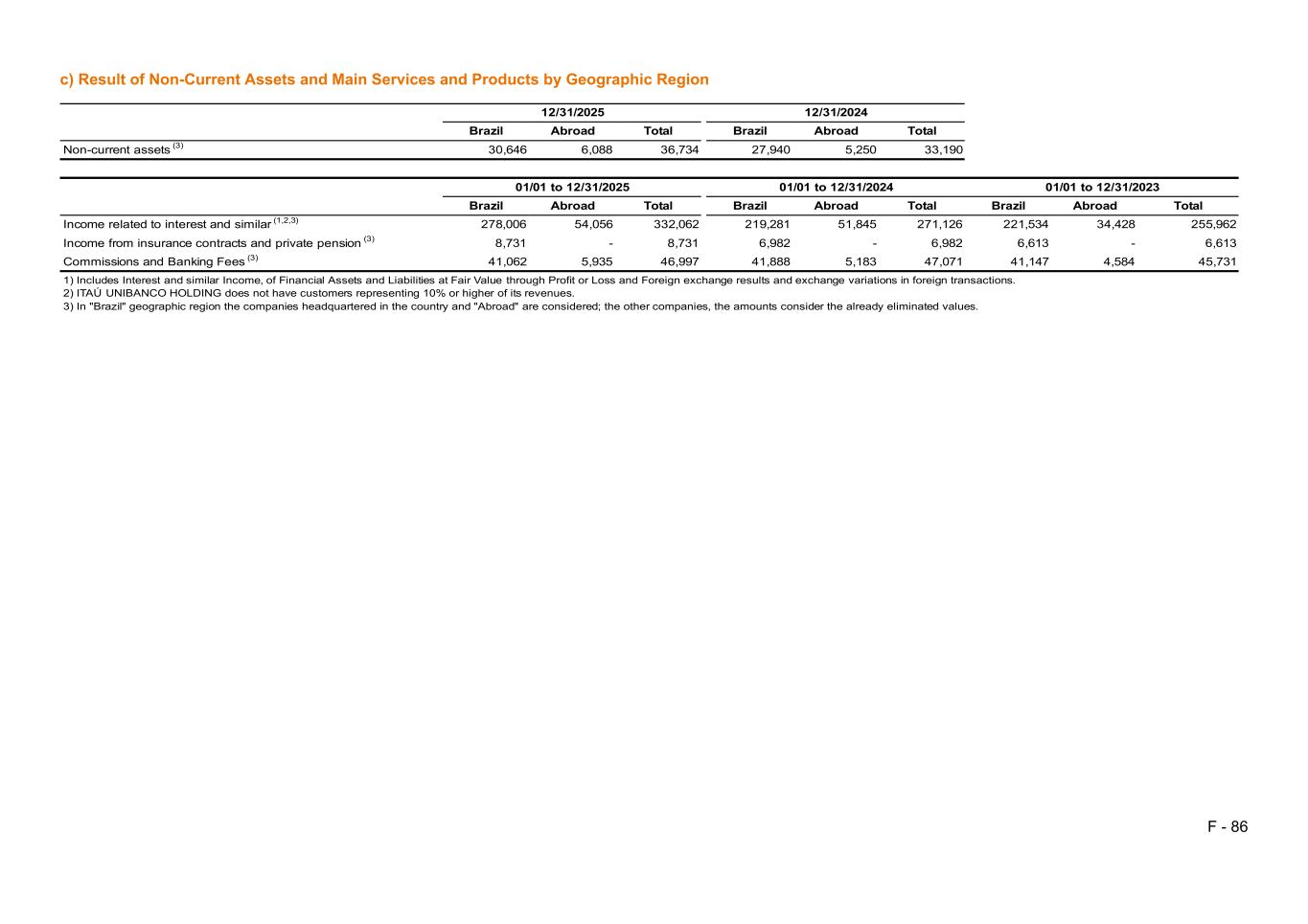 F - 86 c) Result of Non-Current Assets and Main Services and Products by Geographic Region 12/31/2025 12/31/2024 Brazil Abroad Total Brazil Abroad Total Non-current assets (3) 30,646 6,088 36,734 27,940 5,250 33,190 01/01 to 12/31/2025 01/01 to 12/31/2024 01/01 to 12/31/2023 Brazil Abroad Total Brazil Abroad Total Brazil Abroad Total Income related to interest and similar (1,2,3) 278,006 54,056 332,062 219,281 51,845 271,126 221,534 34,428 255,962 Income from insurance contracts and private pension (3) 8,731 - 8,731 6,982 - 6,982 6,613 - 6,613 Commissions and Banking Fees (3) 41,062 5,935 46,997 41,888 5,183 47,071 41,147 4,584 45,731 1) Includes Interest and similar Income, of Financial Assets and Liabilities at Fair Value through Profit or Loss and Foreign exchange results and exchange variations in foreign transactions. 2) ITAÚ UNIBANCO HOLDING does not have customers representing 10% or higher of its revenues. 3) In "Brazil" geographic region the companies headquartered in the country and "Abroad" are considered; the other companies, the amounts consider the already eliminated values.