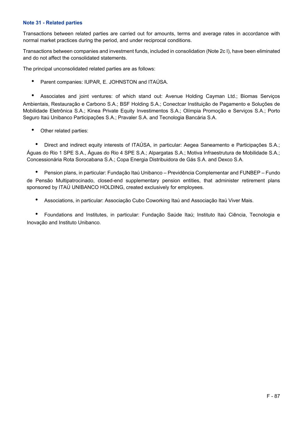 F - 87 Note 31 - Related parties Transactions between related parties are carried out for amounts, terms and average rates in accordance with normal market practices during the period, and under reciprocal conditions. Transactions between companies and investment funds, included in consolidation (Note 2c I), have been eliminated and do not affect the consolidated statements. The principal unconsolidated related parties are as follows: • Parent companies: IUPAR, E. JOHNSTON and ITAÚSA. • Associates and joint ventures: of which stand out: Avenue Holding Cayman Ltd.; Biomas Serviços Ambientais, Restauração e Carbono S.A.; BSF Holding S.A.; Conectcar Instituição de Pagamento e Soluções de Mobilidade Eletrônica S.A.; Kinea Private Equity Investimentos S.A.; Olímpia Promoção e Serviços S.A.; Porto Seguro Itaú Unibanco Participações S.A.; Pravaler S.A. and Tecnologia Bancária S.A. • Other related parties: • Direct and indirect equity interests of ITAÚSA, in particular: Aegea Saneamento e Participações S.A.; Águas do Rio 1 SPE S.A., Águas do Rio 4 SPE S.A.; Alpargatas S.A.; Motiva Infraestrutura de Mobilidade S.A.; Concessionária Rota Sorocabana S.A.; Copa Energia Distribuidora de Gás S.A. and Dexco S.A. • Pension plans, in particular: Fundação Itaú Unibanco – Previdência Complementar and FUNBEP – Fundo de Pensão Multipatrocinado, closed-end supplementary pension entities, that administer retirement plans sponsored by ITAÚ UNIBANCO HOLDING, created exclusively for employees. • Associations, in particular: Associação Cubo Coworking Itaú and Associação Itaú Viver Mais. • Foundations and Institutes, in particular: Fundação Saúde Itaú; Instituto Itaú Ciência, Tecnologia e Inovação and Instituto Unibanco.