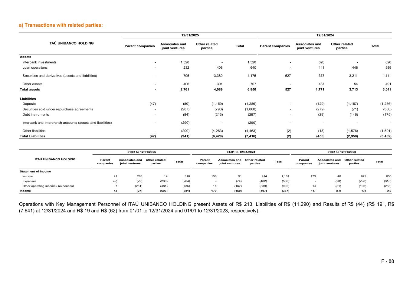 F - 88 a) Transactions with related parties: ITAÚ UNIBANCO HOLDING 12/31/2025 12/31/2024 Parent companies Associates and joint ventures Other related parties Total Parent companies Associates and joint ventures Other related parties Total Assets lnterbank investments - 1,328 - 1,328 - 820 - 820 Loan operations - 232 408 640 - 141 448 589 Securities and derivatives (assets and liabilities) - 795 3,380 4,175 527 373 3,211 4,111 Other assets - 406 301 707 - 437 54 491 Total assets - 2,761 4,089 6,850 527 1,771 3,713 6,011 Liabilities Deposits (47) (80) (1,159) (1,286) - (129) (1,157) (1,286) Securities sold under repurchase agreements - (287) (793) (1,080) - (279) (71) (350) Debt instruments - (84) (213) (297) - (29) (146) (175) lnterbank and lnterbranch accounts (assets and liabilities) - (290) - (290) - - - - Other liabilities - (200) (4,263) (4,463) (2) (13) (1,576) (1,591) Total Liabilities (47) (941) (6,428) (7,416) (2) (450) (2,950) (3,402) ITAÚ UNIBANCO HOLDING 01/01 to 12/31/2025 01/01 to 12/31/2024 01/01 to 12/31/2023 Parent companies Associates and joint ventures Other related parties Total Parent companies Associates and joint ventures Other related parties Total Parent companies Associates and joint ventures Other related parties Total Statement of lncome lncome 41 263 14 318 156 91 914 1,161 173 48 629 850 Expenses (5) (29) (230) (264) - (74) (482) (556) - (20) (298) (318) Other operating income / (expenses) 7 (261) (481) (735) 14 (167) (839) (992) 14 (81) (196) (263) lncome 43 (27) (697) (681) 170 (150) (407) (387) 187 (53) 135 269 Operations with Key Management Personnel of ITAÚ UNIBANCO HOLDING present Assets of R$ 213, Liabilities of R$ (11,290) and Results of R$ (44) (R$ 191, R$ (7,641) at 12/31/2024 and R$ 19 and R$ (62) from 01/01 to 12/31/2024 and 01/01 to 12/31/2023, respectively).
