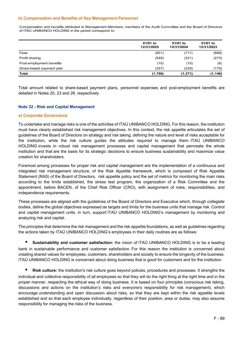 F - 89 b) Compensation and Benefits of Key Management Personnel Compensation and benefits attributed to Management Members, members of the Audit Committee and the Board of Directors of ITAÚ UNIBANCO HOLDING in the period correspond to: 01/01 to 12/31/2025 01/01 to 12/31/2024 01/01 to 12/31/2023 Fees (851) (711) (686) Profit sharing (548) (321) (275) Post-employment benefits (10) (10) (6) Share-based payment plan (357) (229) (179) Total (1,766) (1,271) (1,146) Total amount related to share-based payment plans, personnel expenses and post-employment benefits are detailed in Notes 20, 23 and 26, respectively. Note 32 - Risk and Capital Management a) Corporate Governance To undertake and manage risks is one of the activities of ITAÚ UNIBANCO HOLDING. For this reason, the institution must have clearly established risk management objectives. In this context, the risk appetite articulates the set of guidelines of the Board of Directors on strategy and risk taking, defining the nature and level of risks acceptable for the institution, while the risk culture guides the attitudes required to manage them. ITAÚ UNIBANCO HOLDING invests in robust risk management processes and capital management that permeate the whole institution and that are the basis for its strategic decisions to ensure business sustainability and maximize value creation for shareholders. Foremost among processes for proper risk and capital management are the implementation of a continuous and integrated risk management structure, of the Risk Appetite framework, which is composed of Risk Appetite Statement (RAS) of the Board of Directors, risk appetite policy and the set of metrics for monitoring the main risks according to the limits established, the stress test program, the organization of a Risk Committee and the appointment, before BACEN, of the Chief Risk Officer (CRO), with assignment of roles, responsibilities, and independence requirements. These processes are aligned with the guidelines of the Board of Directors and Executive which, through collegiate bodies, define the global objectives expressed as targets and limits for the business units that manage risk. Control and capital management units, in turn, support ITAÚ UNIBANCO HOLDING’s management by monitoring and analyzing risk and capital. The principles that determine the risk management and the risk appetite foundations, as well as guidelines regarding the actions taken by ITAÚ UNIBANCO HOLDING’s employees in their daily routines are as follows: • Sustainability and customer satisfaction: the vision of ITAÚ UNIBANCO HOLDING is to be a leading bank in sustainable performance and customer satisfaction. For this reason the institution is concerned about creating shared values for employees, customers, shareholders and society to ensure the longevity of the business. ITAÚ UNIBANCO HOLDING is concerned about doing business that is good for customers and for the institution. • Risk culture: the institution's risk culture goes beyond policies, procedures and processes. It strengths the individual and collective responsibility of all employees so that they will do the right thing at the right time and in the proper manner, respecting the ethical way of doing business. It is based on four principles (conscious risk taking, discussions and actions on the institution’s risks and everyone's responsibility for risk management), which encourage understanding and open discussion about risks, so that they are kept within the risk appetite levels established and so that each employee individually, regardless of their position, area or duties, may also assume responsibility for managing the risks of the business.