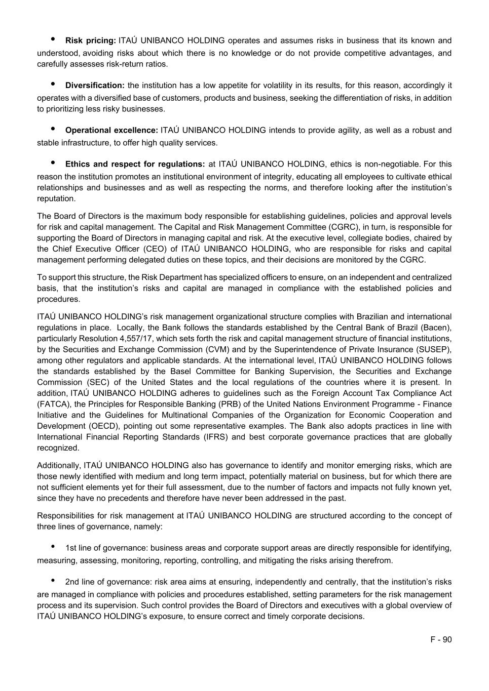 F - 90 • Risk pricing: ITAÚ UNIBANCO HOLDING operates and assumes risks in business that its known and understood, avoiding risks about which there is no knowledge or do not provide competitive advantages, and carefully assesses risk-return ratios. • Diversification: the institution has a low appetite for volatility in its results, for this reason, accordingly it operates with a diversified base of customers, products and business, seeking the differentiation of risks, in addition to prioritizing less risky businesses. • Operational excellence: ITAÚ UNIBANCO HOLDING intends to provide agility, as well as a robust and stable infrastructure, to offer high quality services. • Ethics and respect for regulations: at ITAÚ UNIBANCO HOLDING, ethics is non-negotiable. For this reason the institution promotes an institutional environment of integrity, educating all employees to cultivate ethical relationships and businesses and as well as respecting the norms, and therefore looking after the institution’s reputation. The Board of Directors is the maximum body responsible for establishing guidelines, policies and approval levels for risk and capital management. The Capital and Risk Management Committee (CGRC), in turn, is responsible for supporting the Board of Directors in managing capital and risk. At the executive level, collegiate bodies, chaired by the Chief Executive Officer (CEO) of ITAÚ UNIBANCO HOLDING, who are responsible for risks and capital management performing delegated duties on these topics, and their decisions are monitored by the CGRC. To support this structure, the Risk Department has specialized officers to ensure, on an independent and centralized basis, that the institution’s risks and capital are managed in compliance with the established policies and procedures. ITAÚ UNIBANCO HOLDING’s risk management organizational structure complies with Brazilian and international regulations in place. Locally, the Bank follows the standards established by the Central Bank of Brazil (Bacen), particularly Resolution 4,557/17, which sets forth the risk and capital management structure of financial institutions, by the Securities and Exchange Commission (CVM) and by the Superintendence of Private Insurance (SUSEP), among other regulators and applicable standards. At the international level, ITAÚ UNIBANCO HOLDING follows the standards established by the Basel Committee for Banking Supervision, the Securities and Exchange Commission (SEC) of the United States and the local regulations of the countries where it is present. In addition, ITAÚ UNIBANCO HOLDING adheres to guidelines such as the Foreign Account Tax Compliance Act (FATCA), the Principles for Responsible Banking (PRB) of the United Nations Environment Programme - Finance Initiative and the Guidelines for Multinational Companies of the Organization for Economic Cooperation and Development (OECD), pointing out some representative examples. The Bank also adopts practices in line with International Financial Reporting Standards (IFRS) and best corporate governance practices that are globally recognized. Additionally, ITAÚ UNIBANCO HOLDING also has governance to identify and monitor emerging risks, which are those newly identified with medium and long term impact, potentially material on business, but for which there are not sufficient elements yet for their full assessment, due to the number of factors and impacts not fully known yet, since they have no precedents and therefore have never been addressed in the past. Responsibilities for risk management at ITAÚ UNIBANCO HOLDING are structured according to the concept of three lines of governance, namely: • 1st line of governance: business areas and corporate support areas are directly responsible for identifying, measuring, assessing, monitoring, reporting, controlling, and mitigating the risks arising therefrom. • 2nd line of governance: risk area aims at ensuring, independently and centrally, that the institution’s risks are managed in compliance with policies and procedures established, setting parameters for the risk management process and its supervision. Such control provides the Board of Directors and executives with a global overview of ITAÚ UNIBANCO HOLDING’s exposure, to ensure correct and timely corporate decisions.